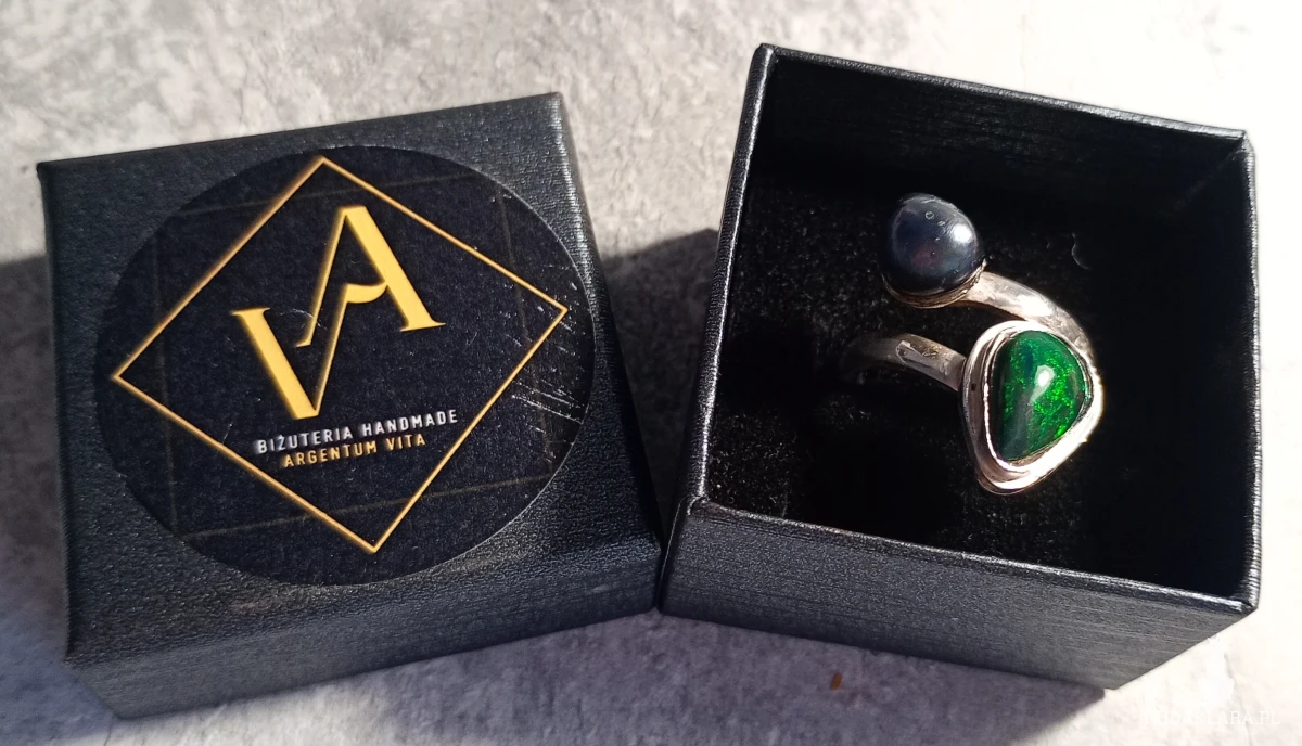 Idealne połączenie czarnego opalu z Etiopii o masie 2.55 ct z metaliczną perłą. Pierścionek jest regulowany. Obecne ustawienie to 15. Obrączka ma obwód 7 cm. Rozmiar ustawiam przed wysyłką.