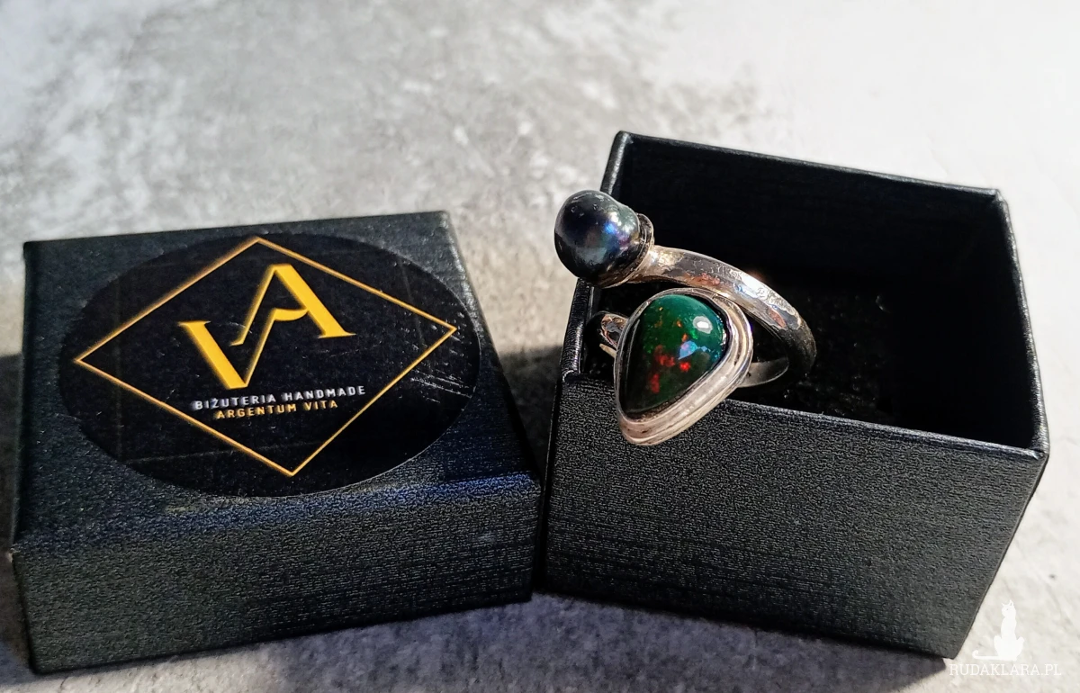 Srebrny ręcznie wykonany pierścionek z czarnym opalem i czarną perłą.
