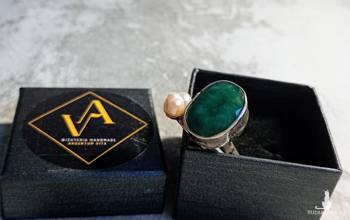 Srebrny ręcznie wykonany pierścionek z szmaragdem i barokową perłą.