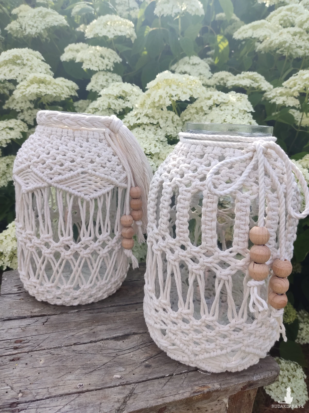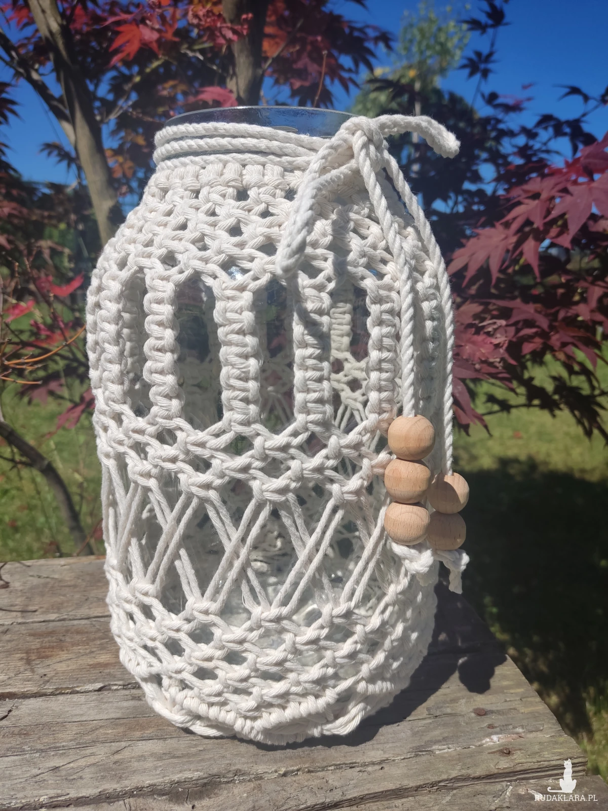 Ręcznie wykonany lampion wypleciony metodą makramy, wysokość lampionu 30 cm natomiast średnica podstawy 17 cm (słoik o pojemności 4 litrów) w kolorze naturalnym. W środku lampionu można umieścić świecę bądź lampki LED.