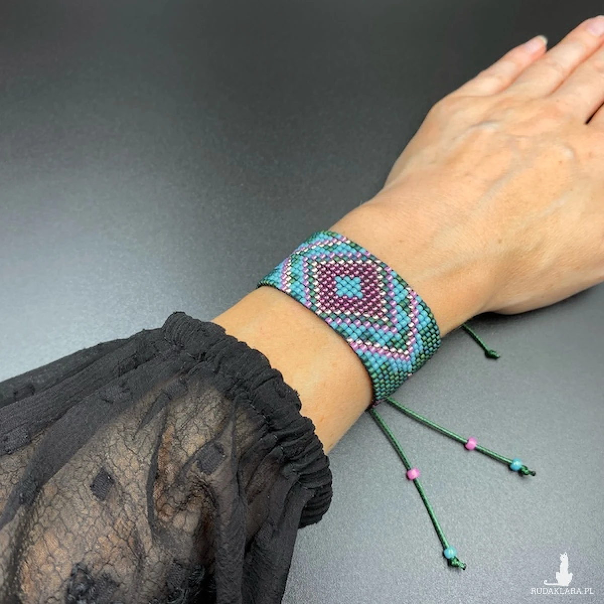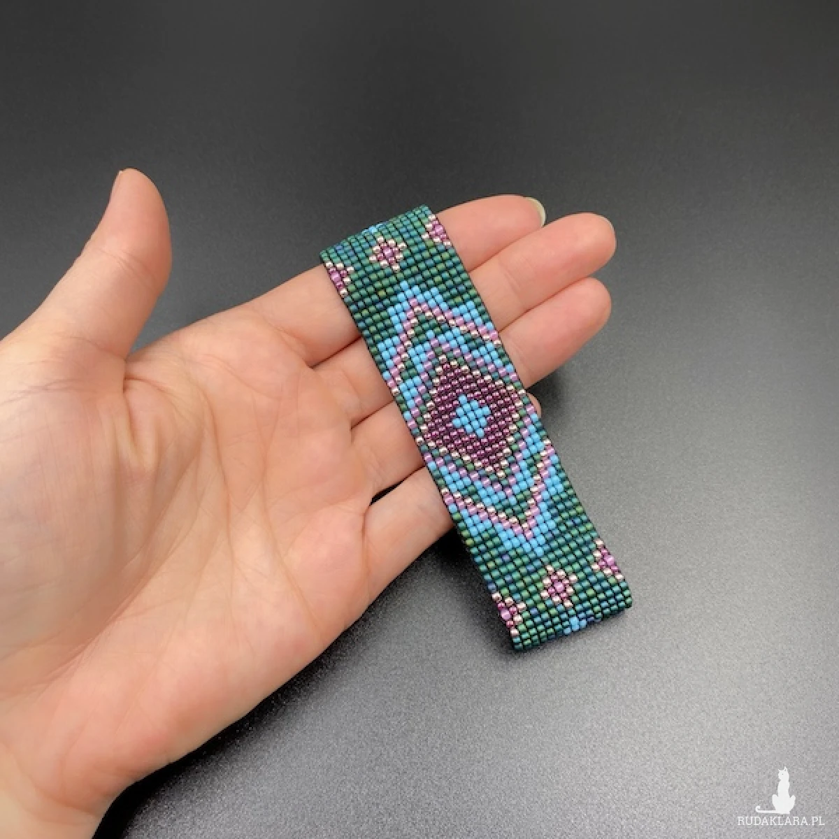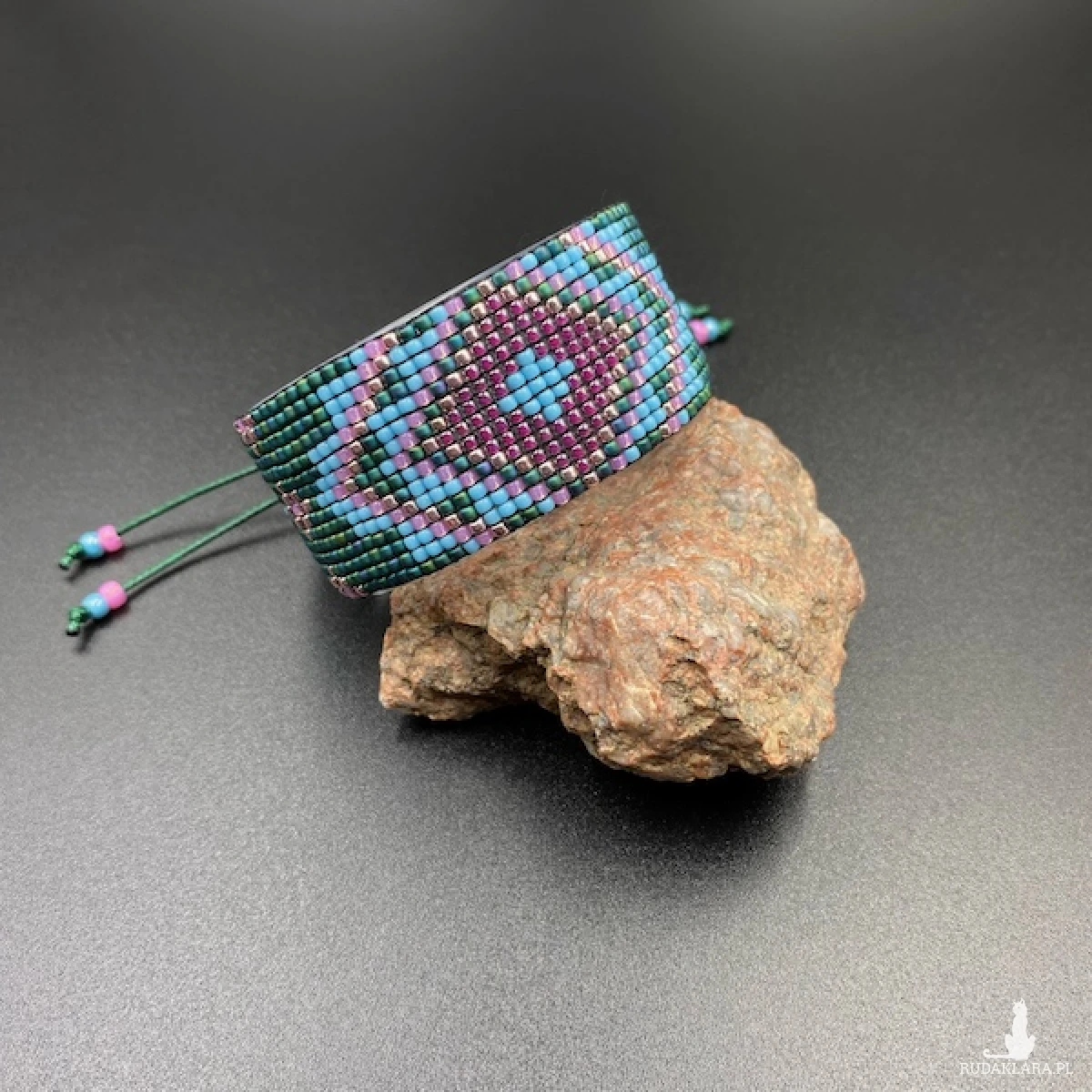 Bransoletka została utkana na krośnie z koralików Toho. Jest bardzo plastyczna i swobodnie układa się na nadgarstku.