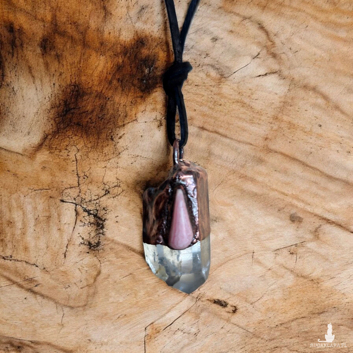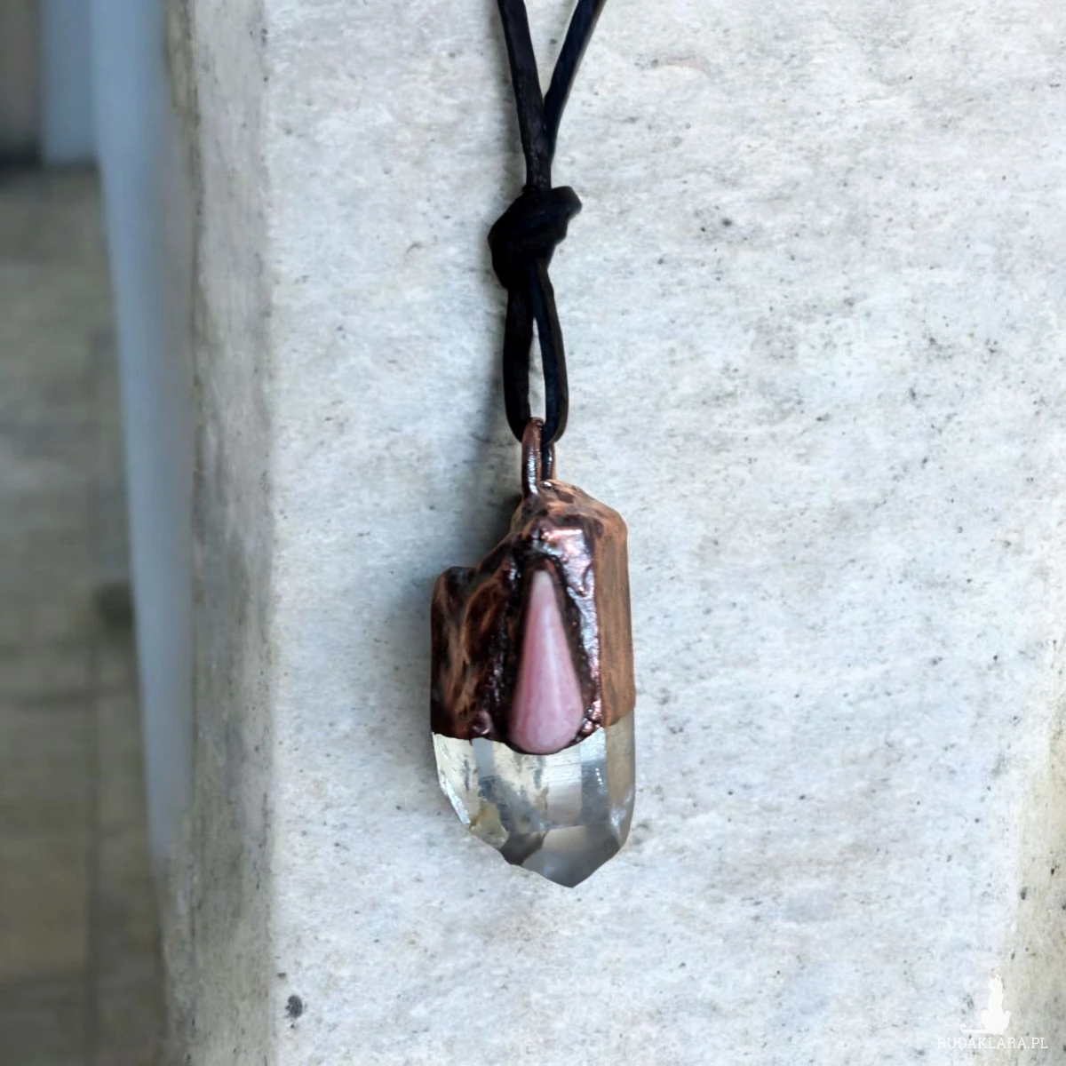 Delikatne połączenie czystej energii kryształu górskiego z ciepłą, różową barwą rodochrozytu tworzy amulet pełen lekkości, harmonii i emocjonalnego wsparcia. To piękny, otulony miedzią, talizman dla osób pragnących wzmocnić swoje serce, oczyścić emocje i przyciągnąć dobrą, łagodną energię.