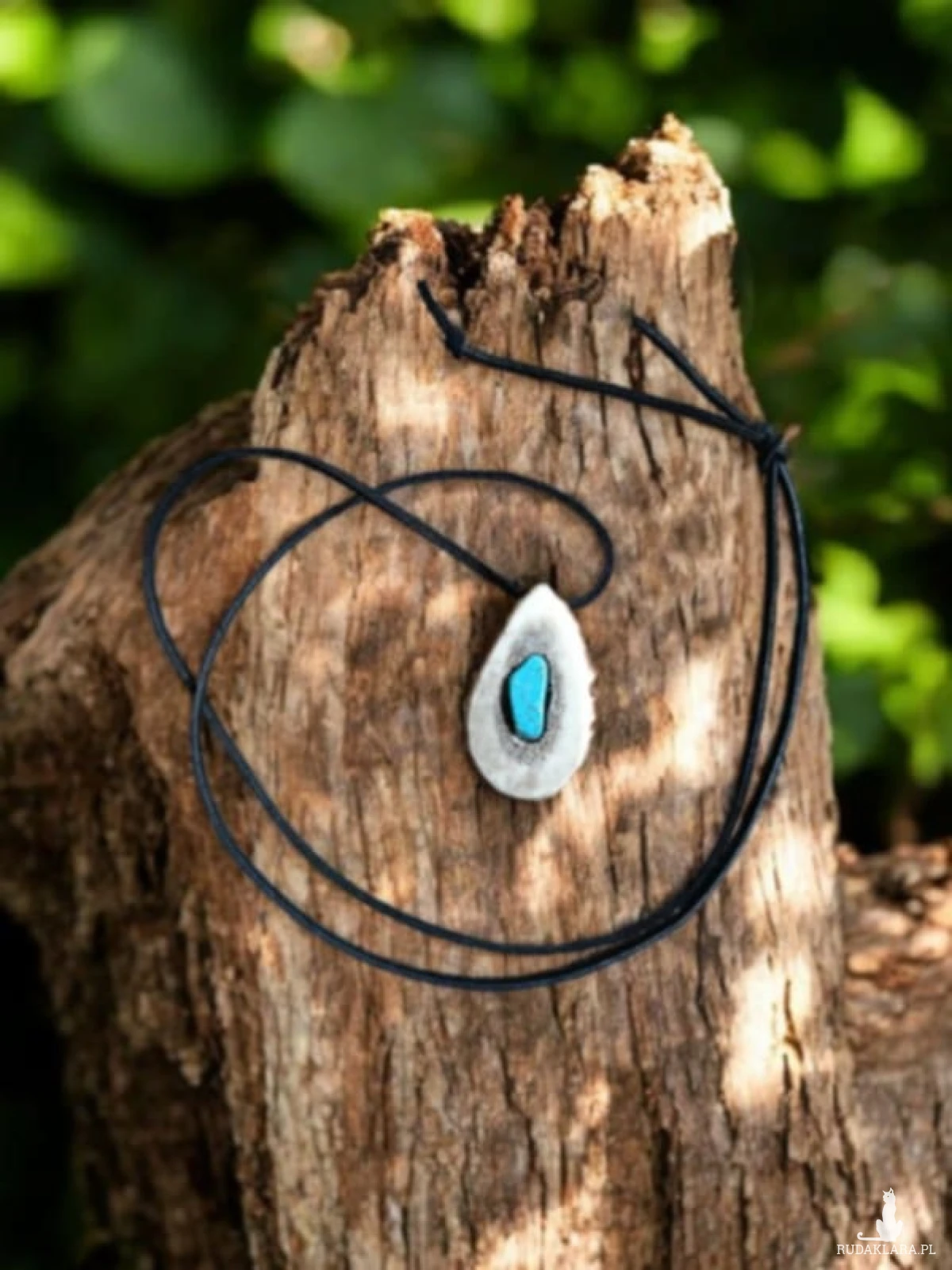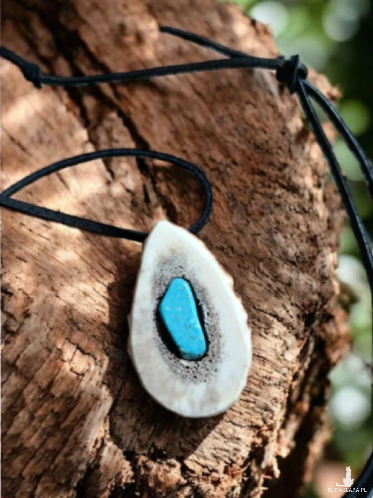 Ręcznie wykonany naszyjnik z naturalnego poroża jelenia, ozdobiony turkusowym kamieniem w centrum. Unikalna forma i organiczne materiały nadają mu wyjątkowego, leśnego charakteru. Idealny dla osób poszukujących biżuterii z duszą i bliskością natury.