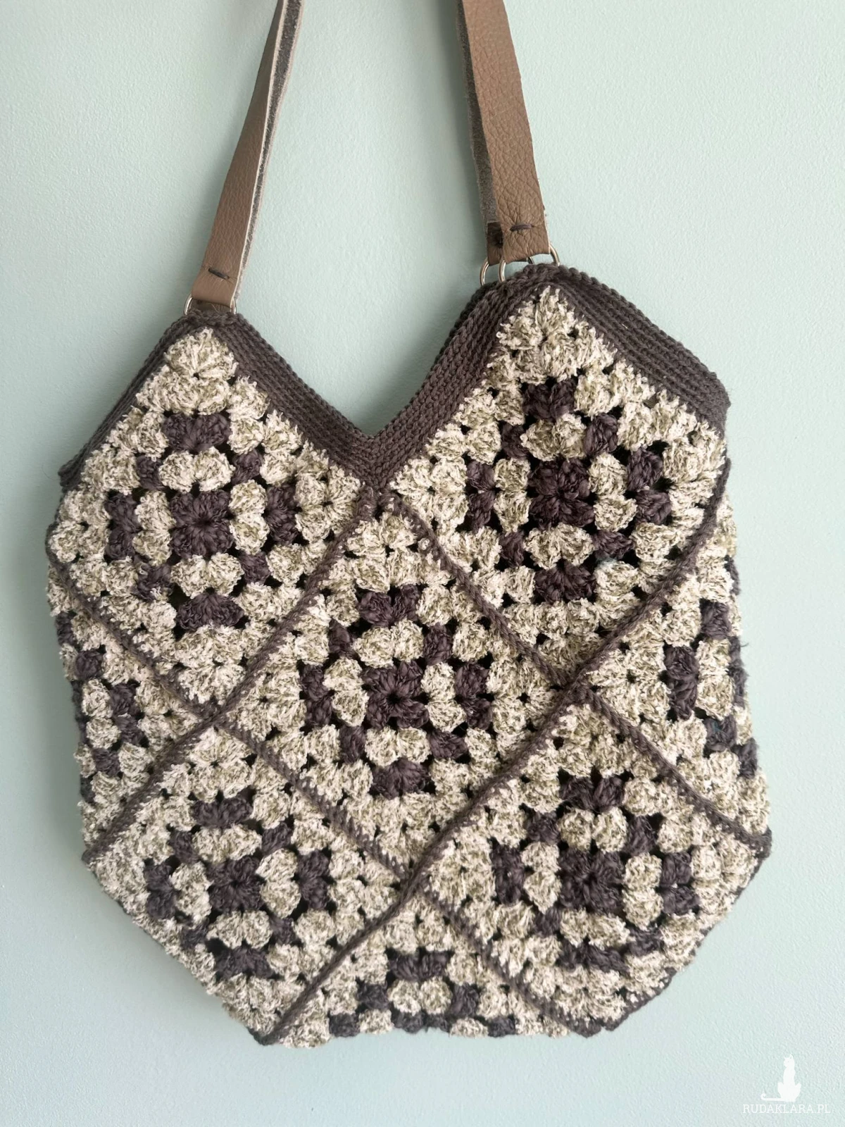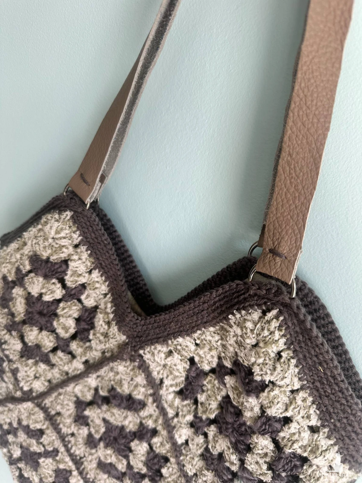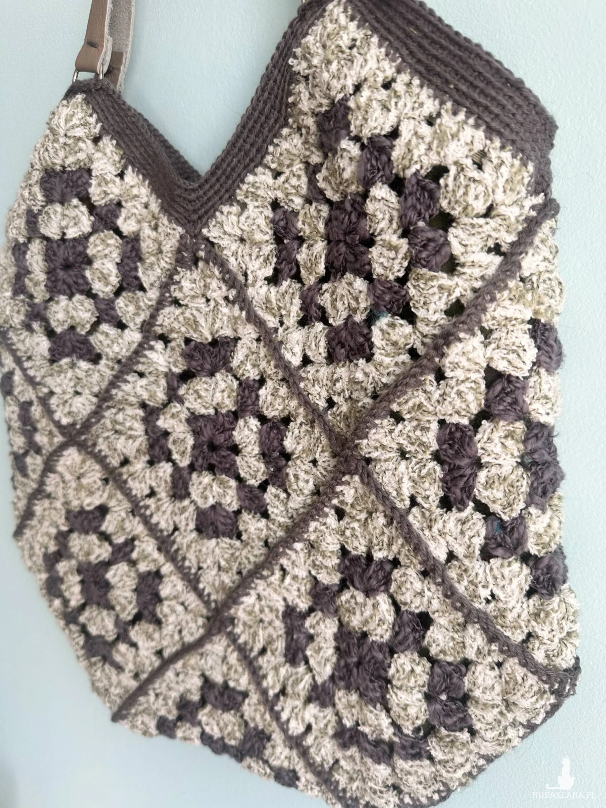 Torebka rękodzieło stworzona na szydełku, wewnątrz podszewka z kieszonką, noszona na ramieniu Rozmiar: szerokość 33 cm, wysokość 35cm.