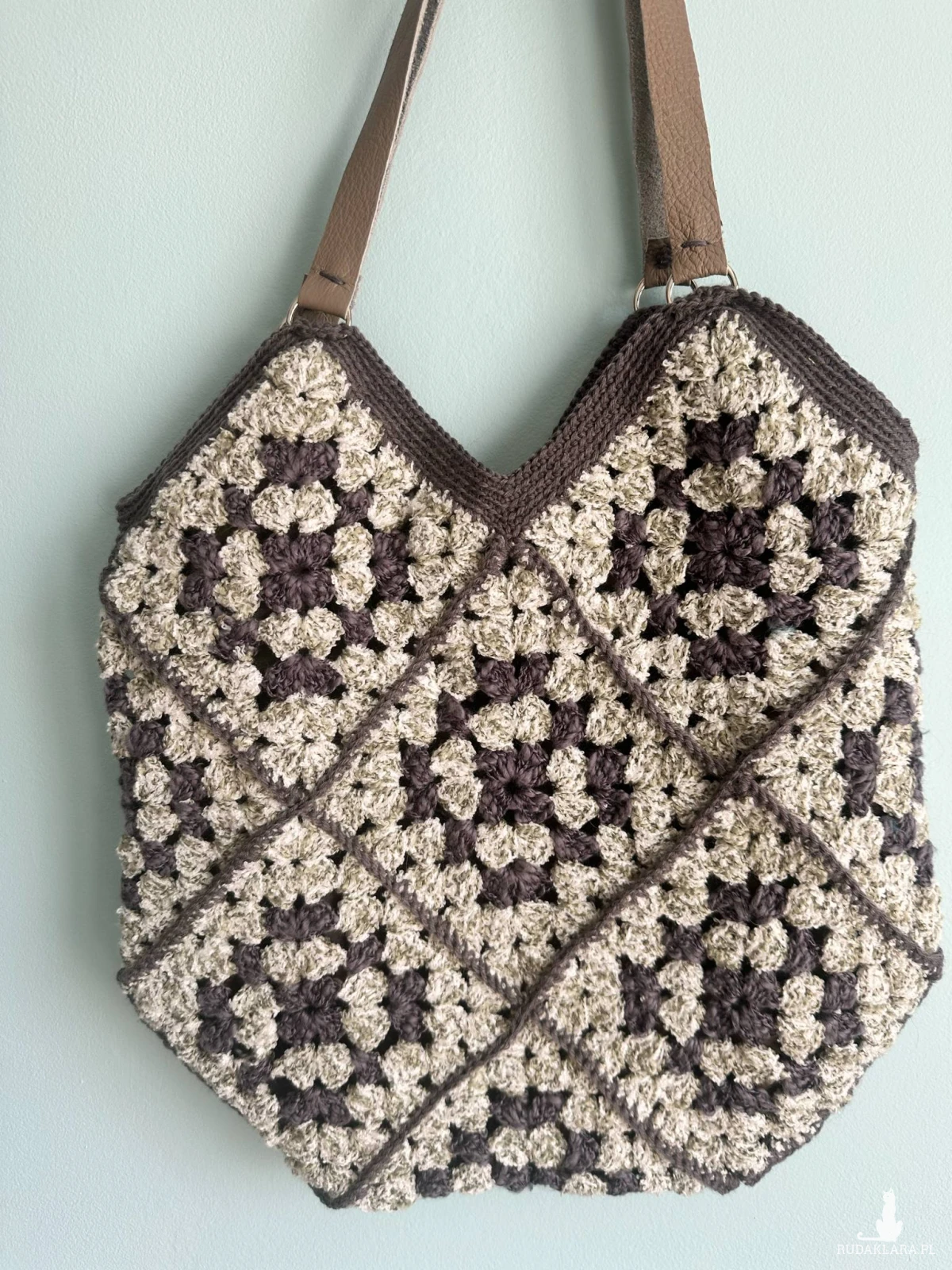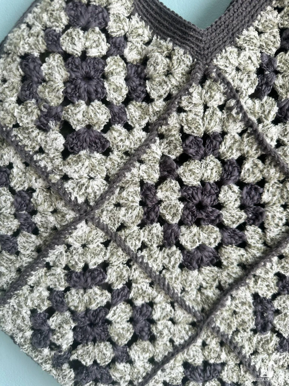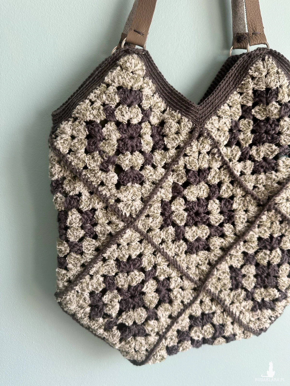 Torebka rękodzieło stworzona na szydełku, wewnątrz podszewka z kieszonką, noszona na ramieniu Rozmiar: szerokość 33 cm, wysokość 35cm.