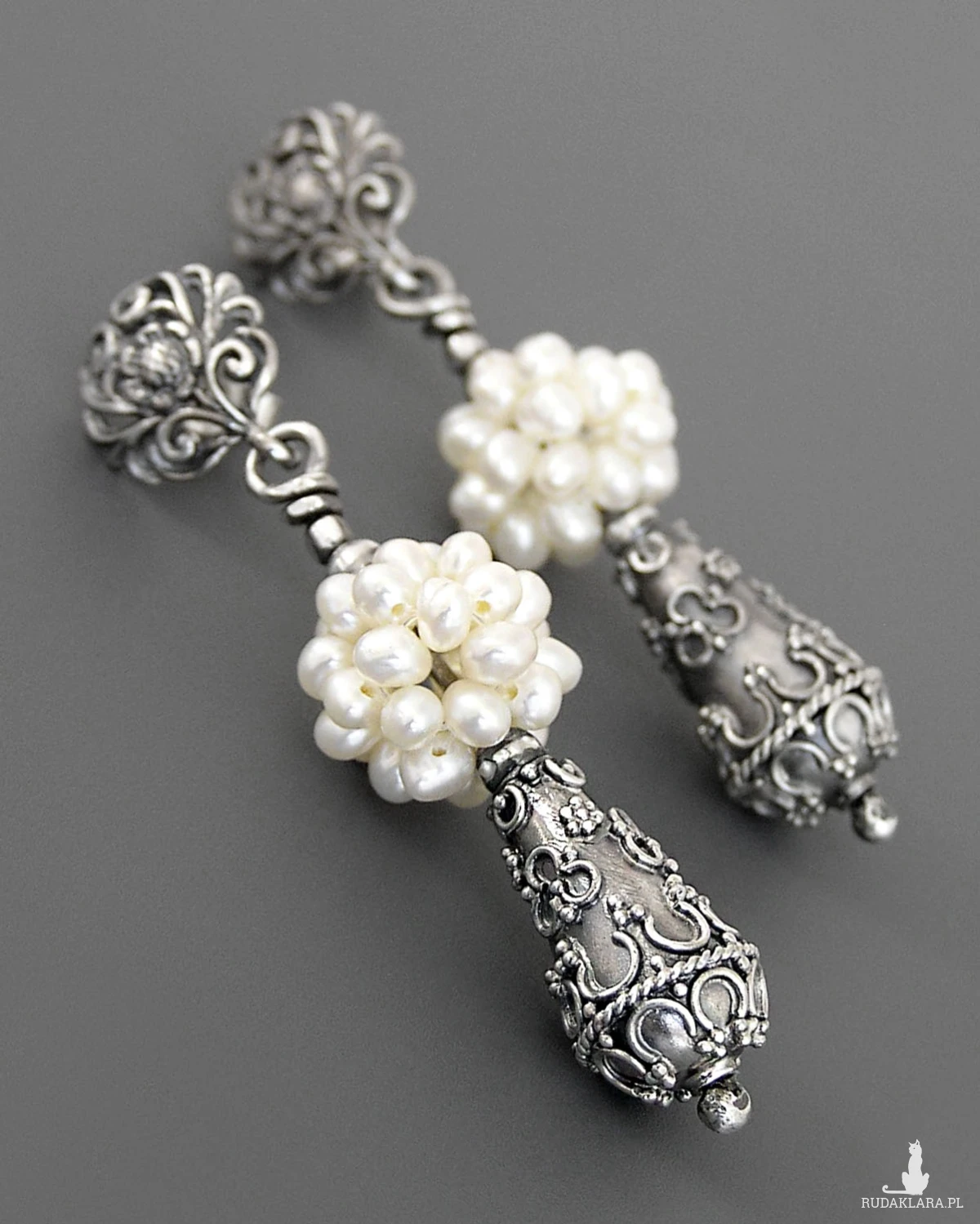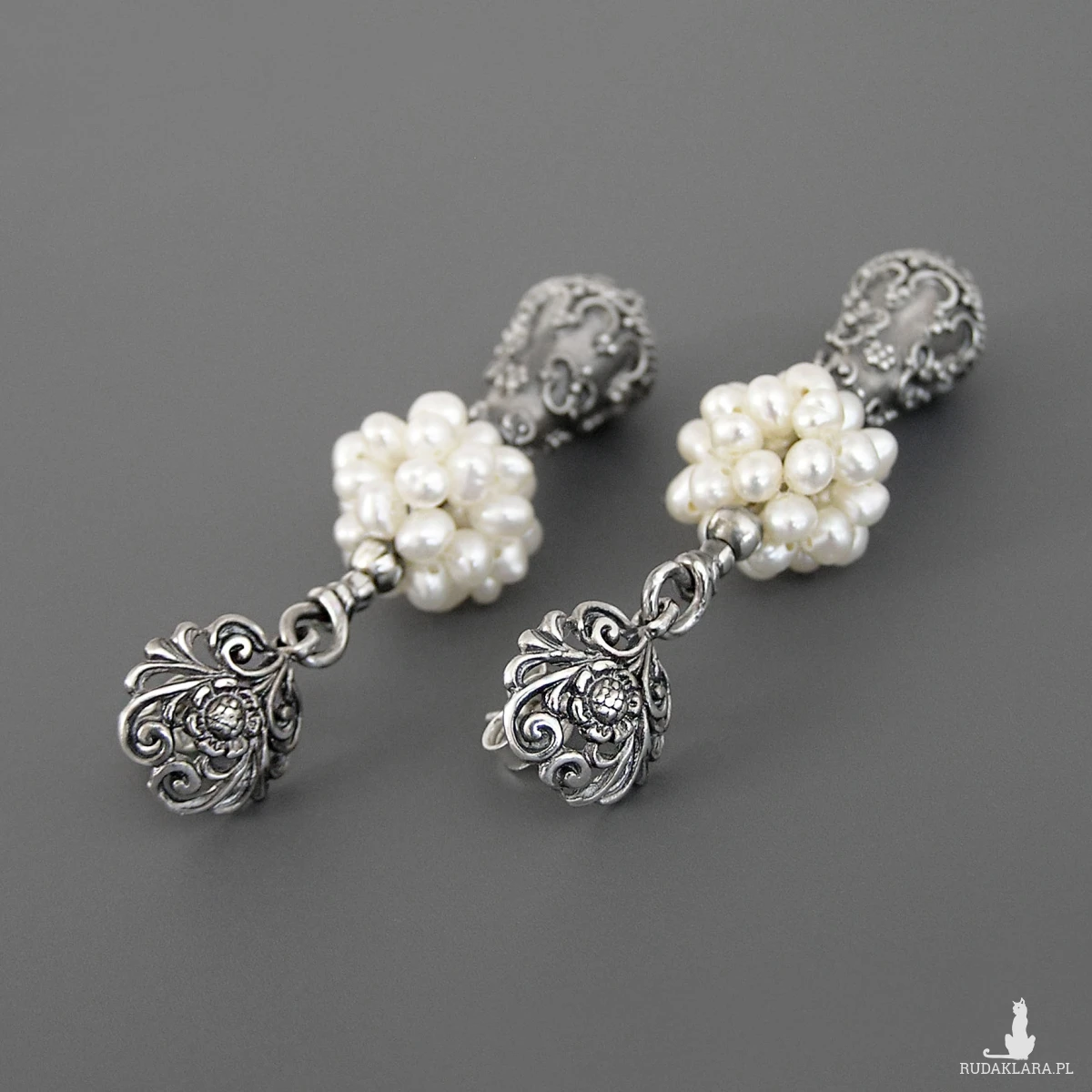 Długie kolczyki retro z "jeżynkami" z maleńkich 3 mm pereł (średnica 12 mm).