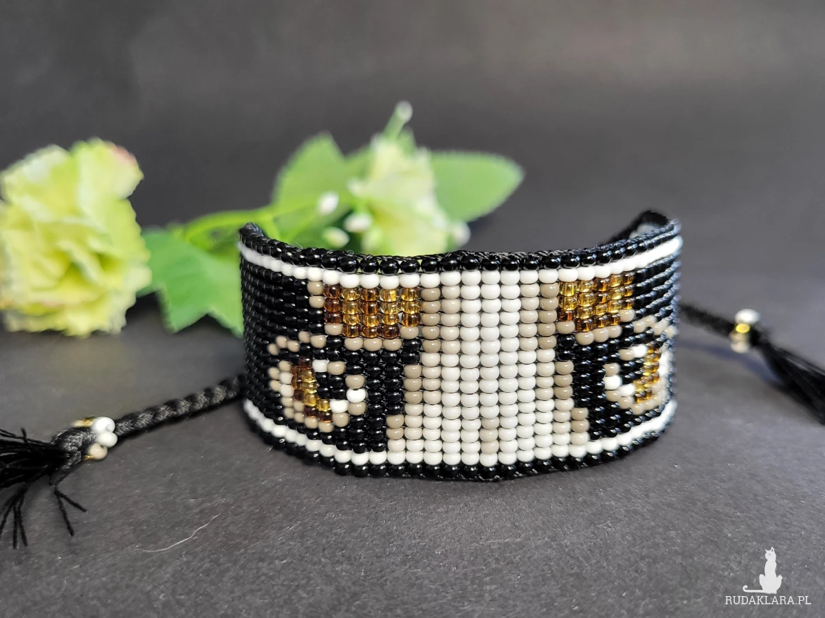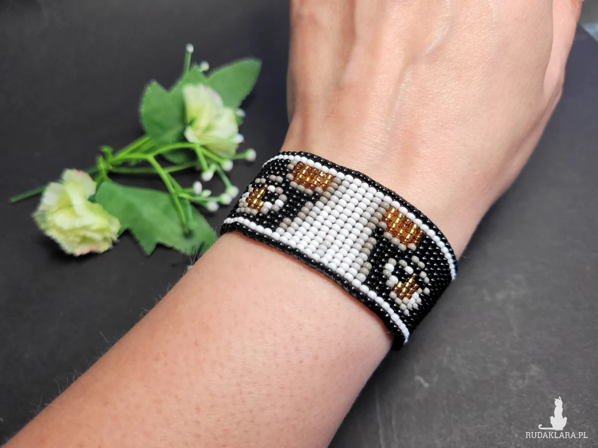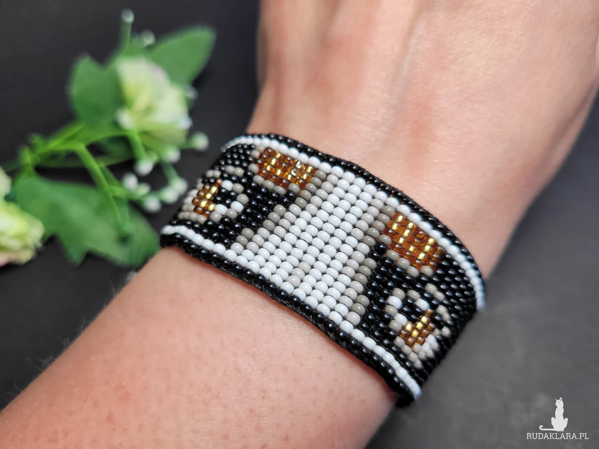 Wlasnoręcznie utkana na krosnie z koralików czeskich Preciosa bransoletka uniseks z oczami Berneńskigo psa pasterskiego.