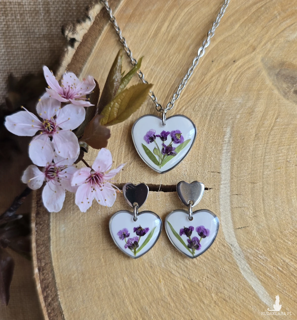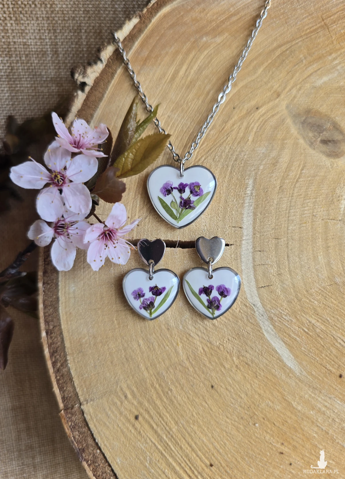 Oferuję Państwu unikalną biżuterię. Komplet jest wykonany z suszonych kwiatów i żywicy epoksydowej. Biżuteria jest wspaniałym i oryginalnym prezentem na lata.