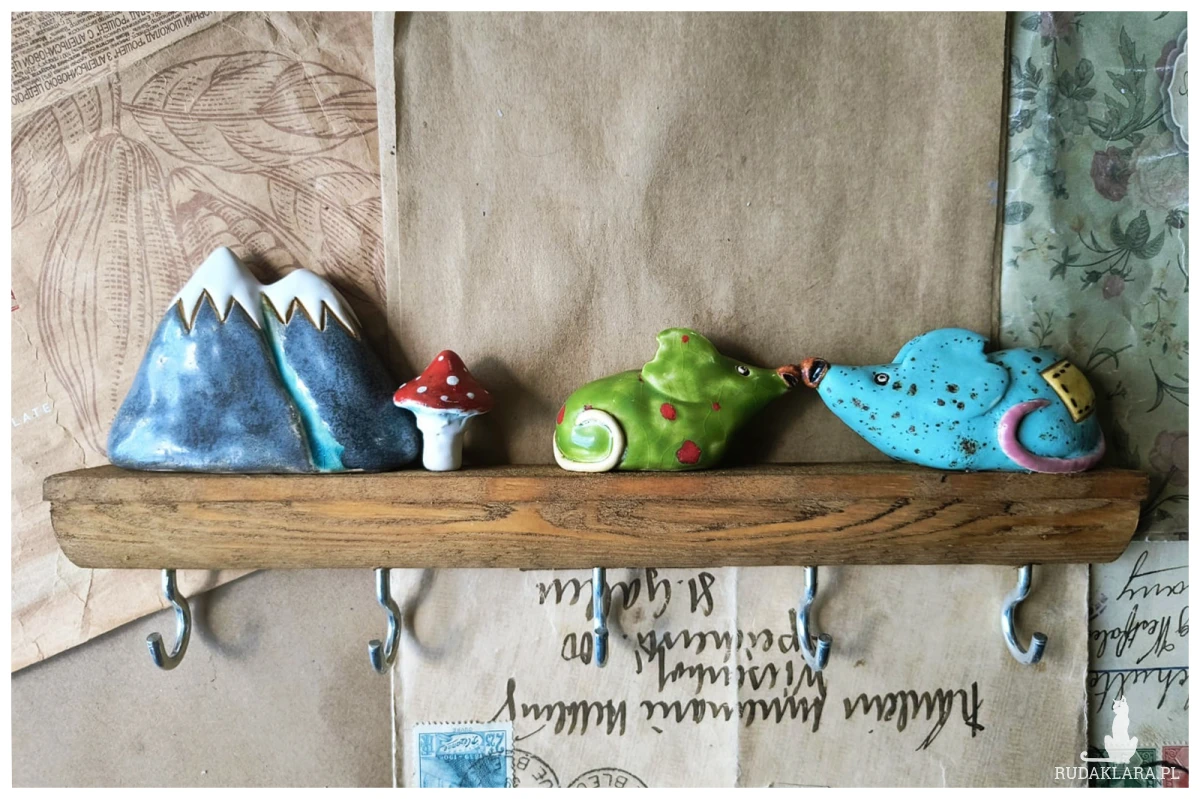 Stylizowany wieszak drewniany o długości 25 cm, z delikatnym frezem, na 65 haczyków, ozdobiony ceramicznymi elementami wykonanymi z gliny ceramicznej. Dodatki wypalone zostały na biskwit, a następnie szkliwionych w temperaturze 1260 stopni C. Z tytułu wygodne mocowanie w postaci zawieszek. Całość utrzymana w stylu vintage. Serdecznie polecam!!!
