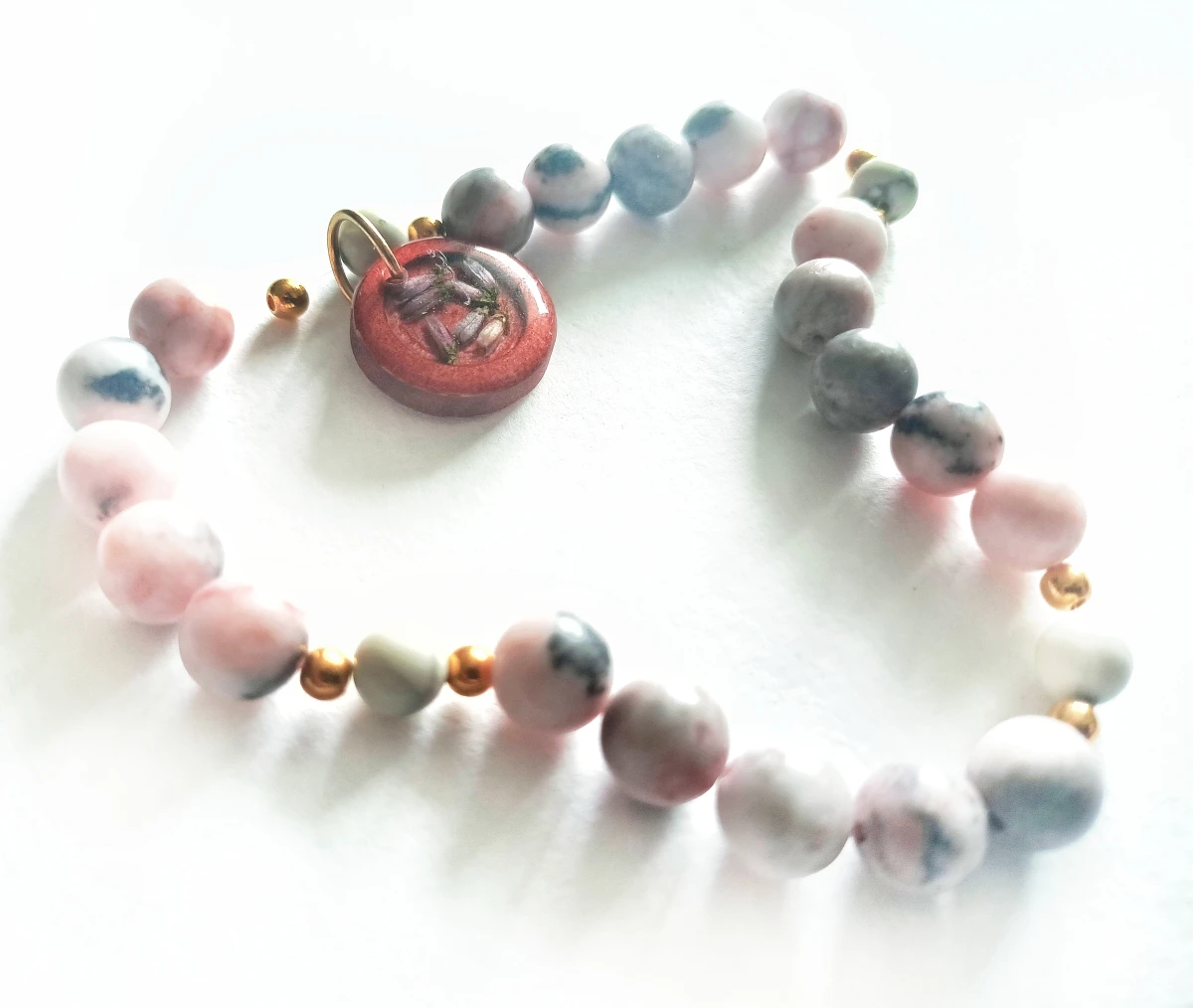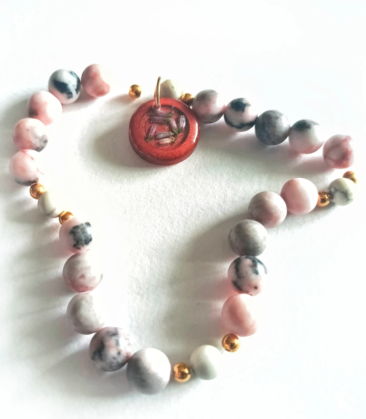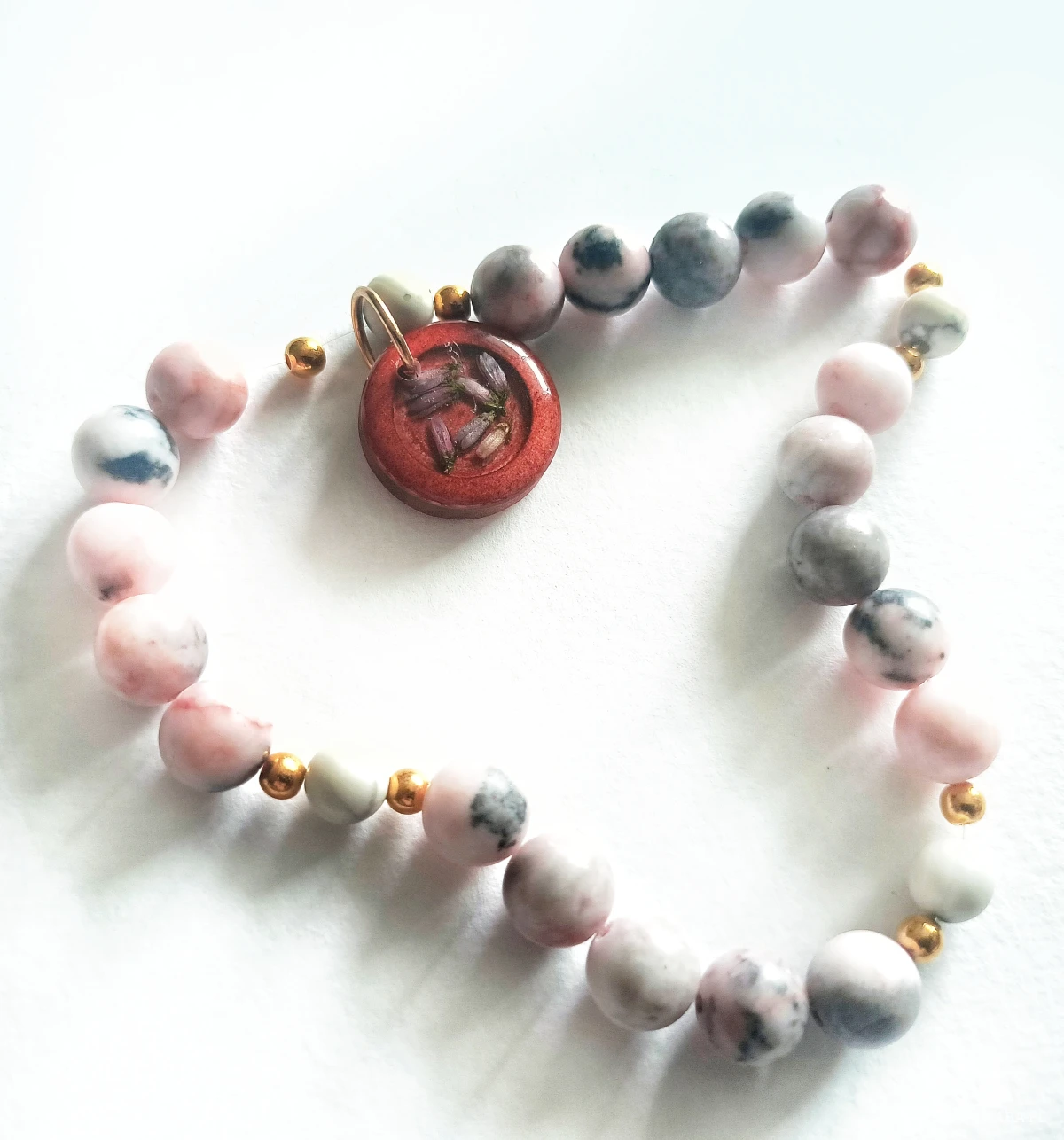 Oferuję wyjątkową, ręcznie wykonaną bransoletkę na żyłce jubilerskiej z naturalnych kamieni półszlachetnych – howlitu i jaspisu różowego – uzupełnioną unikalną zawieszką z zatopionym w żywicy wrzosem 🌺