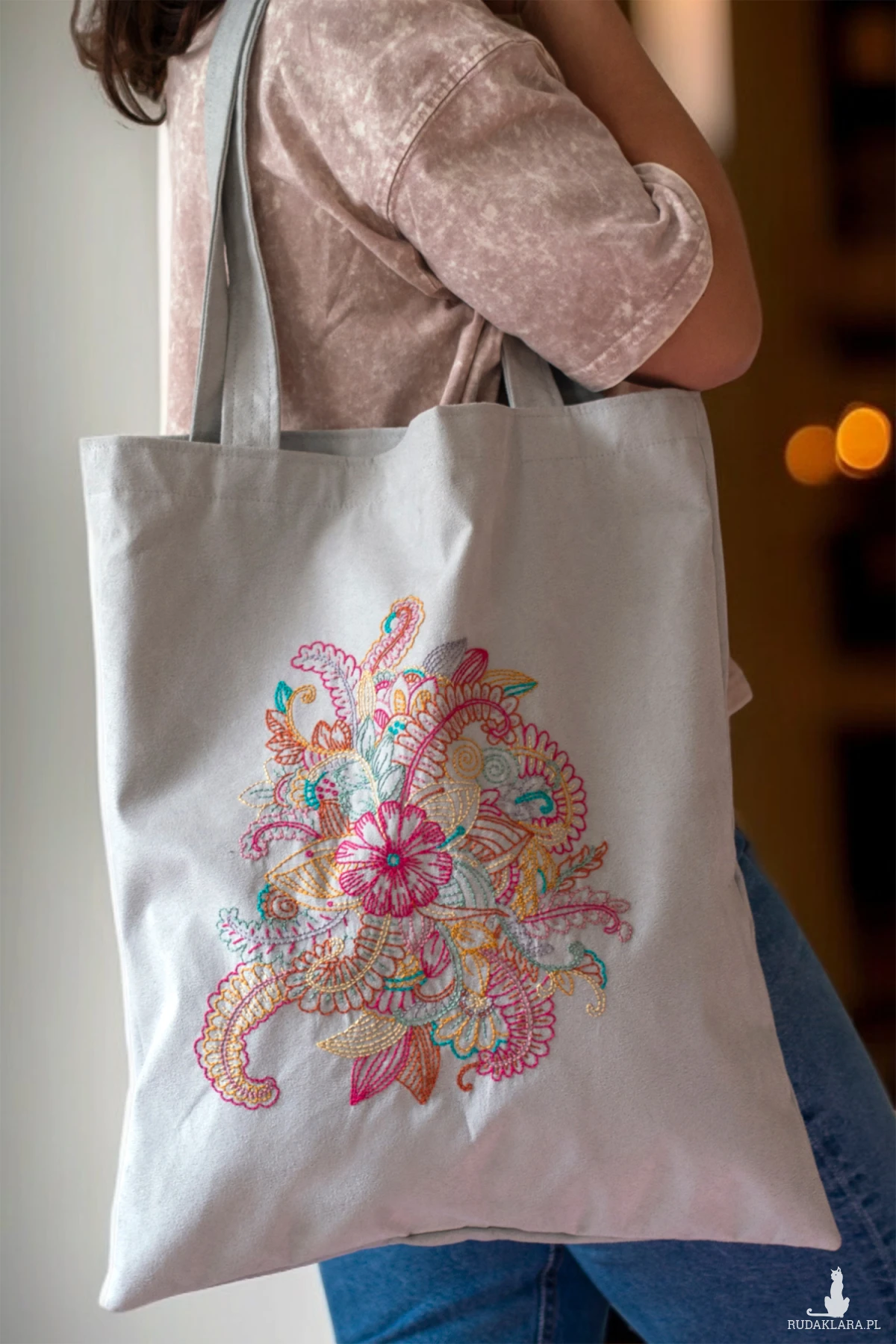 Duża torba na ramię typu shopper wykonana z jasnoszarego nubuku. Z przodu ręcznie haftowany kolorowy wzór.