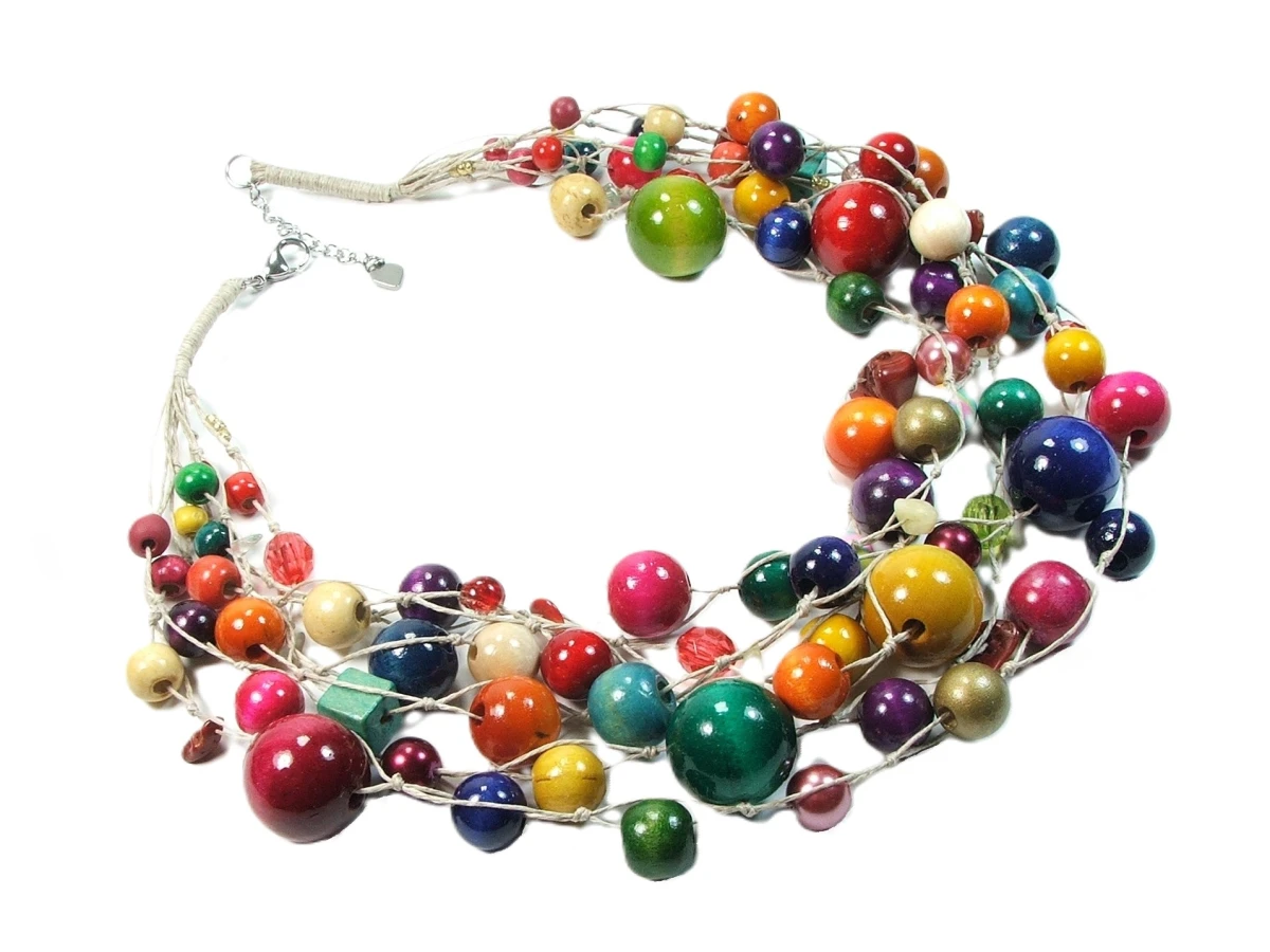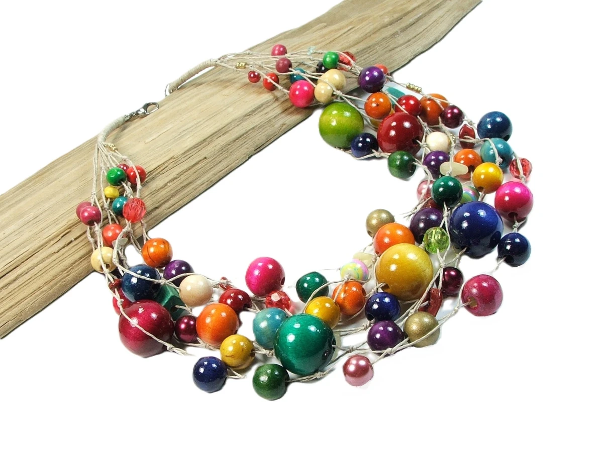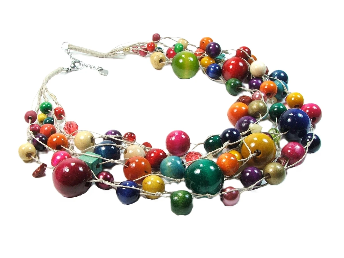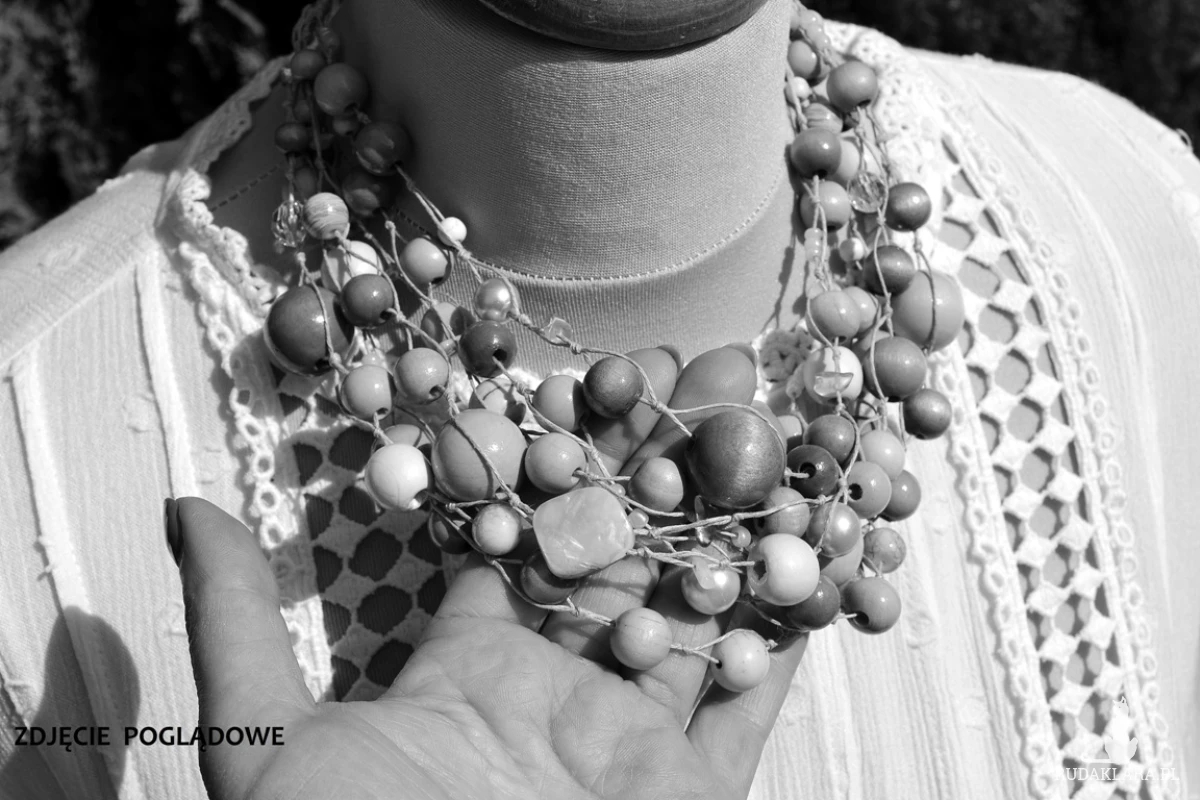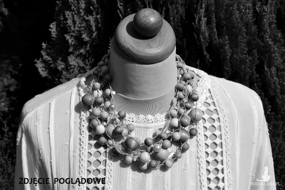 Naszyjnik wykonany ręcznie na bazie przędzy lnianej dobrze zaimpregnowanej, w którą wpleciono bryłki jadeitu, korala, korale drewniane, akrylowe i szklane. Wykończeniem są elementy ze stali szlachetnej, zwanej także chirurgiczną. Długość naszyjnika regulowana około 48-53 cm. Wielkość minerałów i korali do około 2 cm. Na zamówienie - bransoletka do kompletu oraz kolczyki.