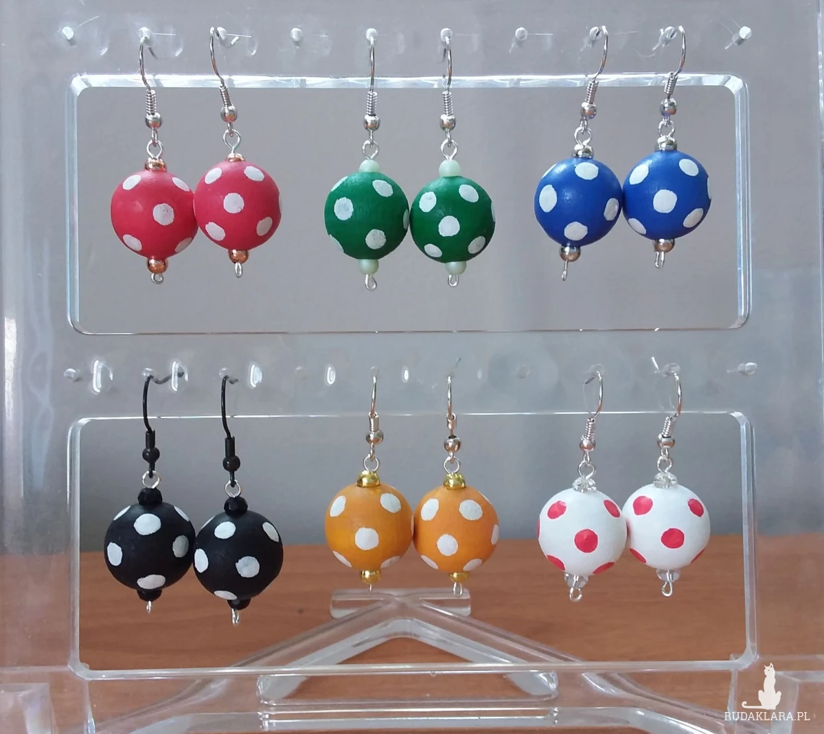 Małe, drewniane kolczyki w kropki, bigle ze stali chirurgicznej. Niebieskich są 2 pary, pozostałe kolory po 1 parze. Podczas zakupów napisz w wiadomości, który kolor wybierasz.