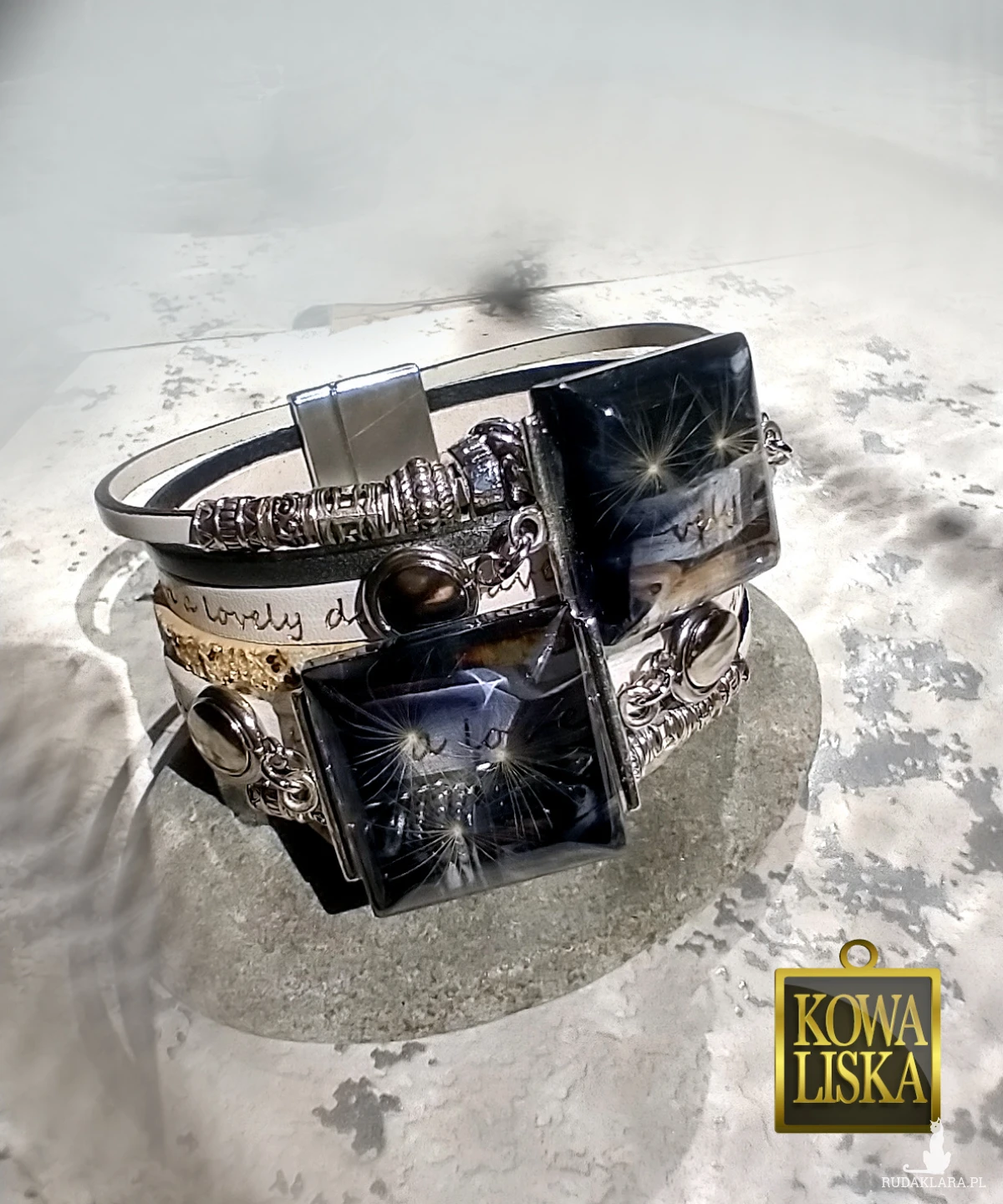 Efektowna, asymetryczna bransoleta, której centralnym elementem są grafitowe, lekko przejrzyste kwadraty z zatopionymi parasolkami dmuchawca, zamontowane na skórzanych pasach z nuta połyskującego złota.