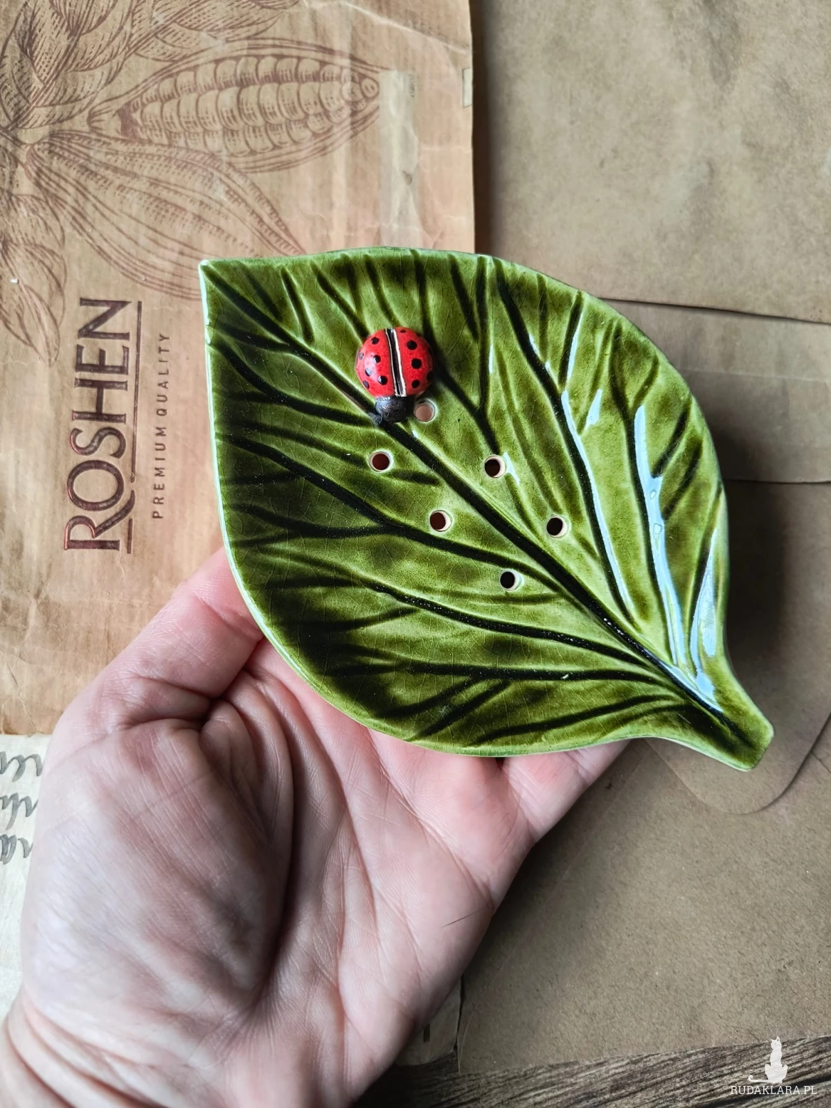 Mydelniczka ceramiczna w kształcie liścia, wykonana z gliny szamotowej wypalona na biskwit, a następnie szkliwiona w temperaturze 1260 stopni C. Wymiary ok 13,5 x 8 cm cm. W pięknej butelkowej kolorystyce. Idealne do ozdoby domu lub jako prezent okolicznościowy. Serdecznie polecam!!!