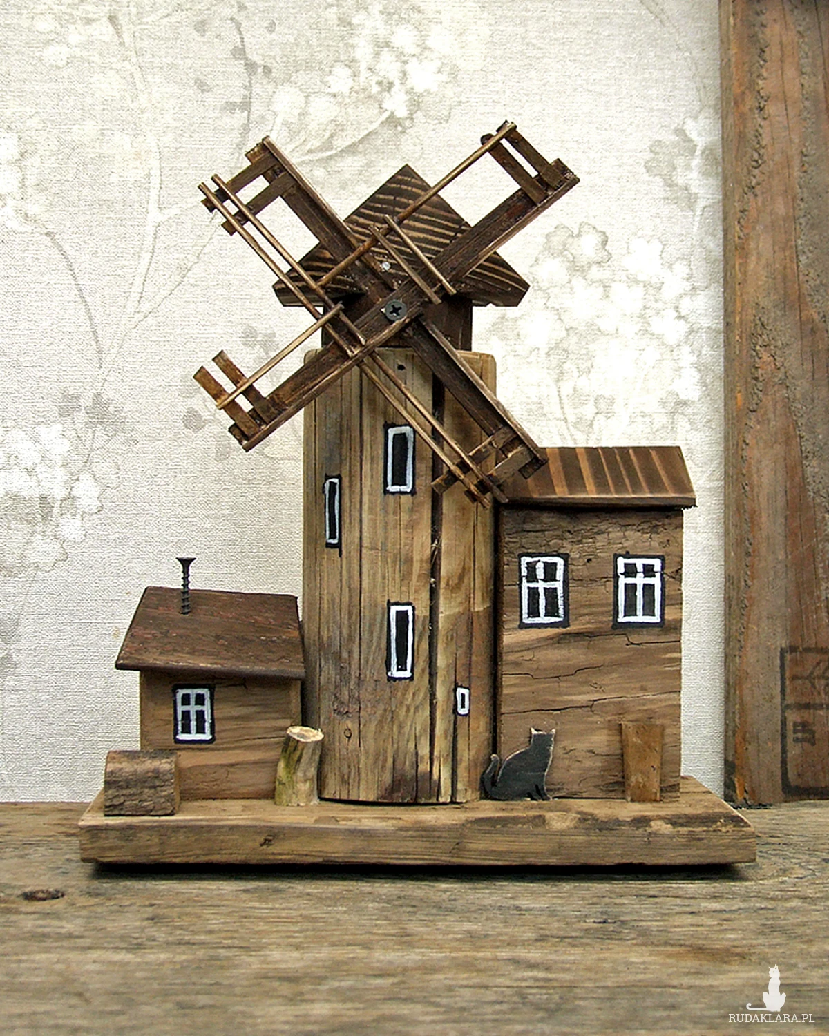 Dekoracja wykonana jest ze starego drewna sosnowego. Drewno ma ślady wcześniejszego użytkowania:pęknięcia, wgłębienia i otworki po gwoździach. Wszystko jest oczyszczone i zabezpieczone akrylowym matowym lakierem. Wykorzystaliśmy także różne patyczki i gałązki do budowy skrzydeł wiatraka. Dodatkowym elementem jest kot, wycięty ze sklejki.