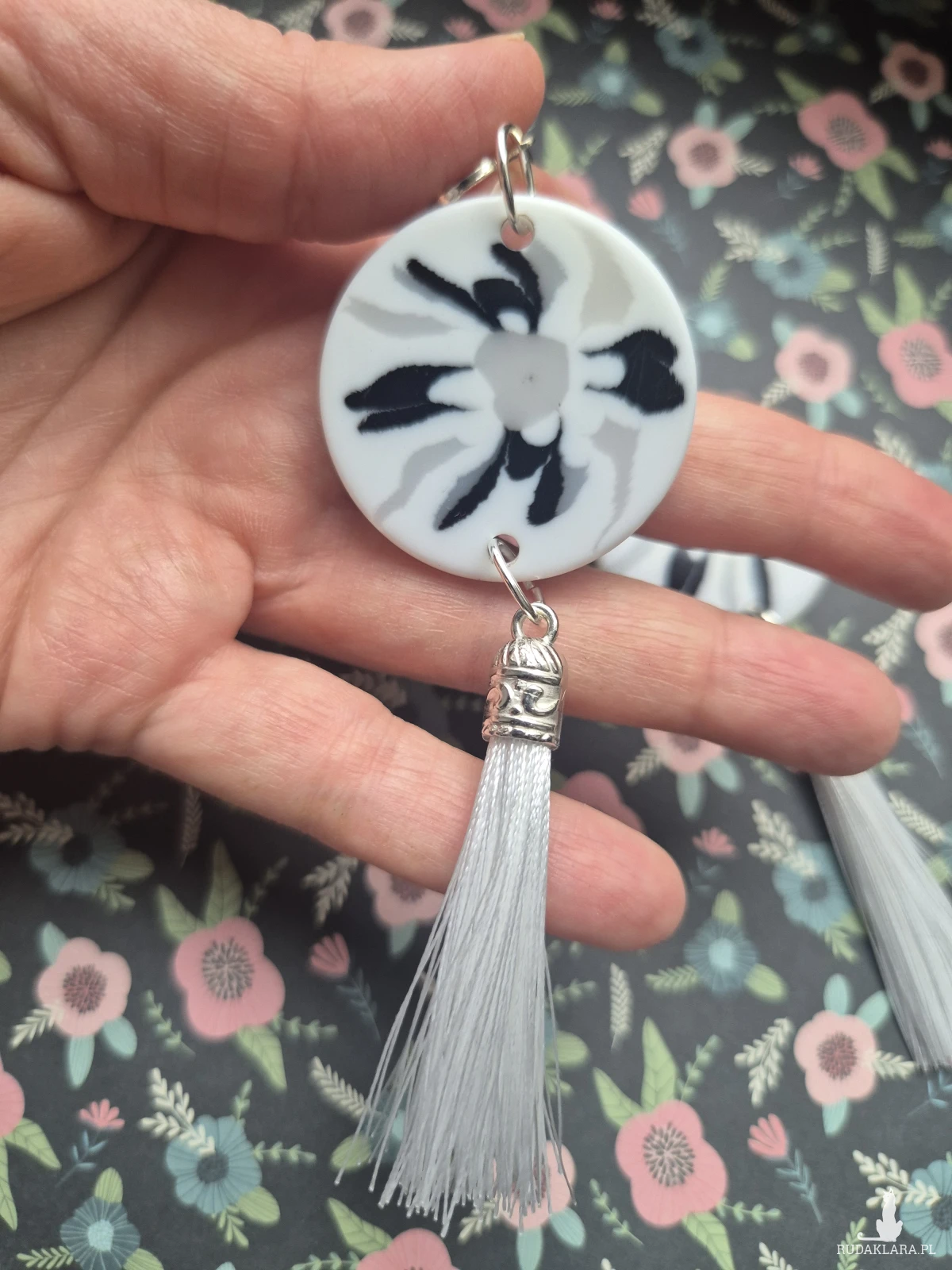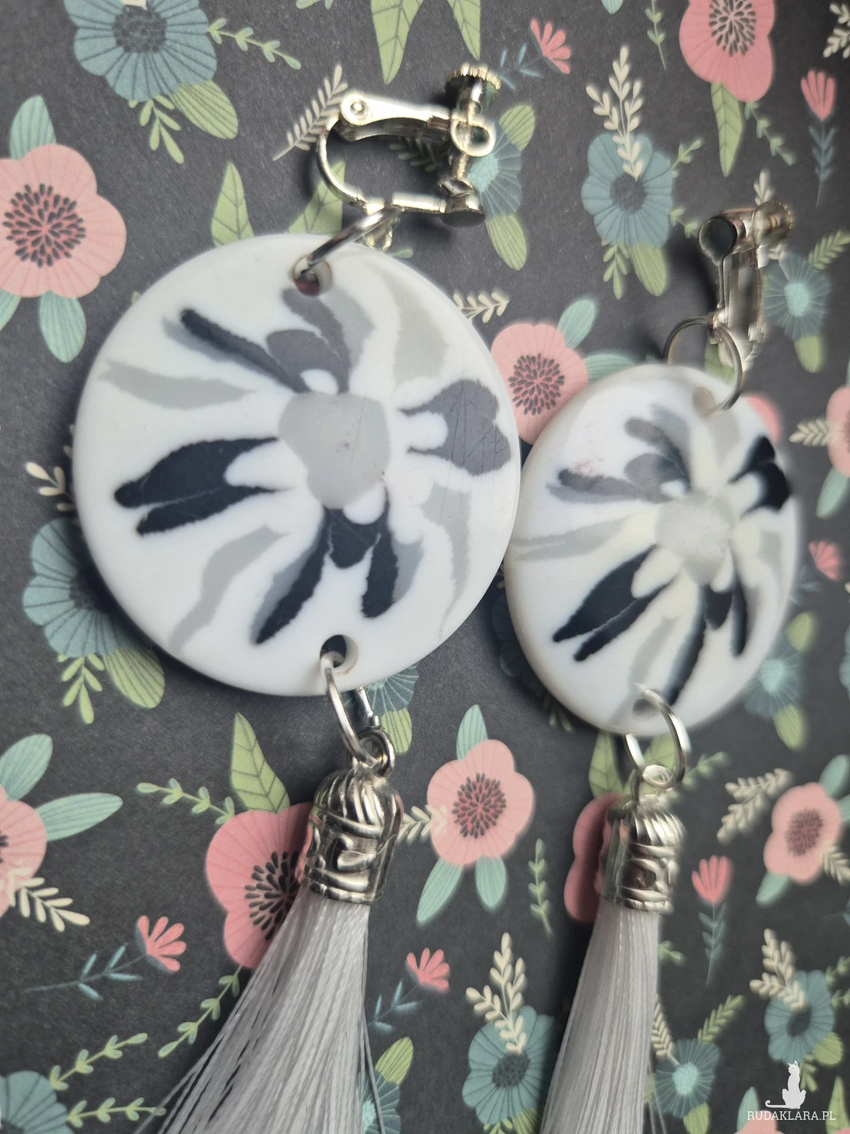Klipsy duże biało-szaro-czarne z białymi chwostami lekkie oryginalne robione ręcznie zwracają uwagę polecam, Jeśli chcesz żebym zamieniła je na kolczyki Napisz zrobię to cena pozostaje bez zmian:)  Box X1