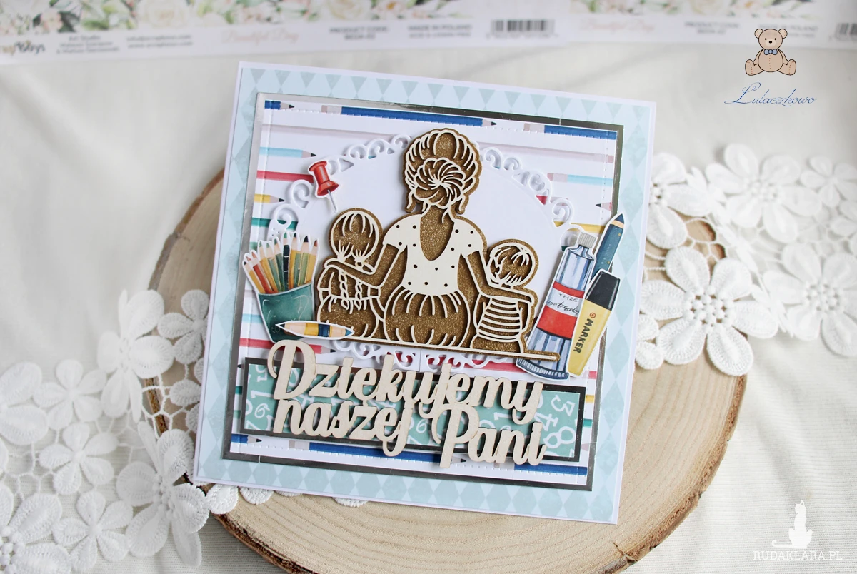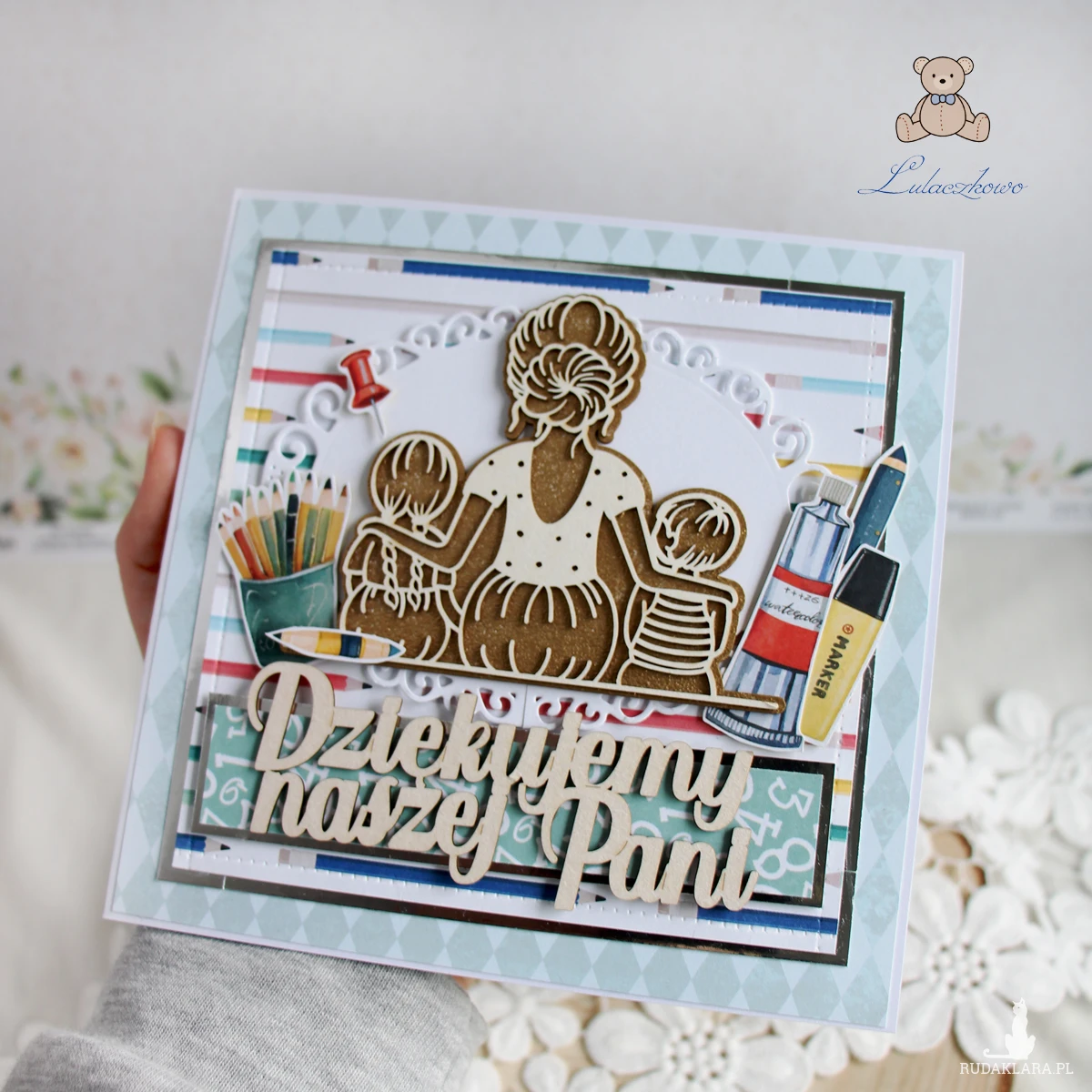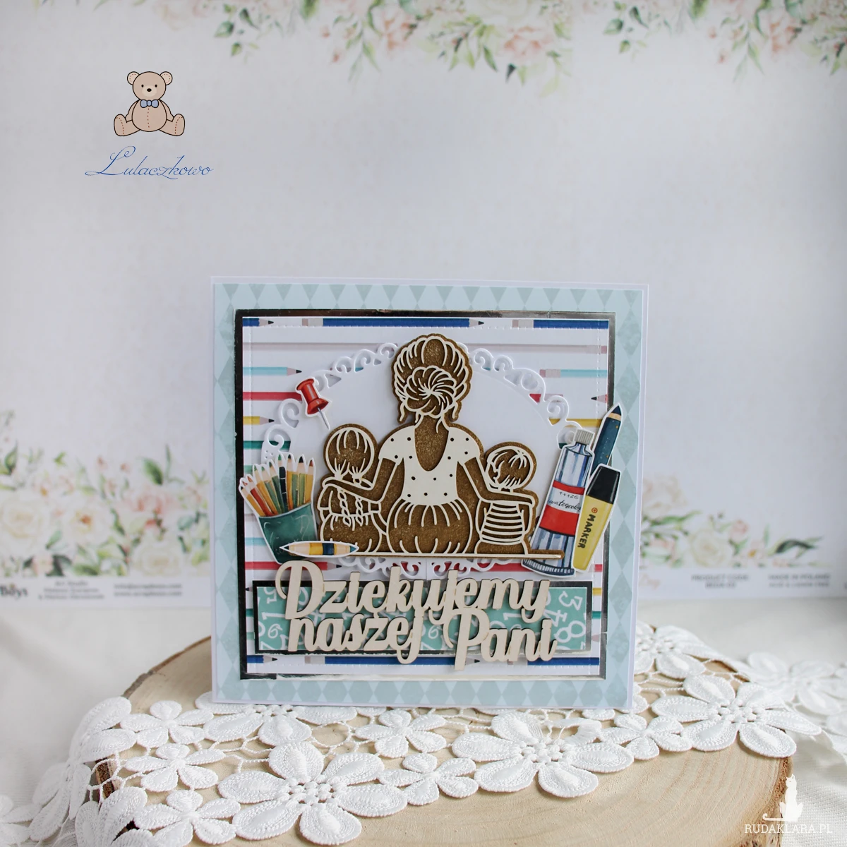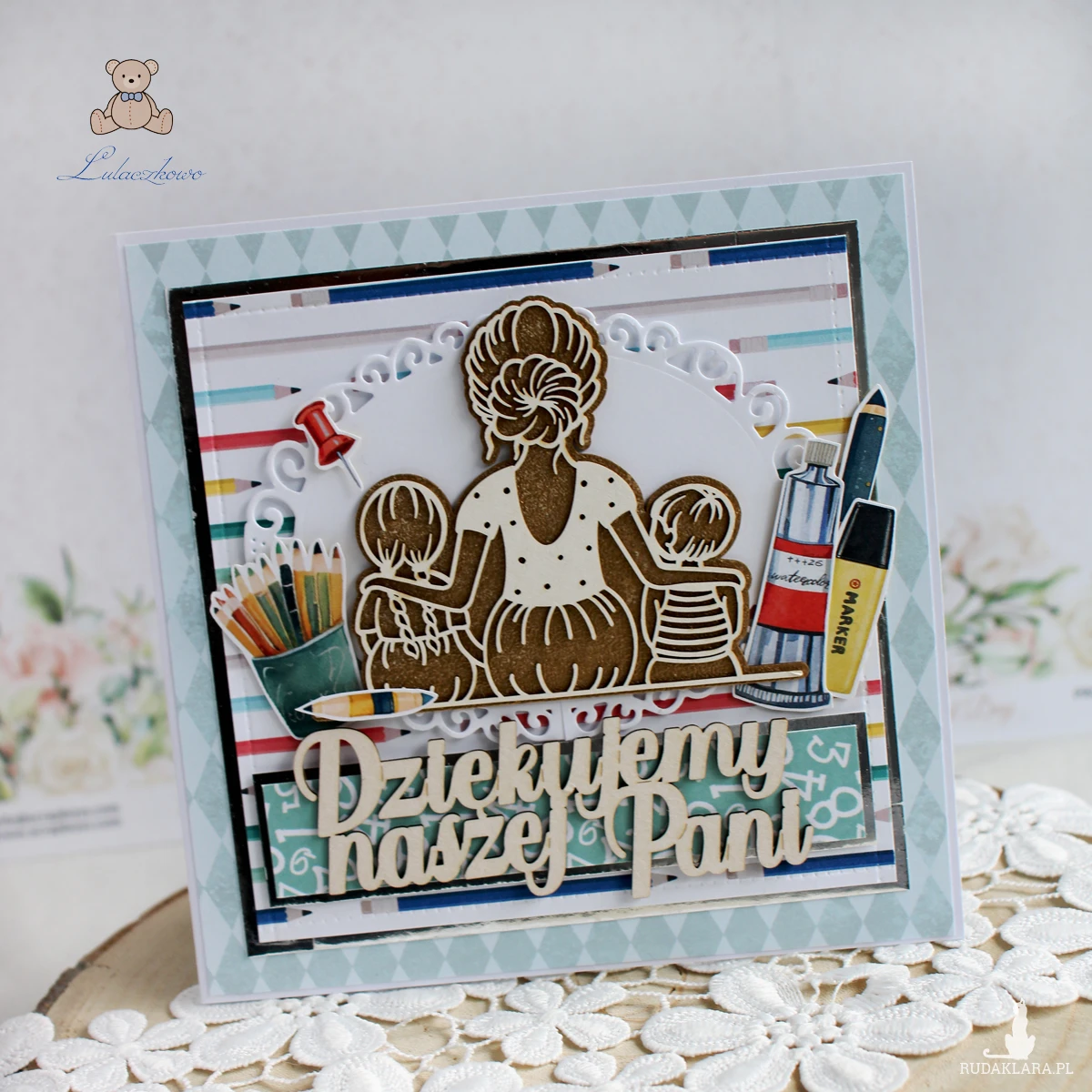 Piękna, kolorowa, energetyczna kartka podziękowanie dla nauczycielki/wychowawczyni, idealna jako prezent na zakończenie roku szkolnego. Kartka z przeuroczą, warstwową tekturką przedstawiającą Panią nauczycielkę obejmującą małego chłopca i dziewczynkę. Kartka ozdobiona jest dodatkowo wycinankami z motywami szkolnymi a także tekturkowym napisem "Dziękujemy Naszej Pani", do napisu mogę dodać również imię nauczycielki