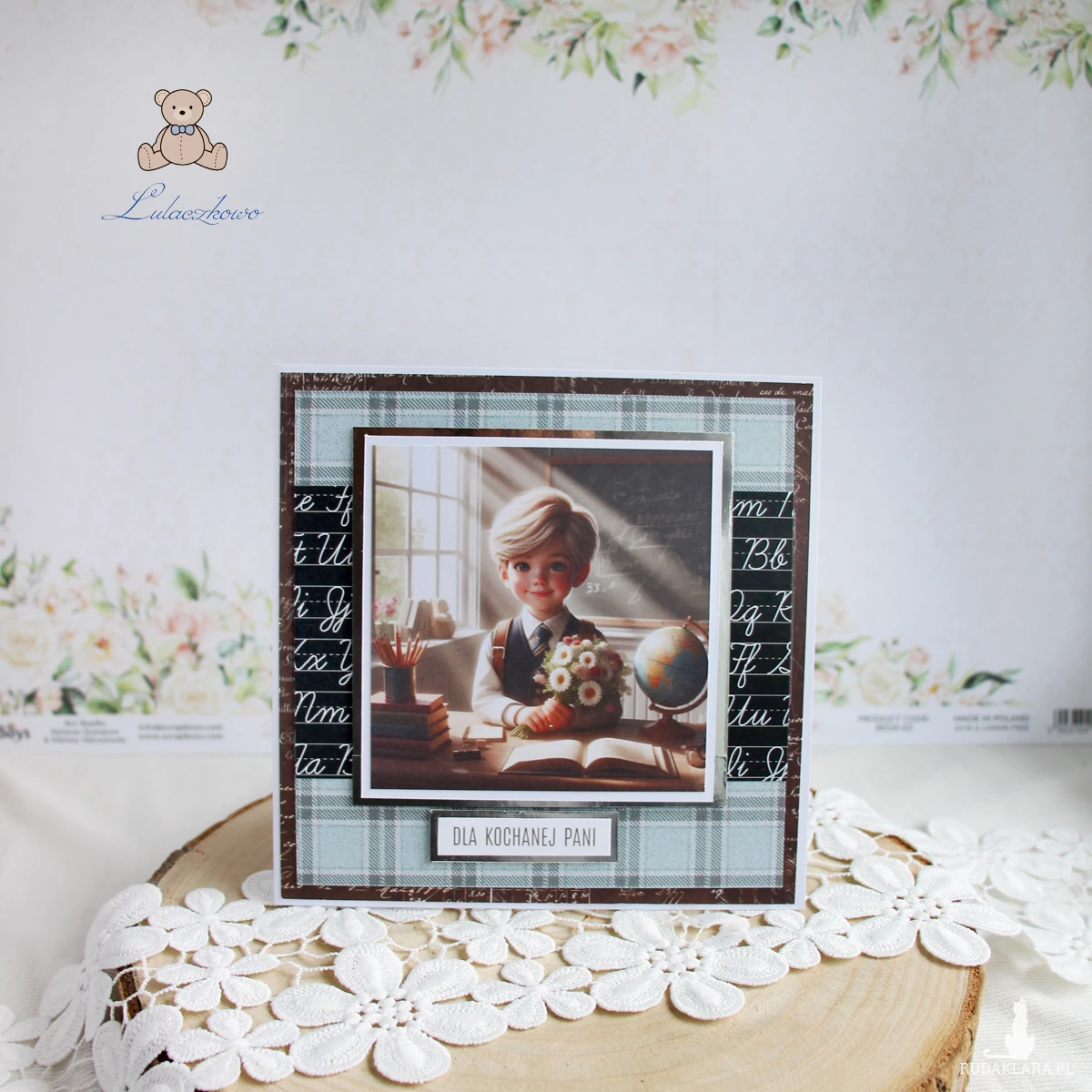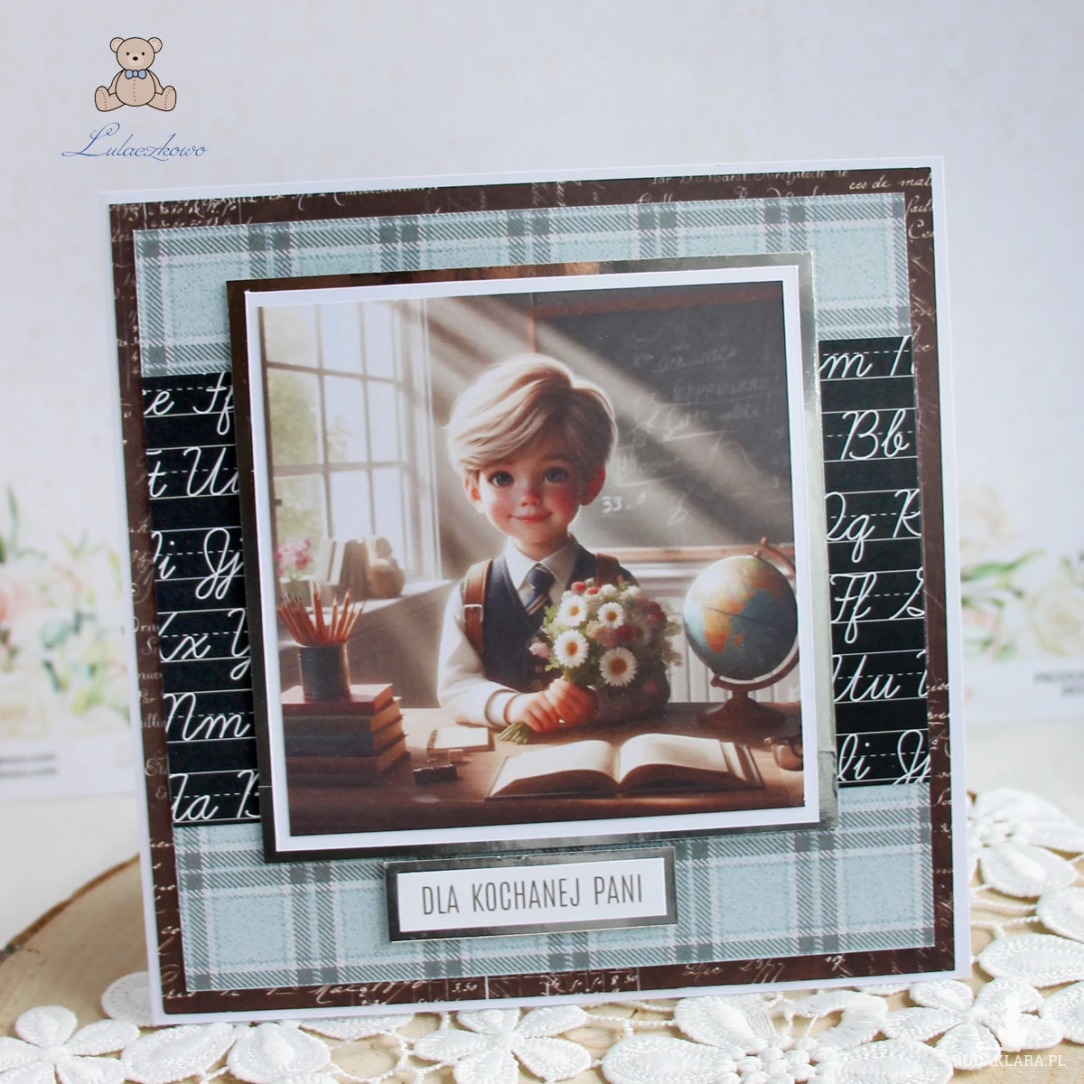 Podziękowanie dla nauczyciela/nauczycielki, w formie ręcznie robionej kartki pamiątkowej, idealnej jako prezent na zakończenie roku szkolnego. Kartka z motywem chłopczyka, ucznia trzymającego w rękach bukiet kwiatów. Kartka ozdobiona jest dodatkowo papierem scrapowym oraz błyszczącym, srebrnym papierem lustrzanym oraz napisem "Dla kochanej Pani" - na życzenie napis mogę zmienić na dowolny, np. "Kochanej Pani Beatce".