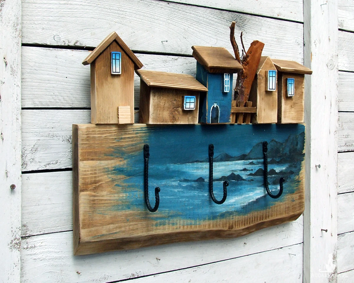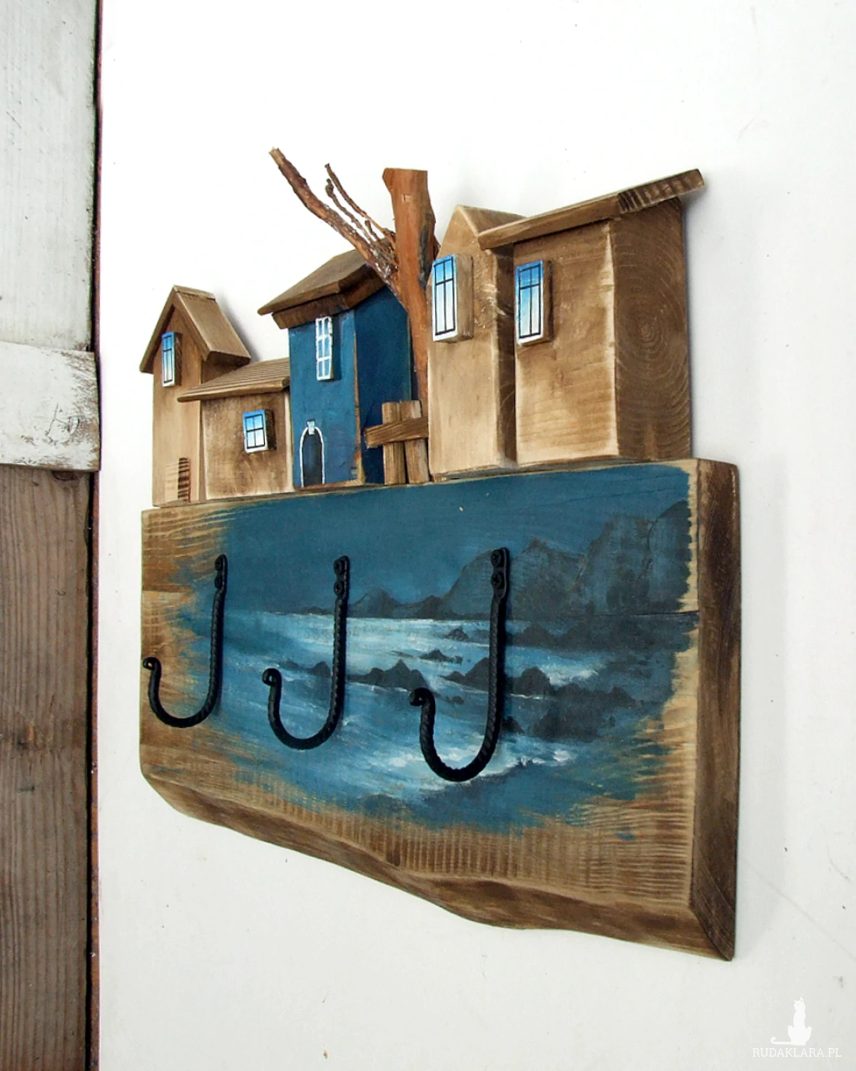 Drewniany wieszak z domkami i malowanym pejzażem.