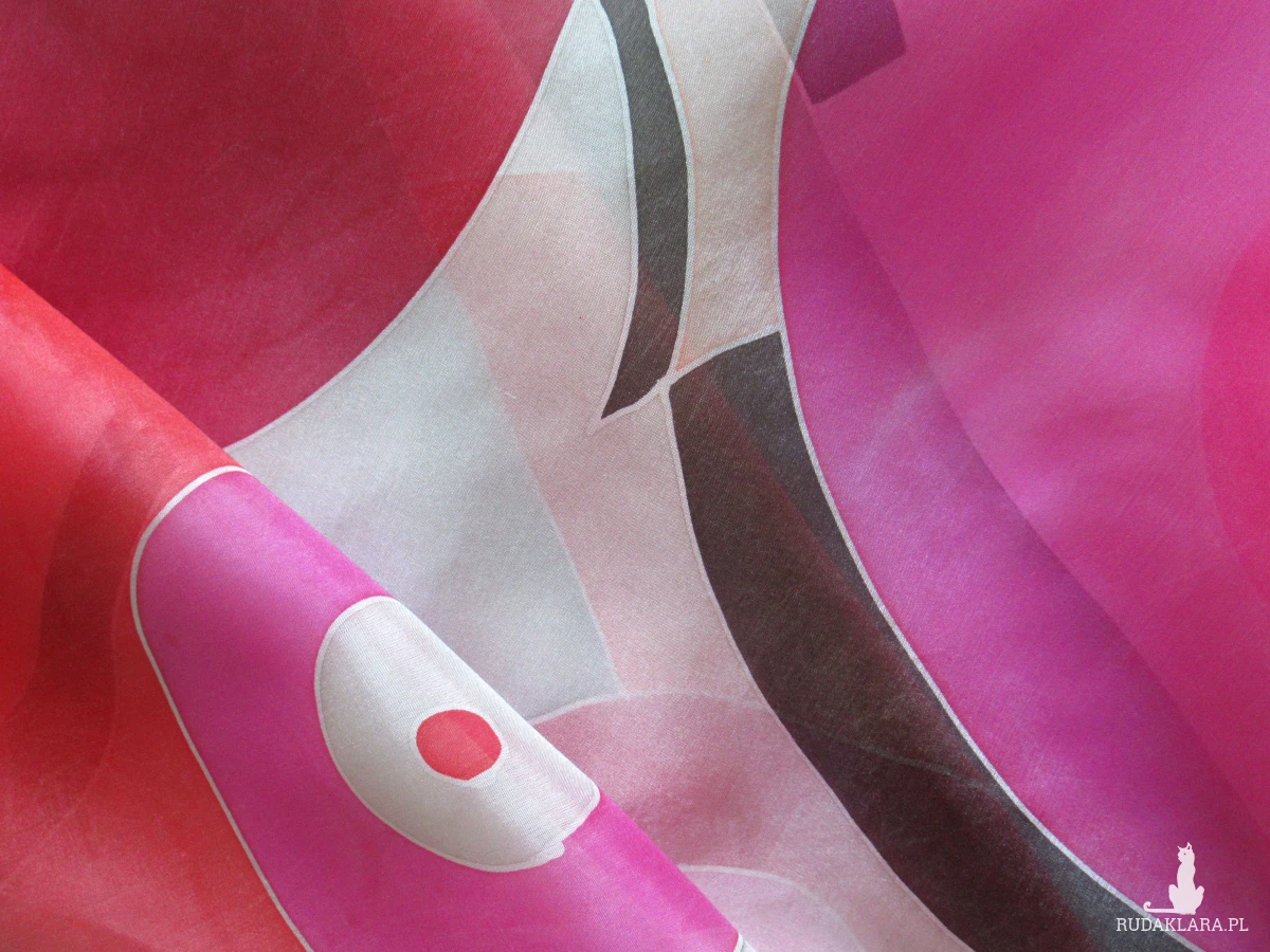 Geometryczny wzór w mocnych odcieniach czerwieni i różu z akcentami czerni dobrze odbija od jasnego tła.