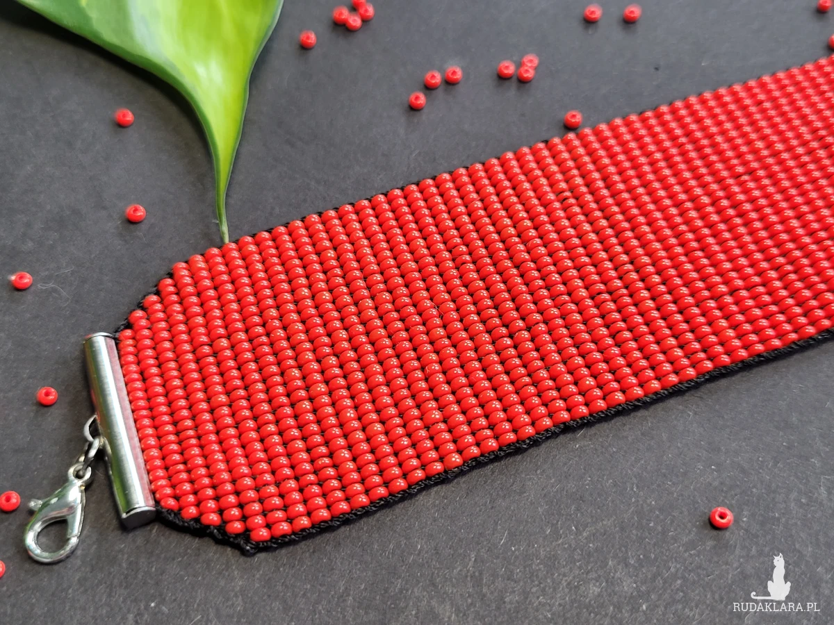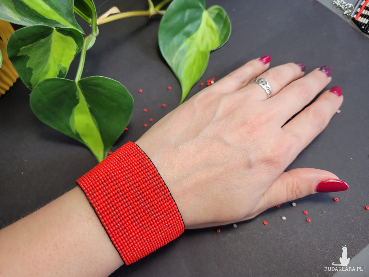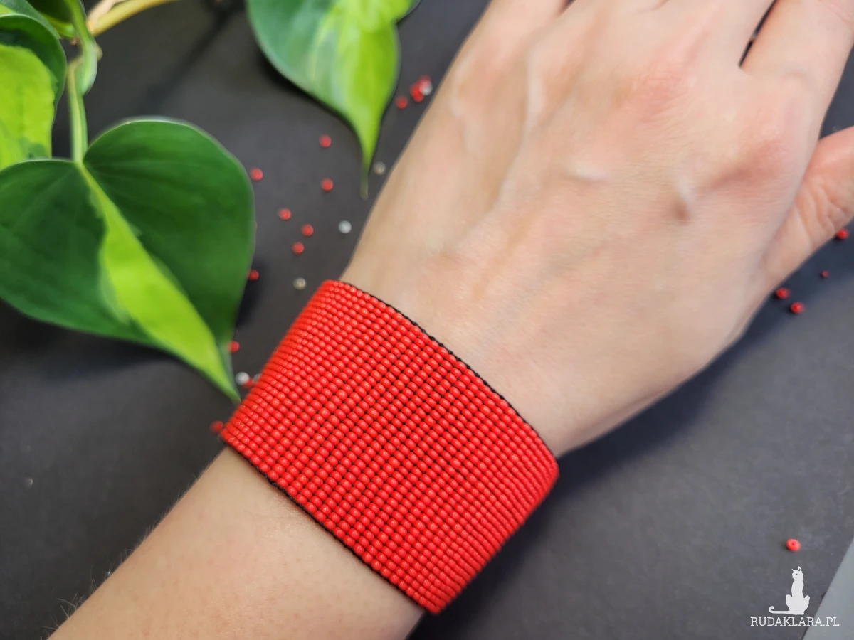 💃 Szeroka czerwona bransoletka własnoręcznie utkana na krosnie ze szklanych koralików czeskich Preciosa.
