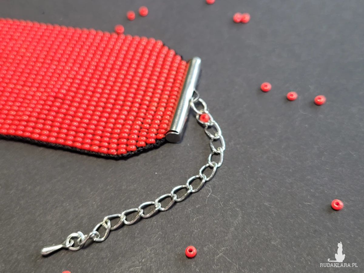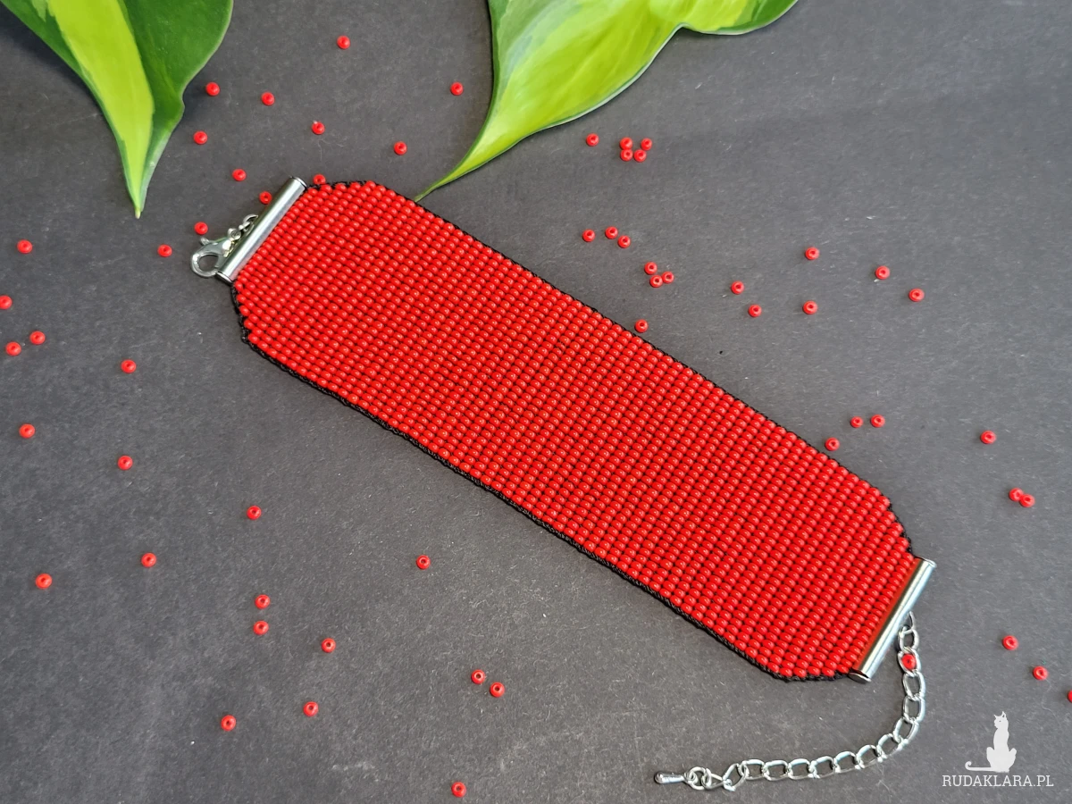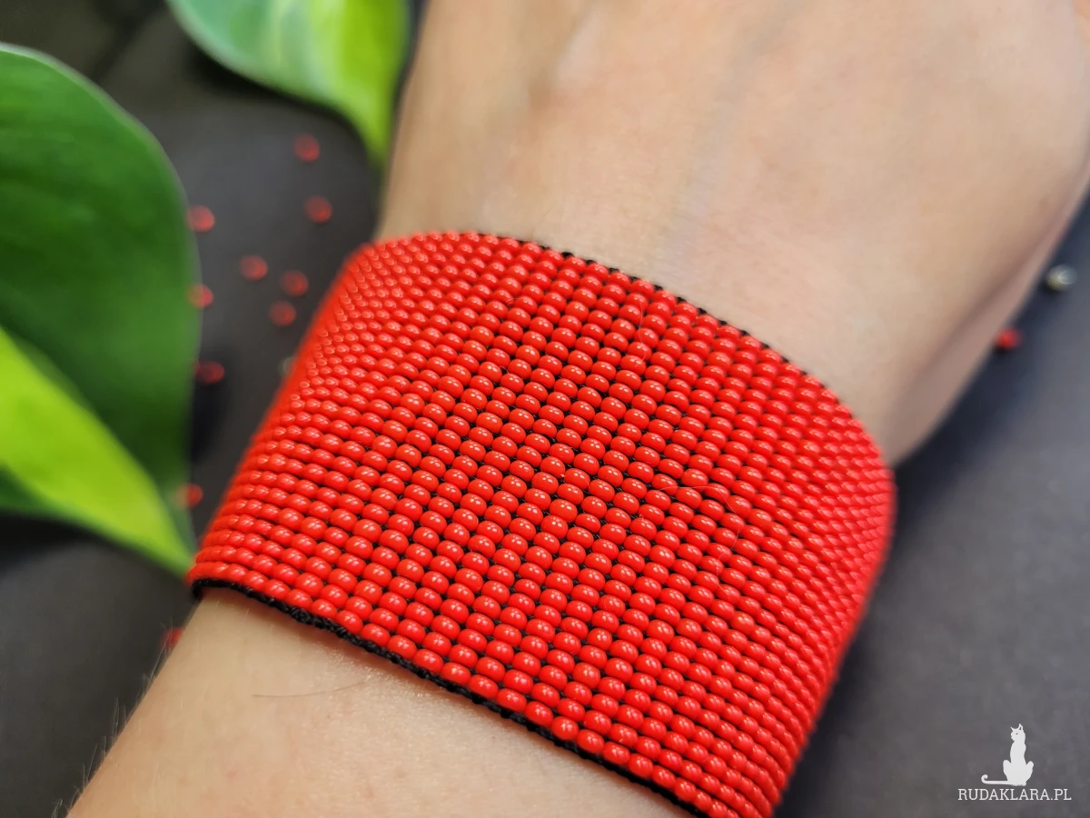 💃 Szeroka czerwona bransoletka własnoręcznie utkana na krosnie ze szklanych koralików czeskich Preciosa.