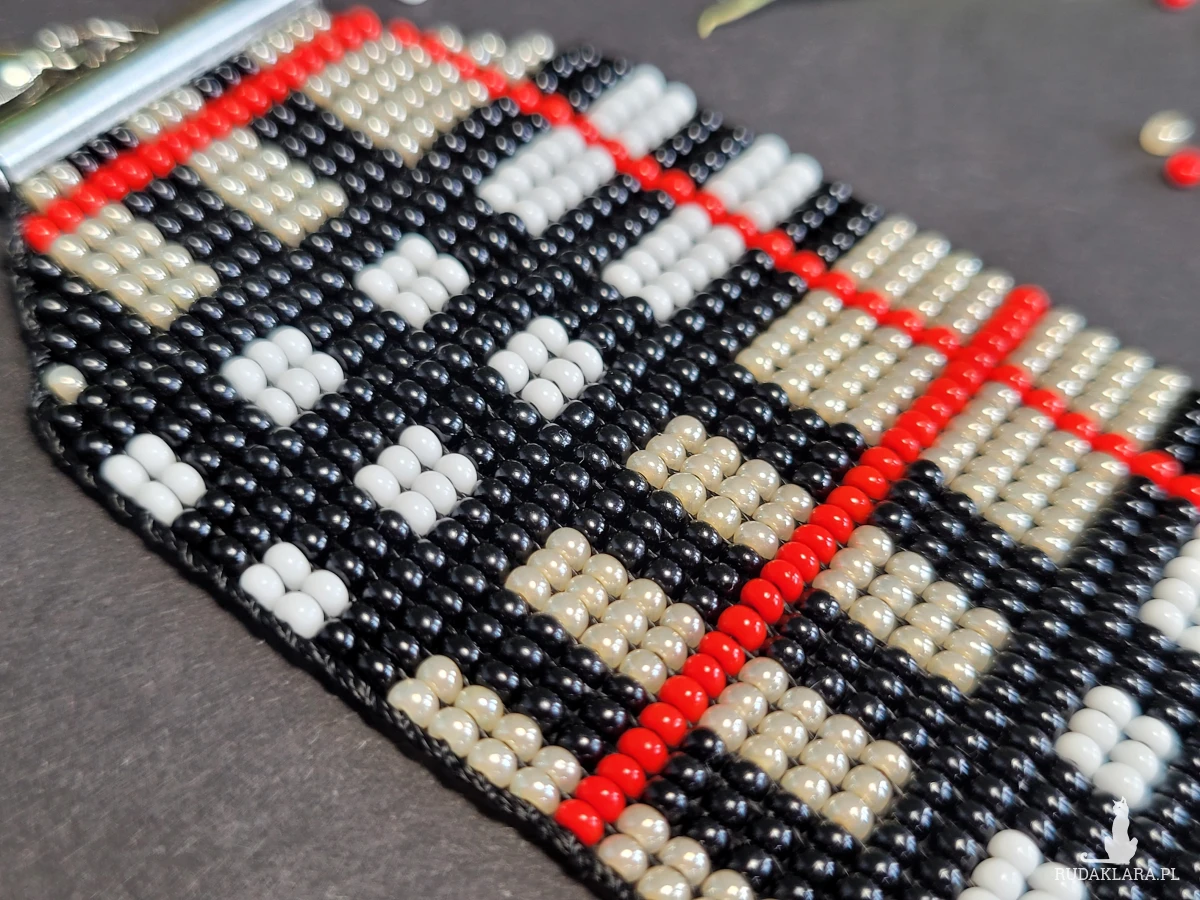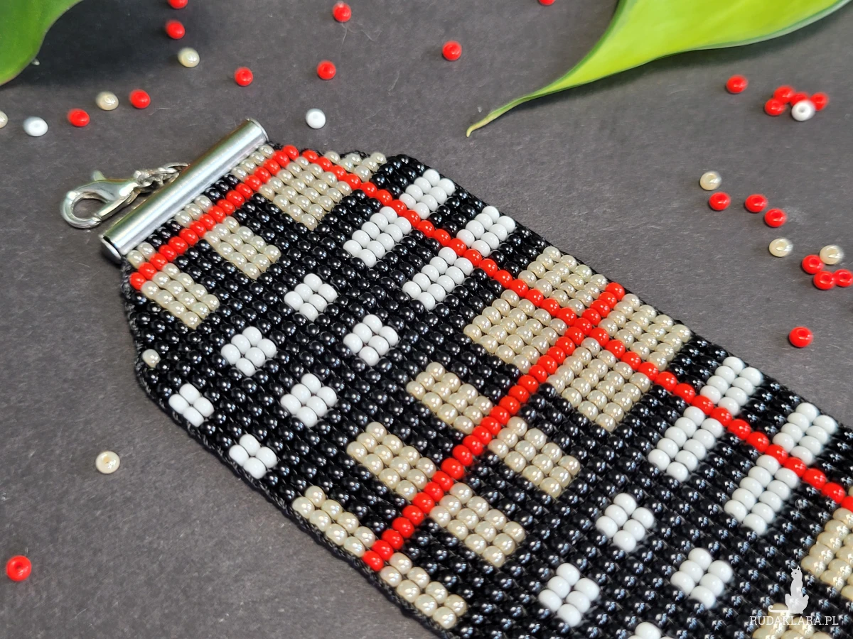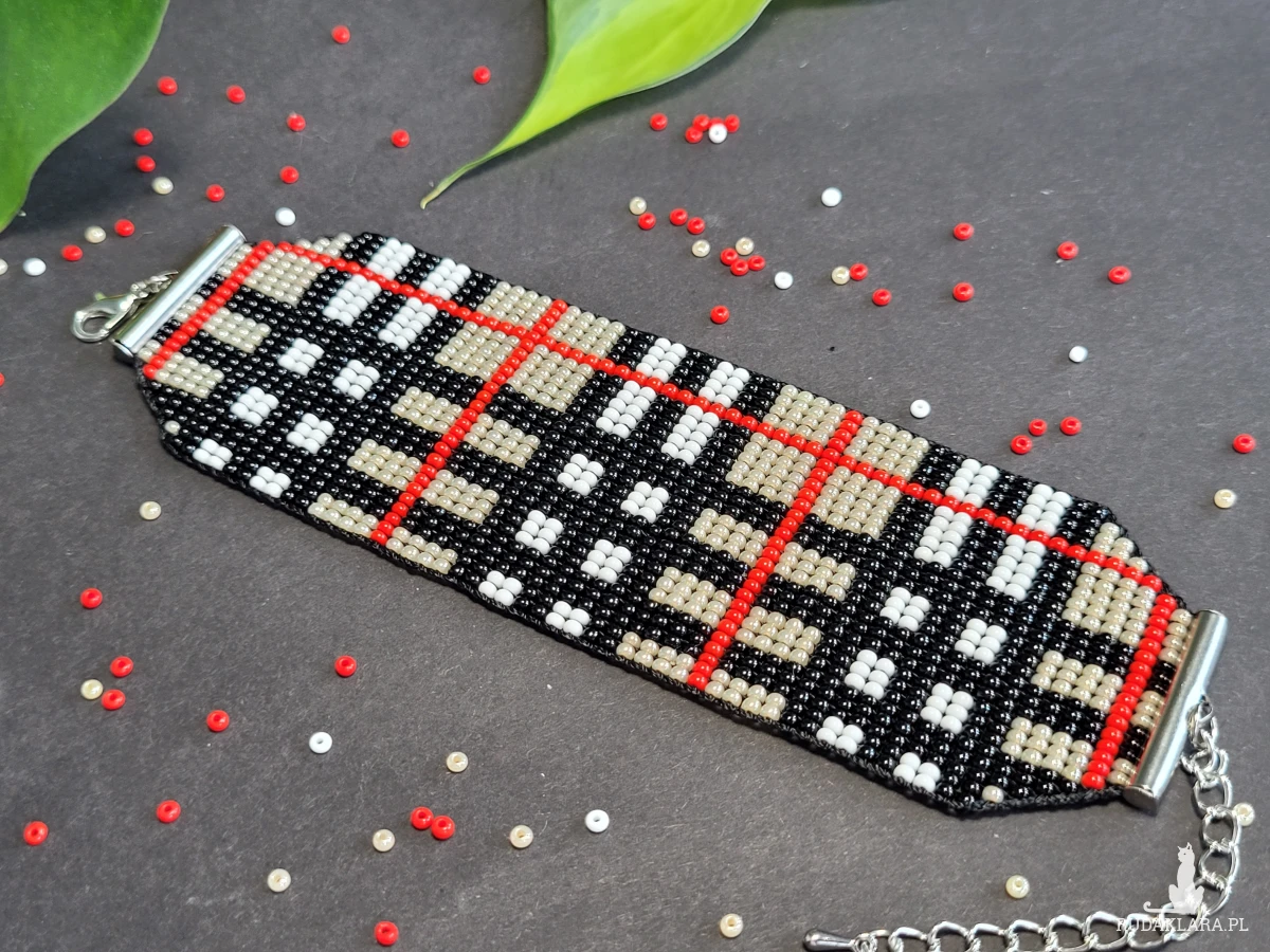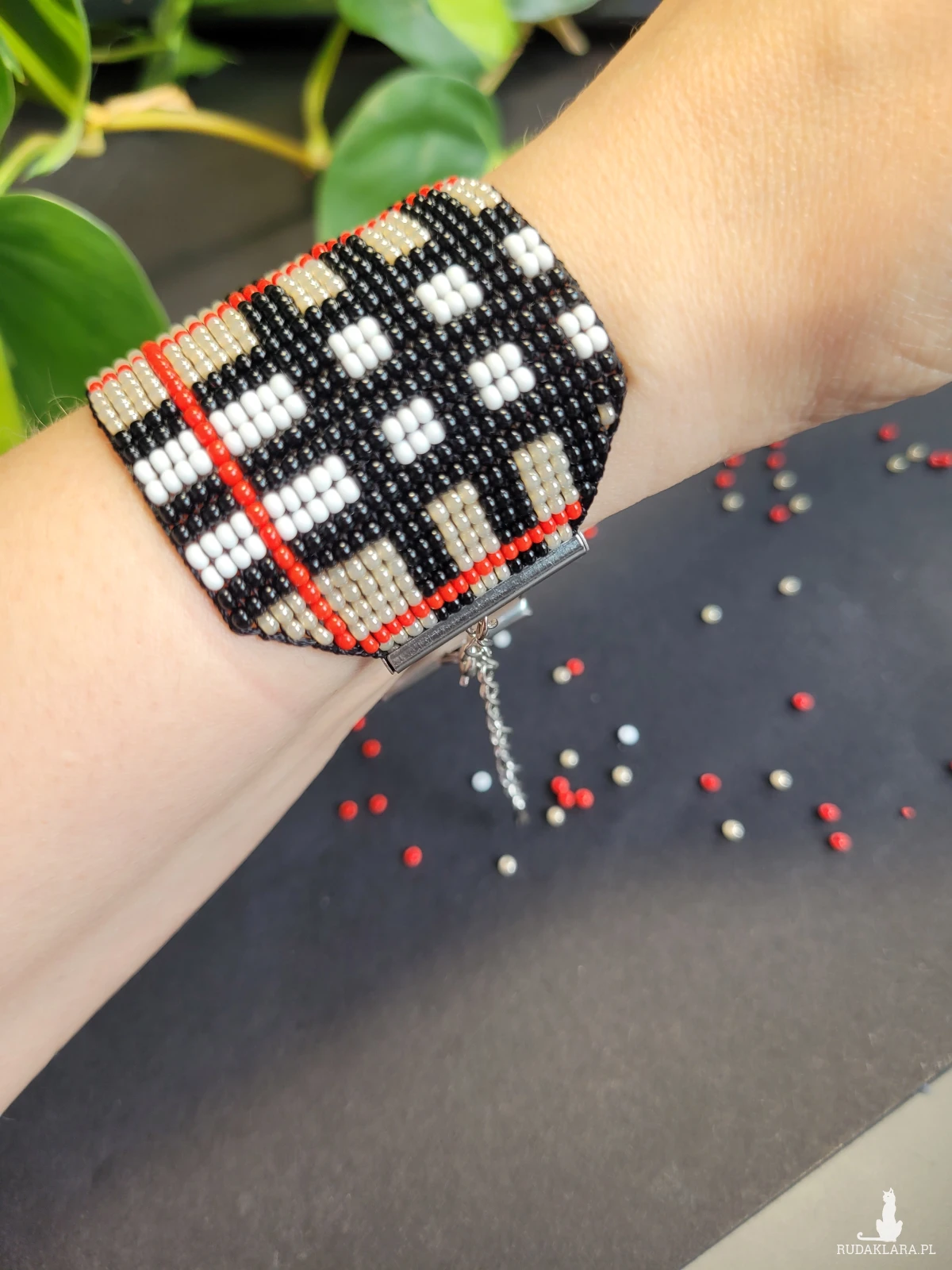 💃 Szeroka bransoletka w czarną i czerwoną kratkę własnoręcznie utkana na krosnie ze szklanych koralików czeskich Preciosa.