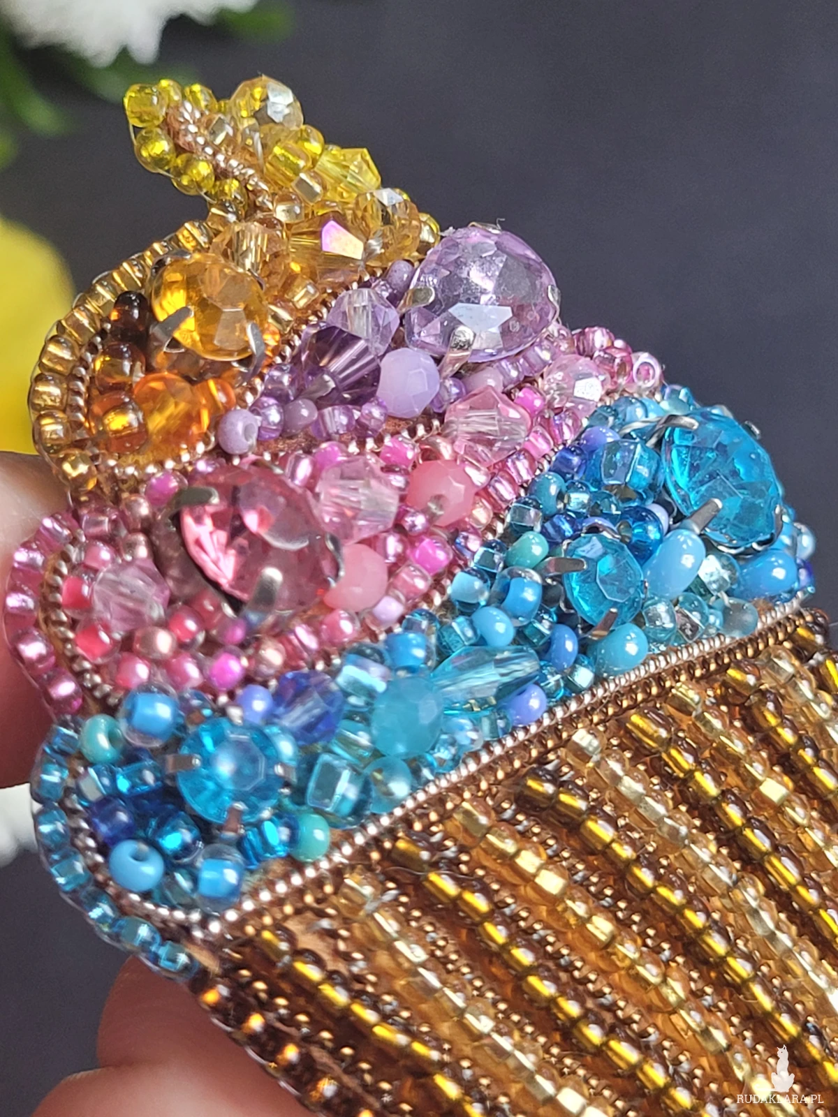 🧁 Kolorowa broszka Muffinka haftowana koralikami i krzyształkami 🧁 Ręcznie wykonana broszka w kształcie babeczki – pełna kolorowych koralików i kryształków. Idealna do kurtki, płaszcza, plecaka lub torebki! Przyciąga wzrok i dodaje uroku każdej stylizacji. 🎁 Świetny pomysł na prezent!