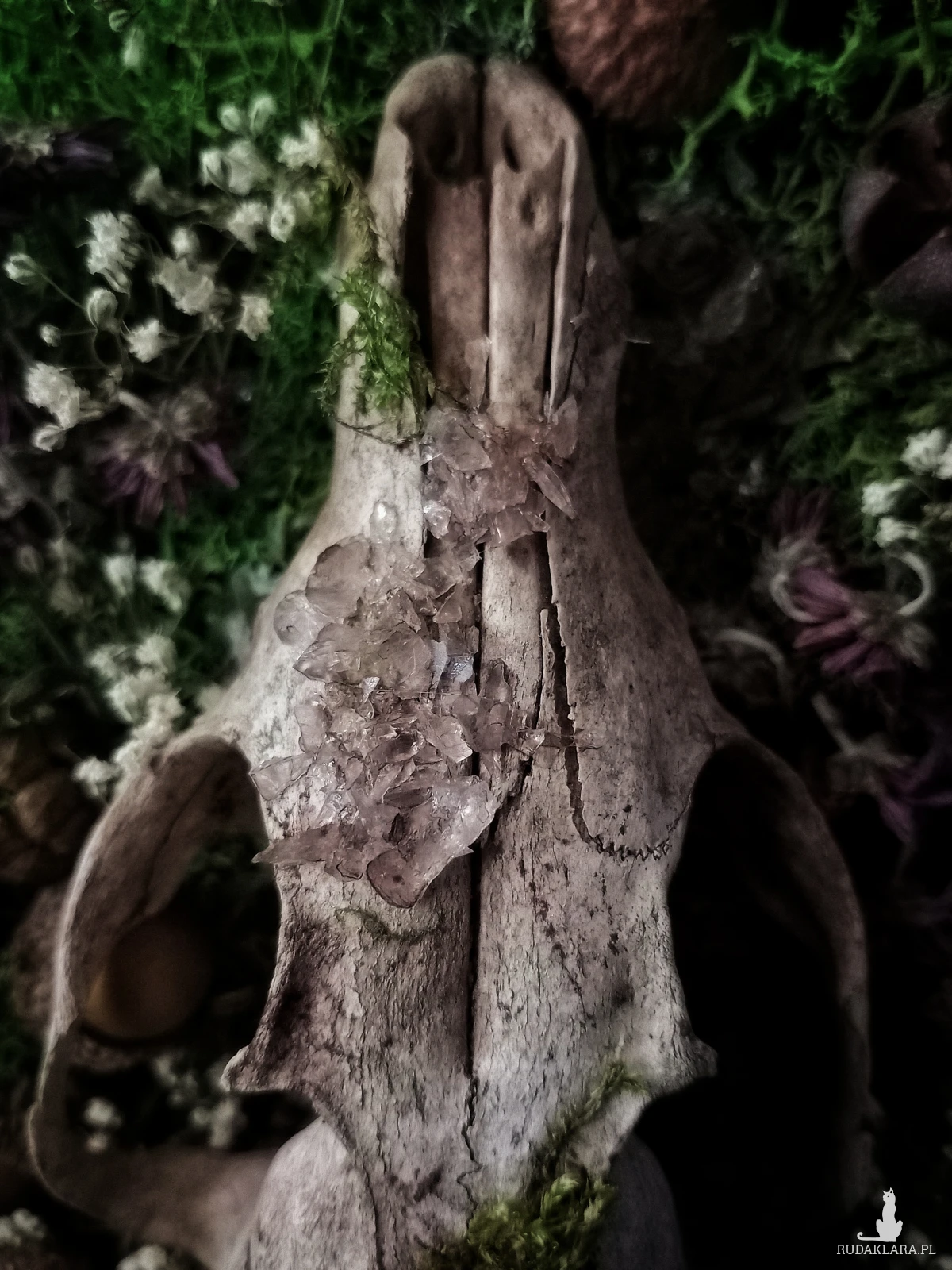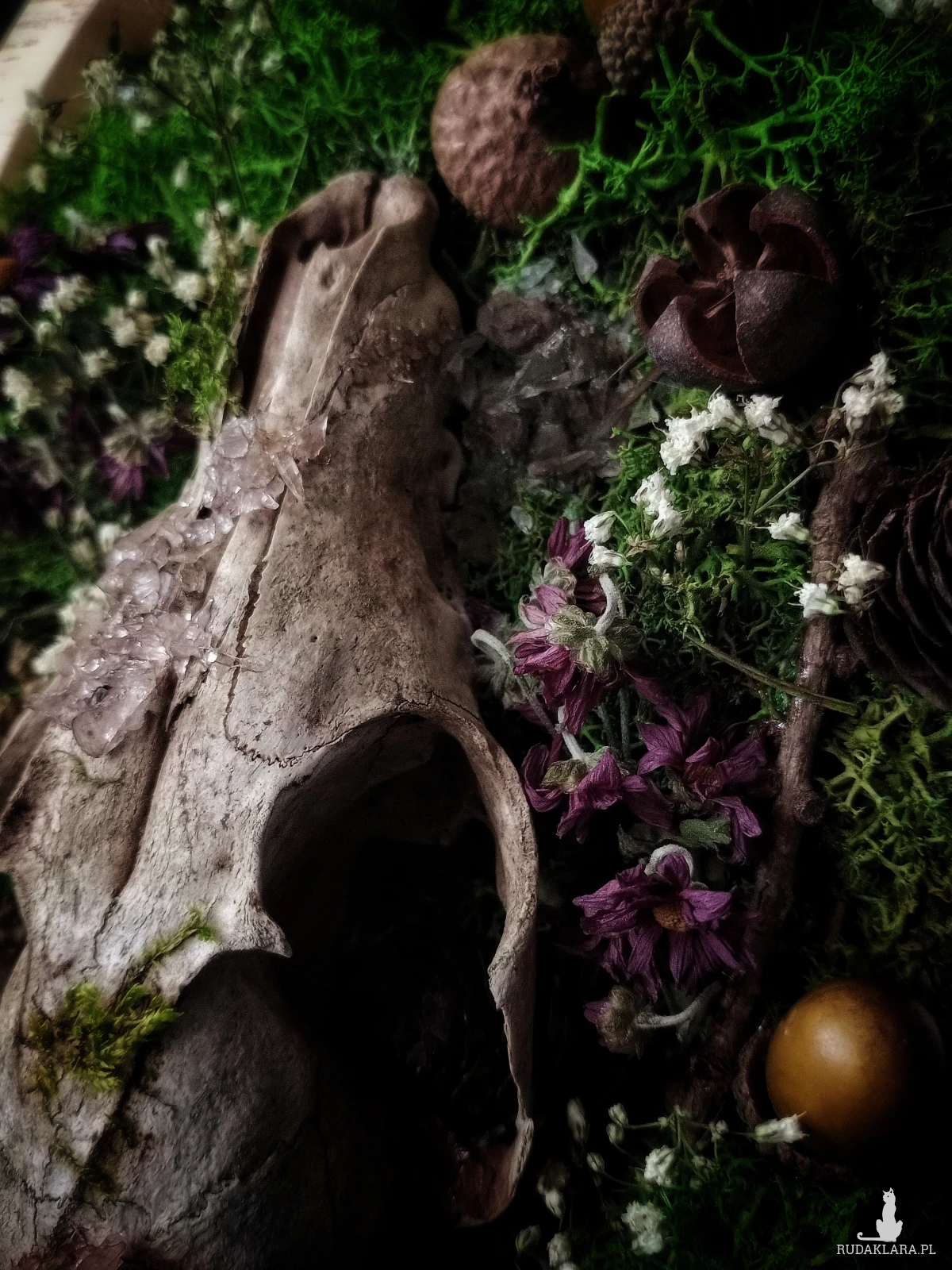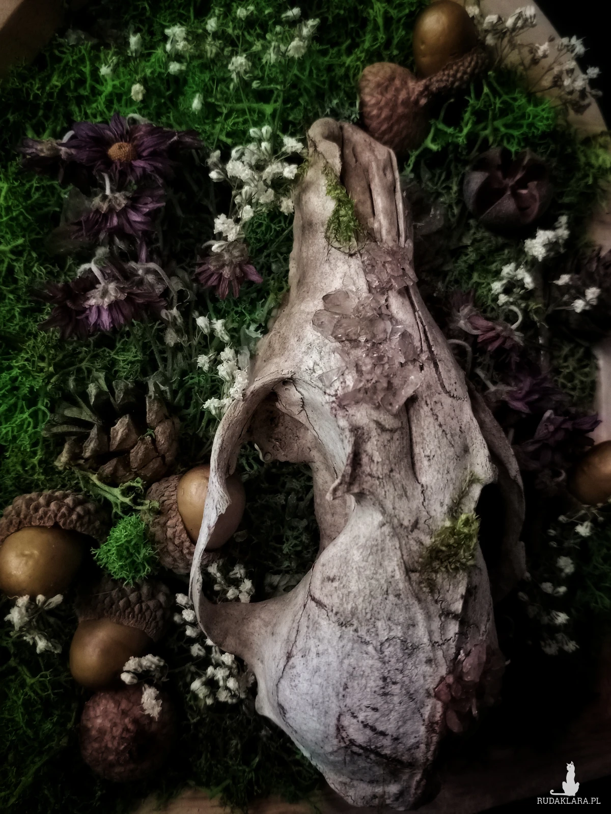 Ramka do postawienia z surowego drewna- okno na las a w nim mchy, porosty, kwiaty, kryształy górskie a w samym centrum czacha lisa.