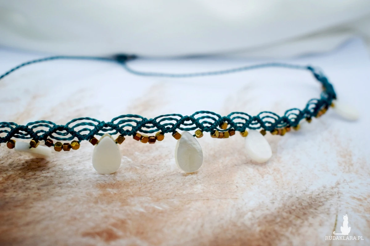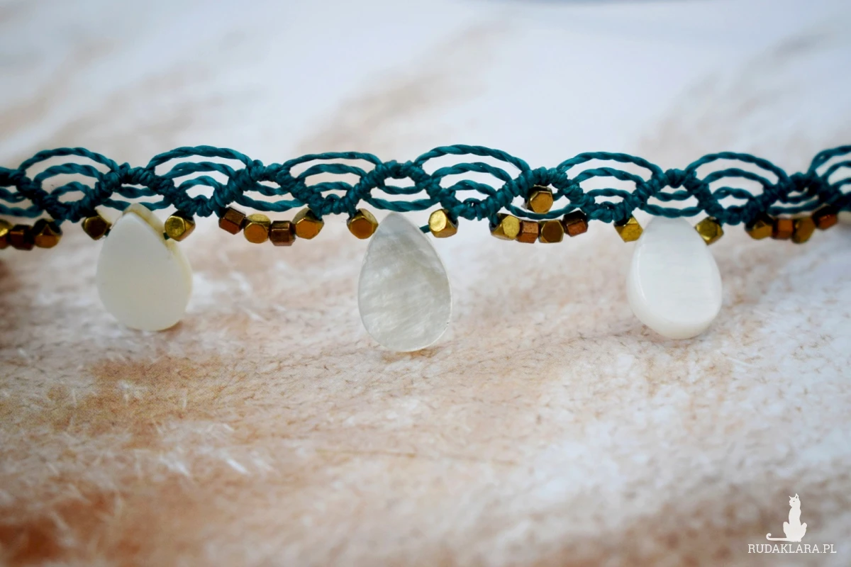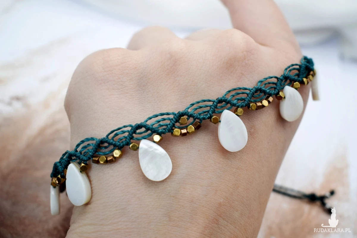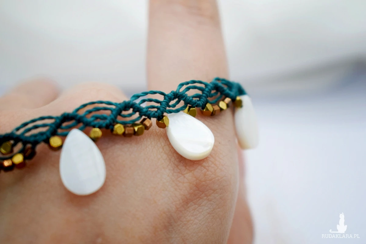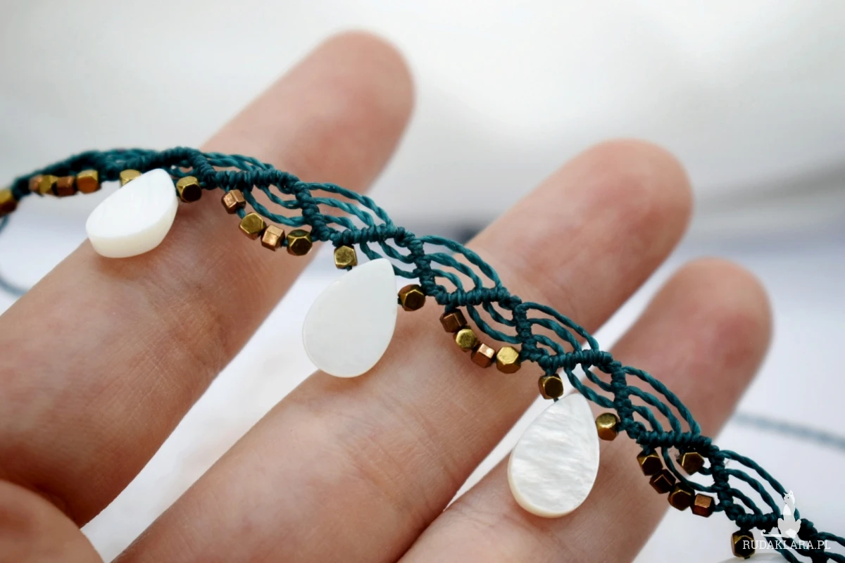 Bransoletka na stopę wykonana techniką mikro makramy.