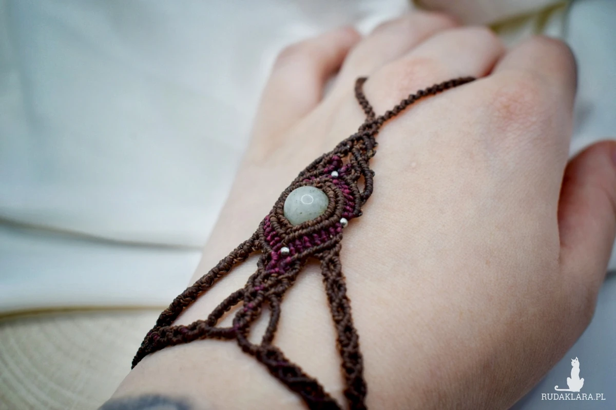 Makrama od środka nadgarstka do sznureczka który jest na palce (część z Labradorytem) Ok 11 cm.
