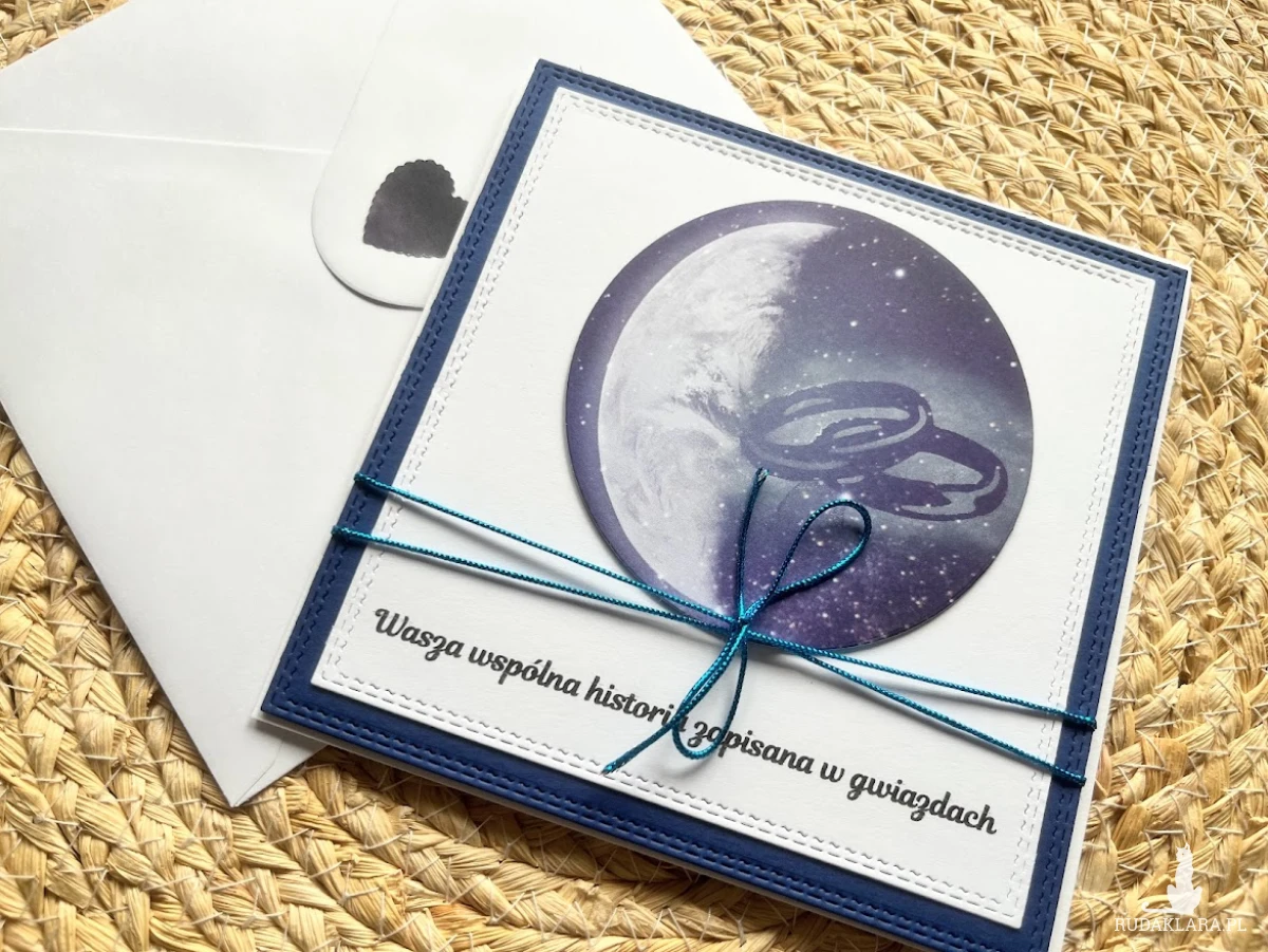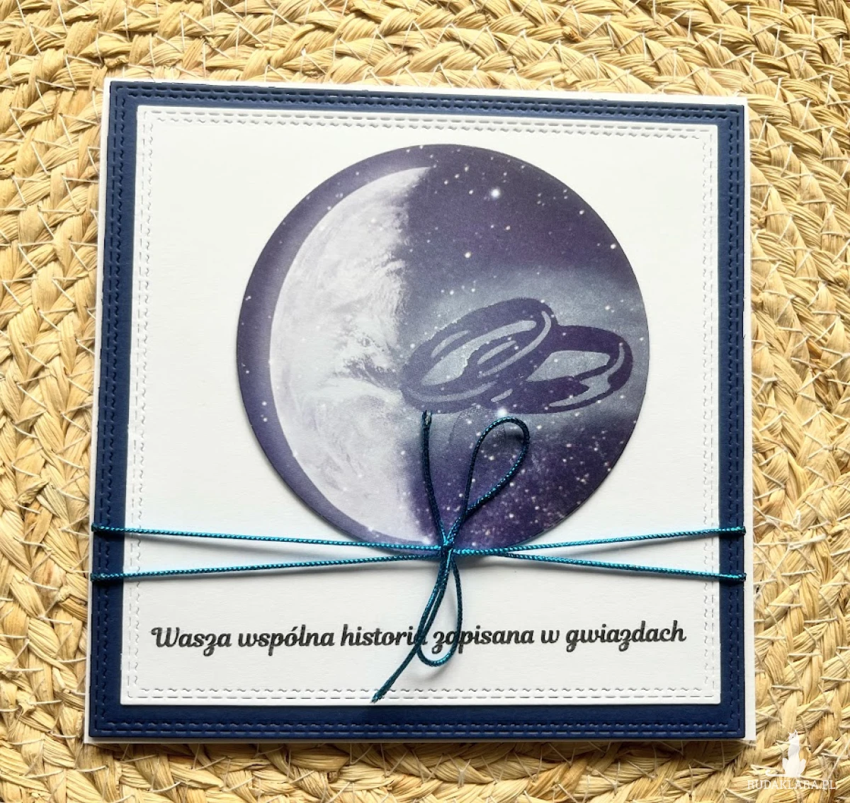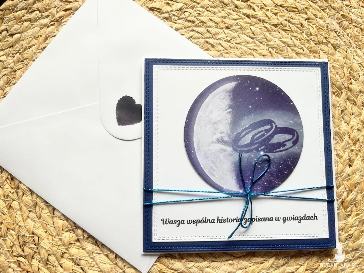 Kartka na ślub z motywem rozgwierzdzonego nieba na którym umieszczono symbol obrączek oraz tekst : Wasza wspólna historia zapisana w gwiazdach.