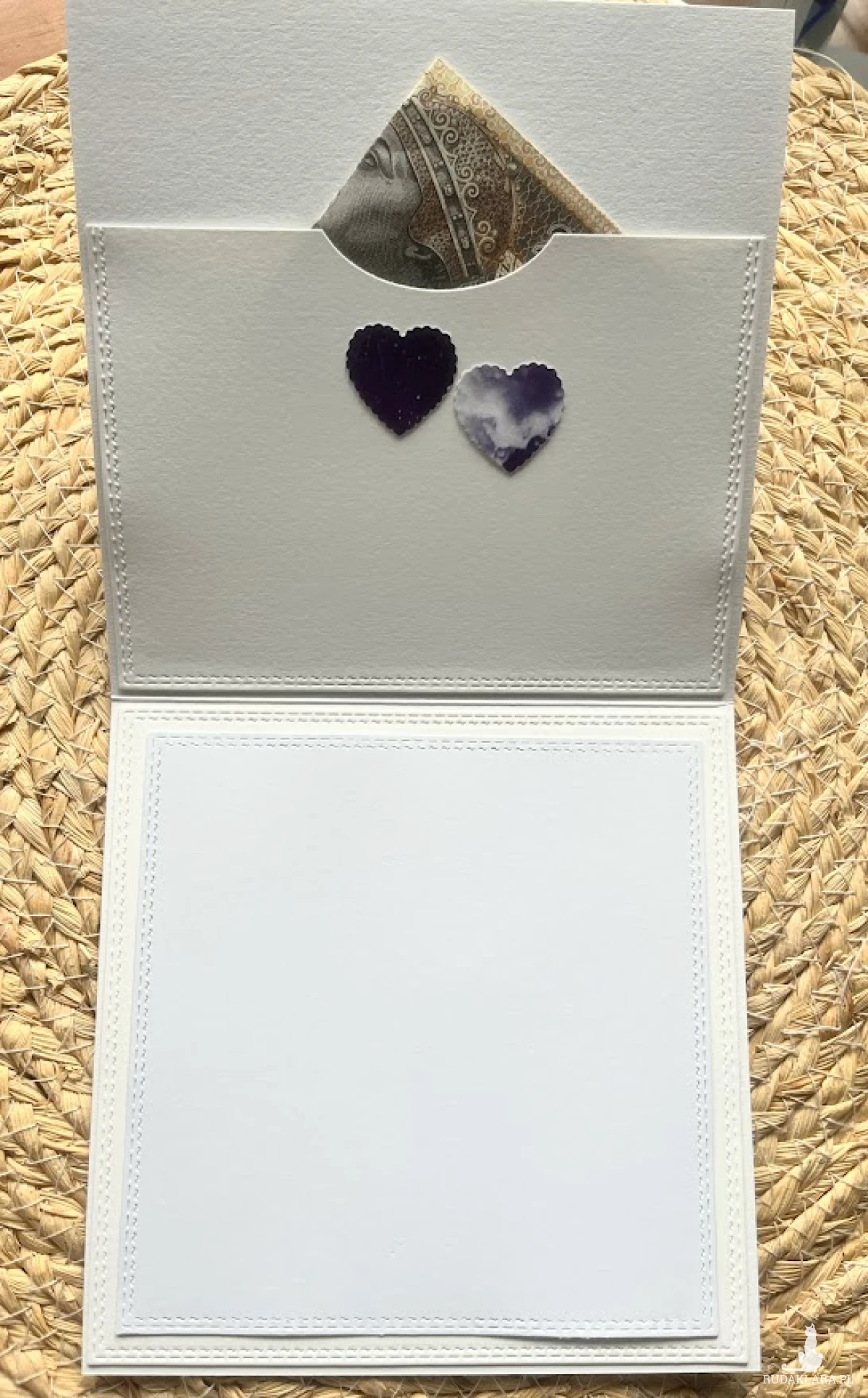 Kartka stworzona na białym papierze . Kartka ma wymiary 14x14cm . Wewnątrz kartki jest miejsce na życzenia oraz umieszczono kieszonkę na małe co nieco.