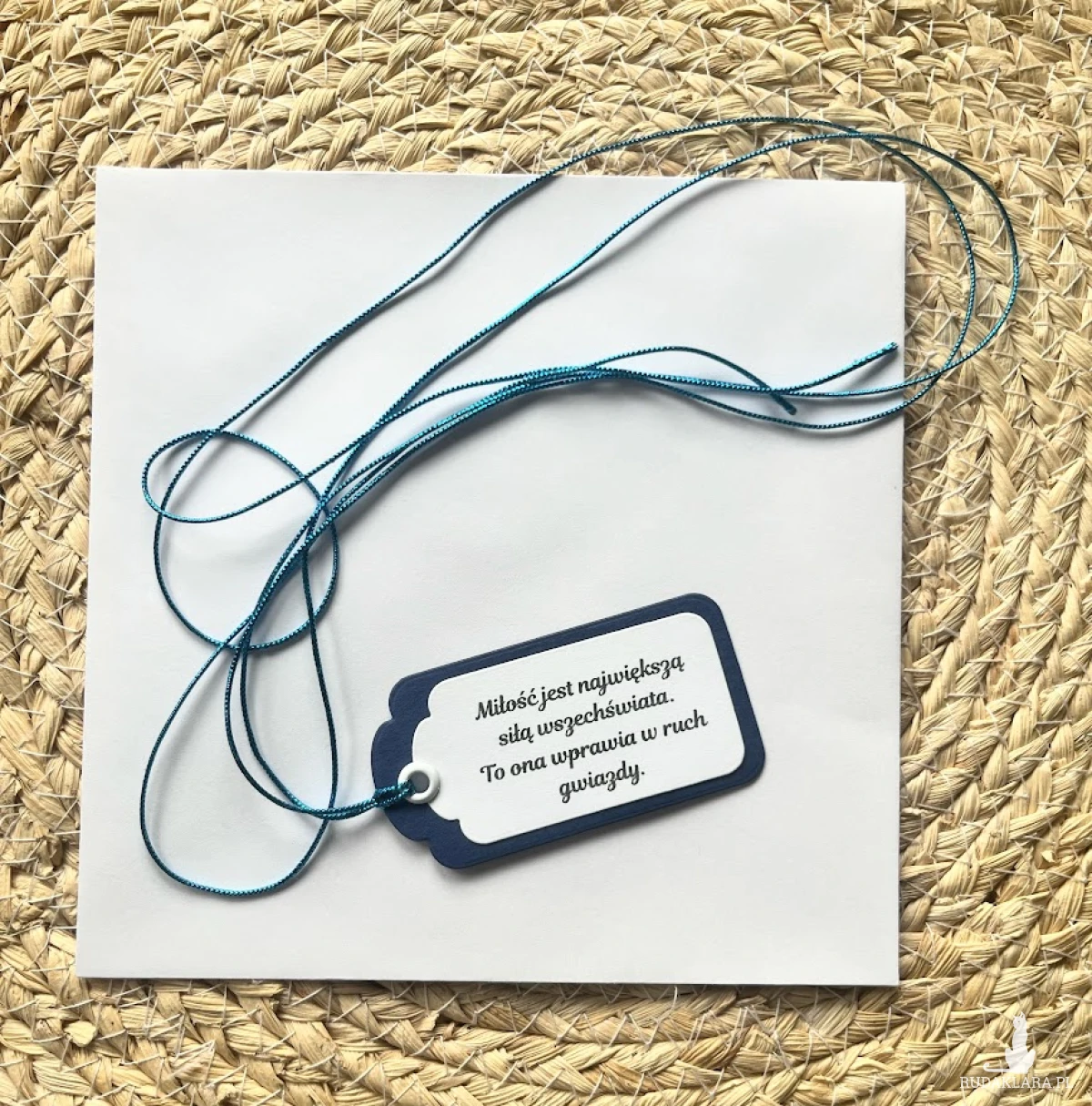 Do kartki dołączono kopertę wymiarze 15,5x15,5 cm oraz tag z cytatem do obiązania koperty.