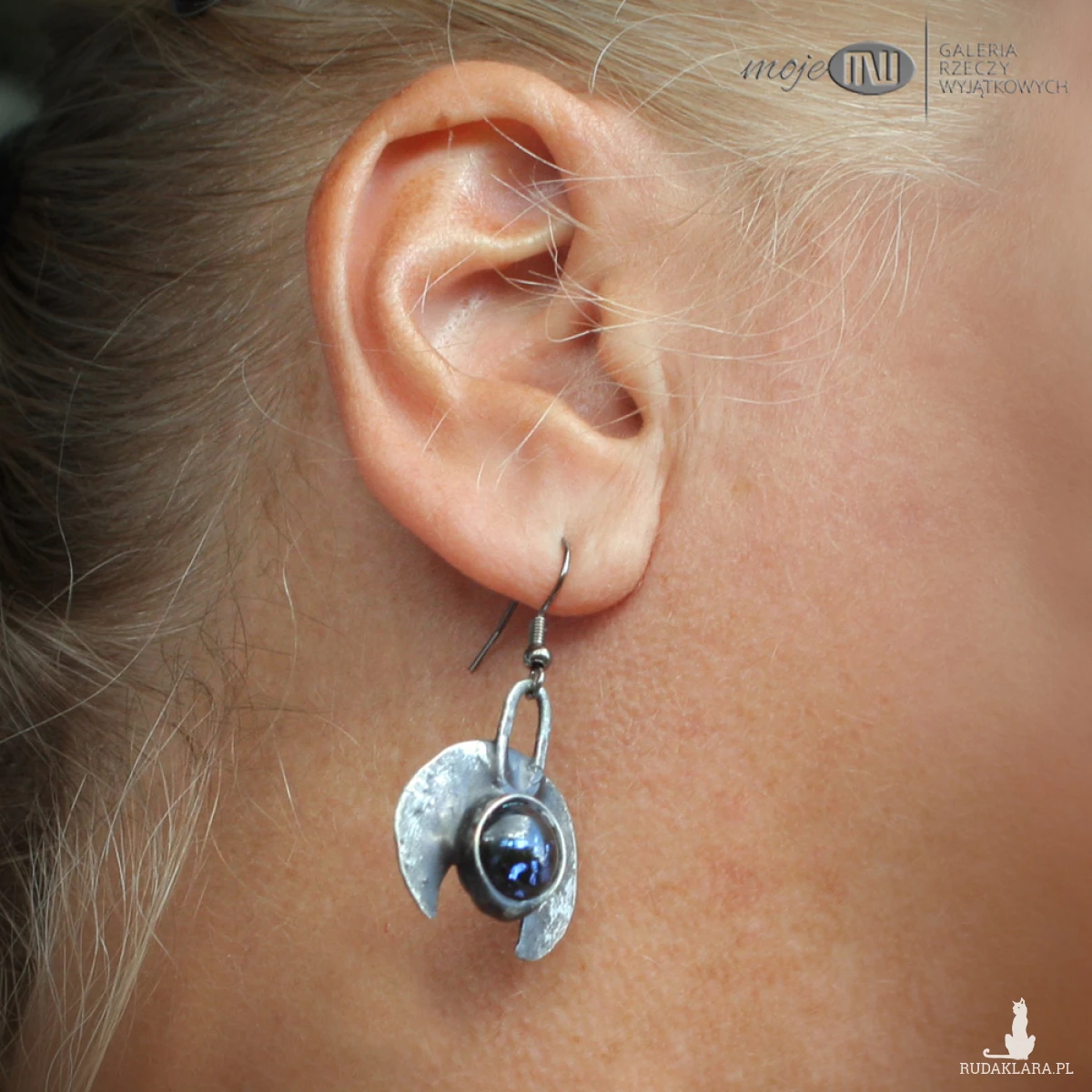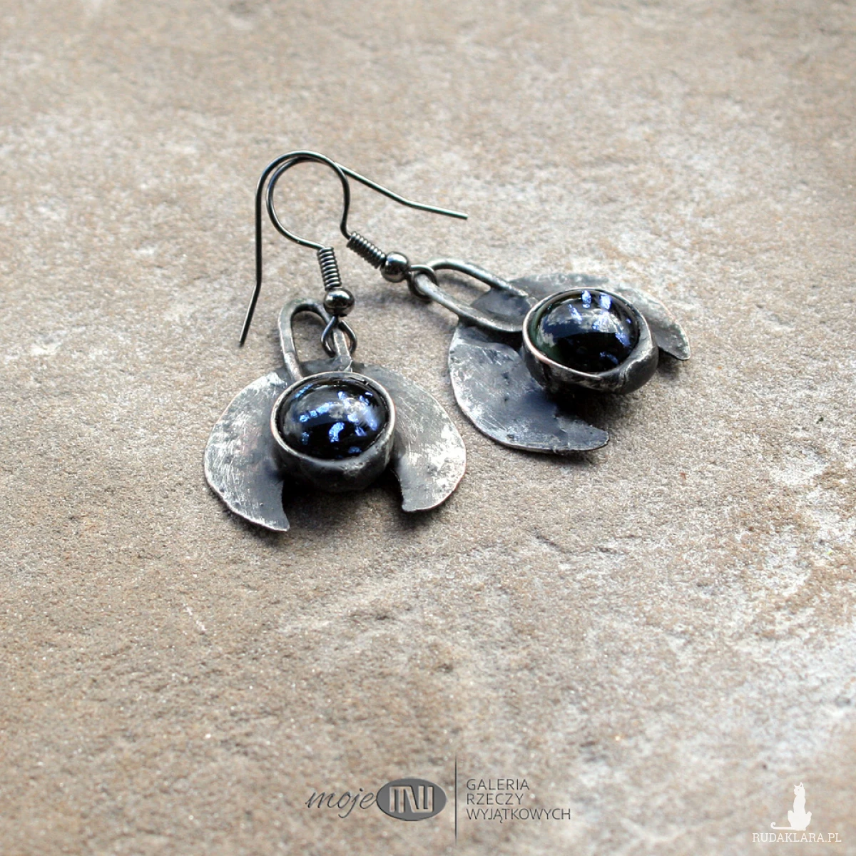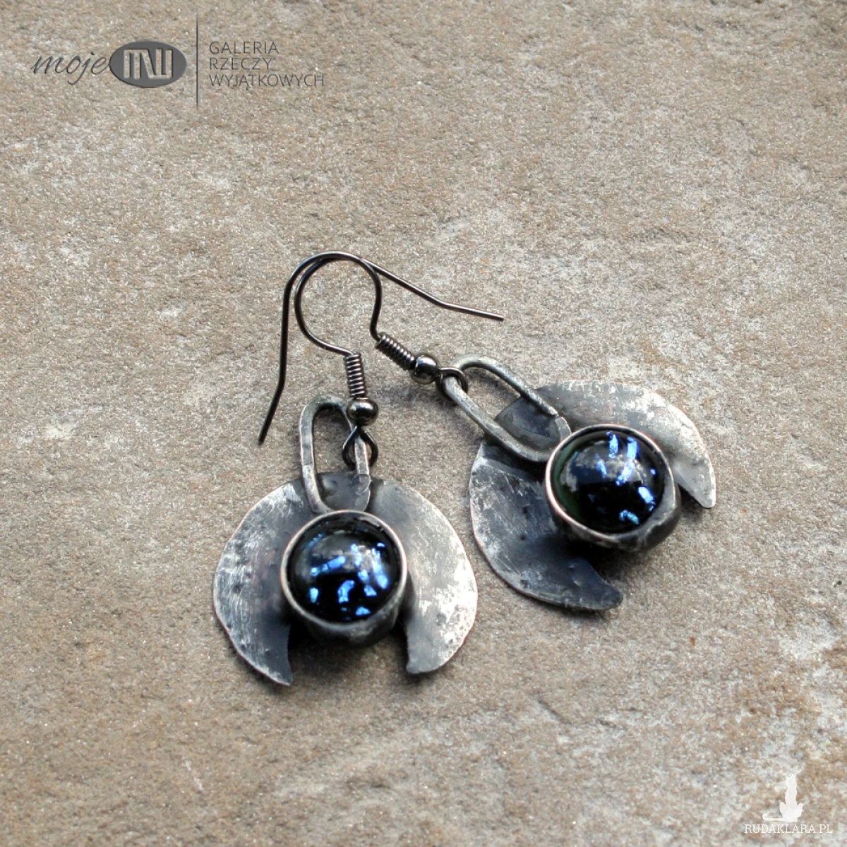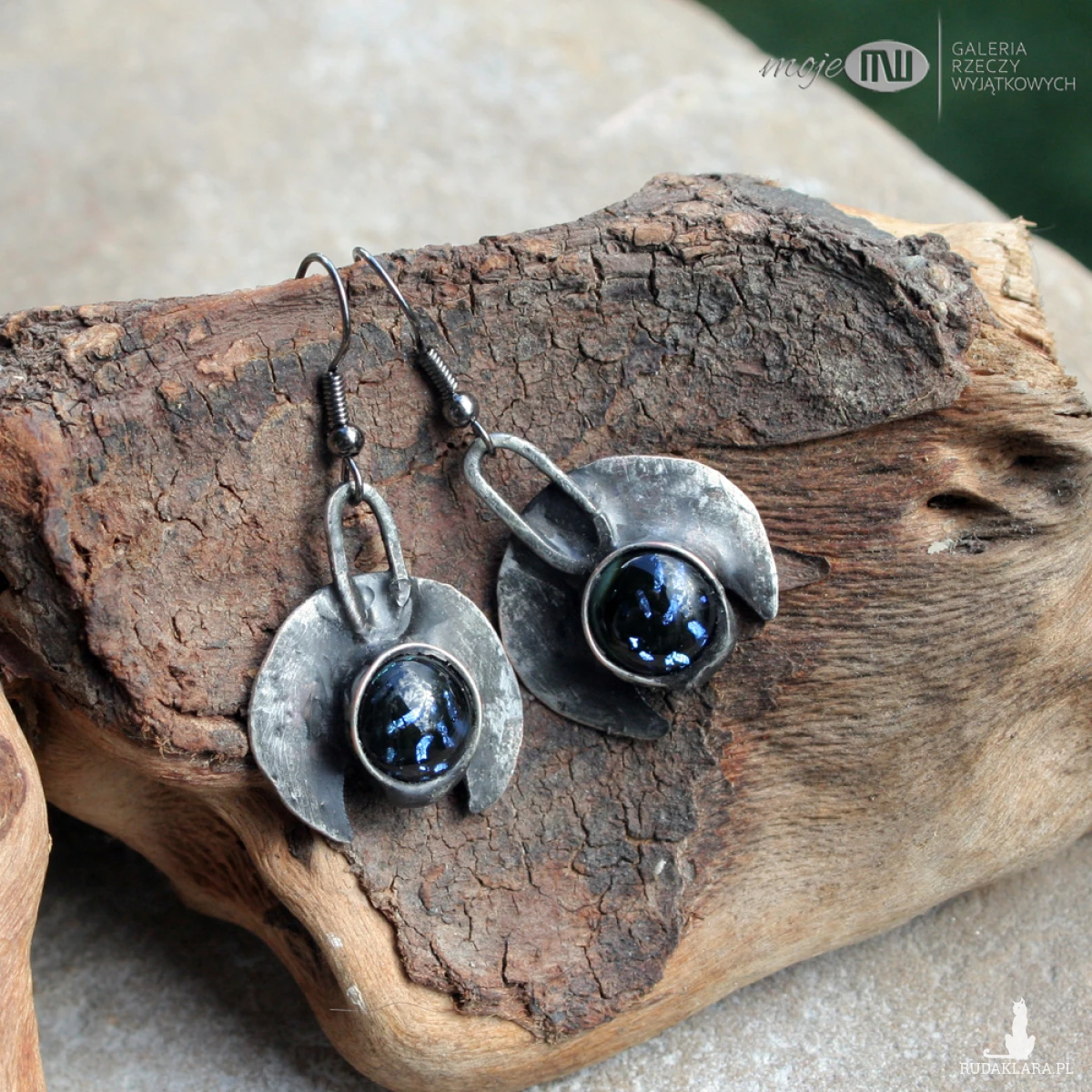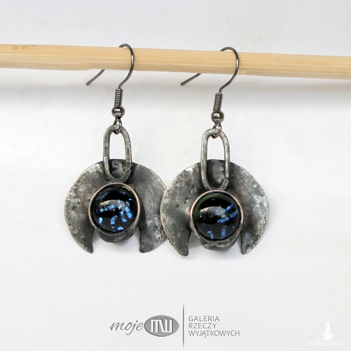 Kolczyki z motywem lunuli z miedzi pokrytej cyną, patynowanej i przecieranej. Zdobią je kaboszony ze szkła dichroicznego z niebieskimi opalizującymi drobinkami. Zawieszone na metalowych biglach w kolorze grafitowym.