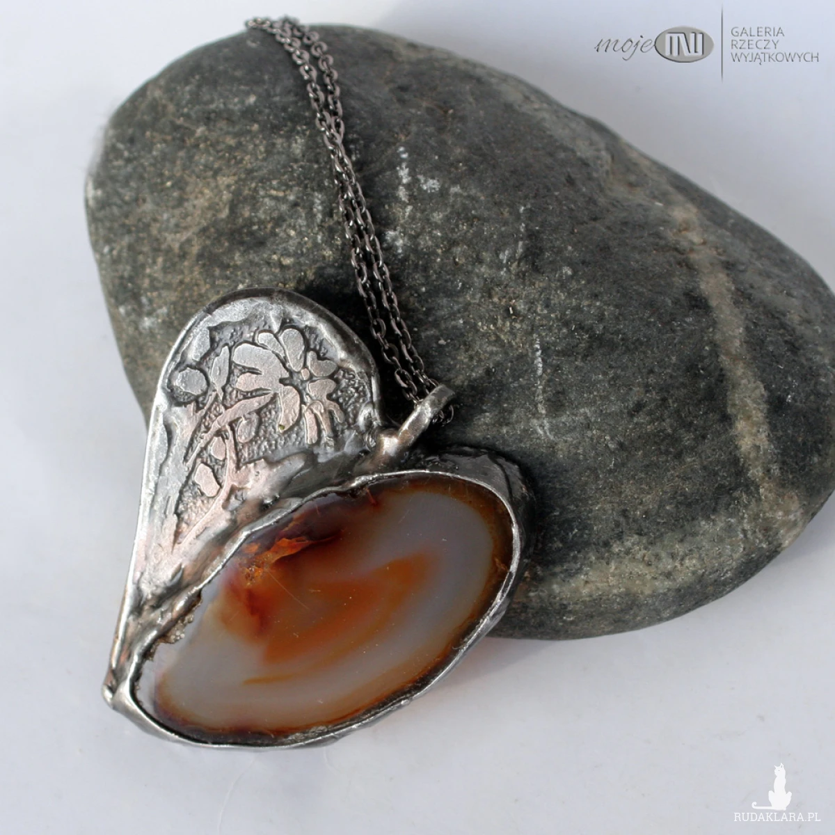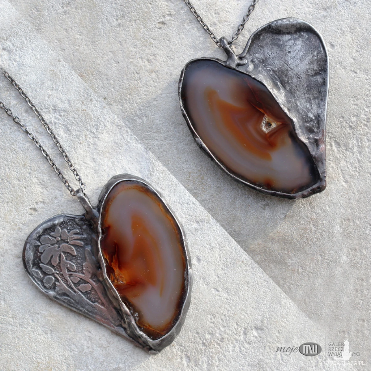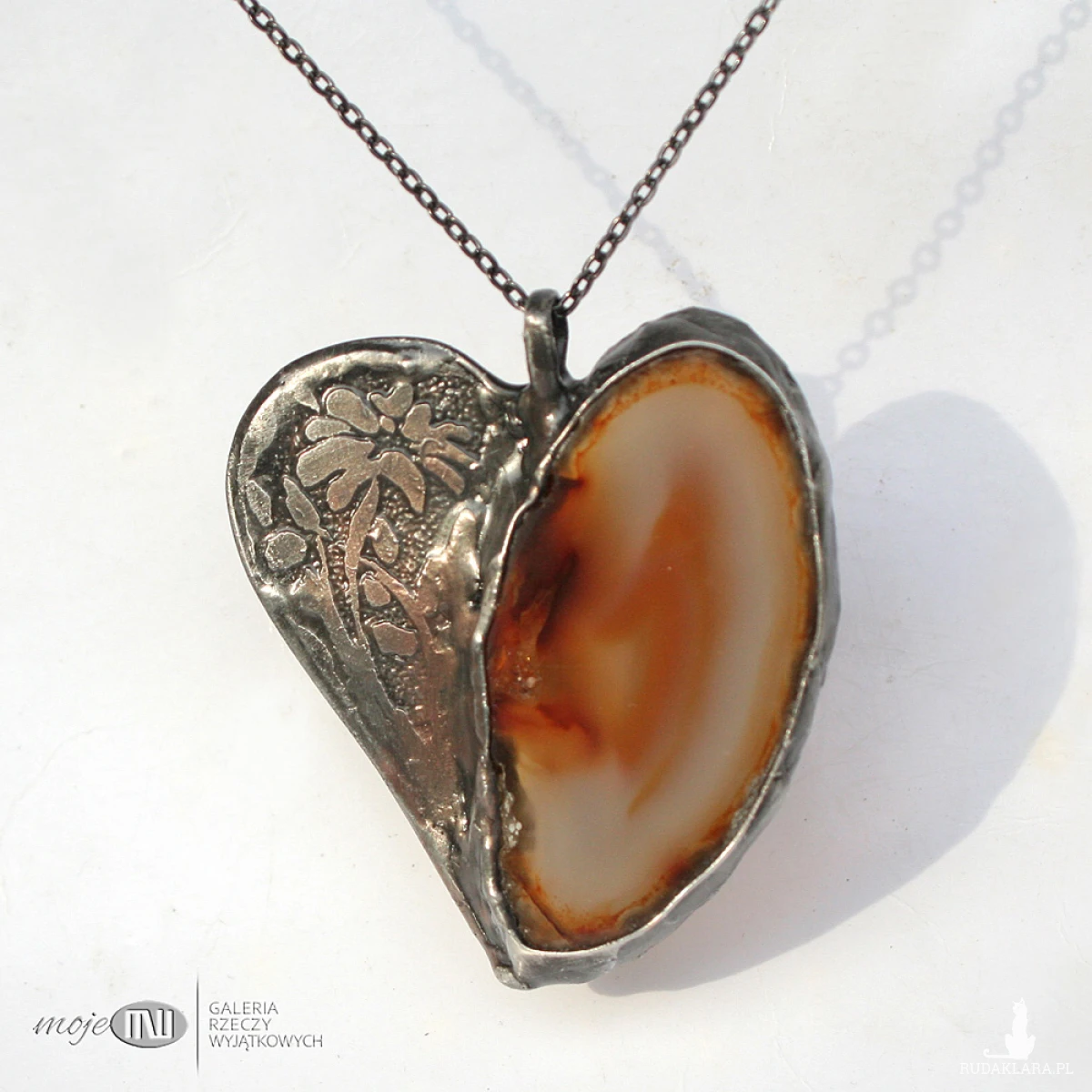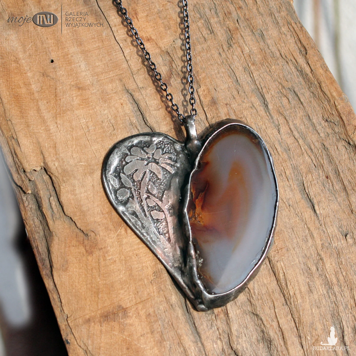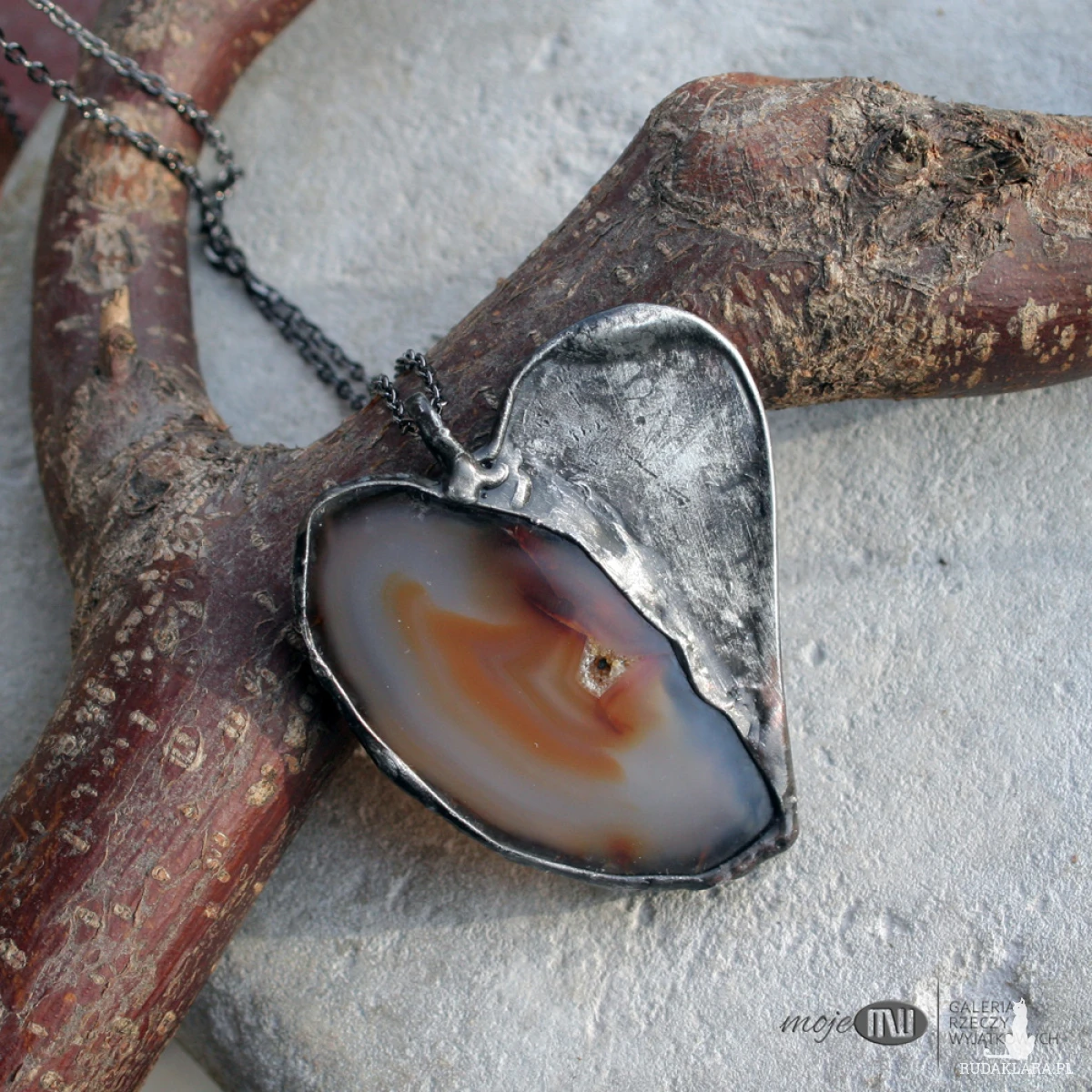Wisior w kształcie serca uformowany z plastra agatu i miedzi. Agat jest w brązowo-beżowym kolorze. Oprawiony i wykończony jest trawioną miedzią - cynowaną, patynowaną i przecieraną. Wisior zawieszony jest na łańcuszku w kolorze grafitowym. Zazwyczaj dodaję łańcuszek o długości ok. 60-70 cm, ale klient może podać długość, która go interesuje.