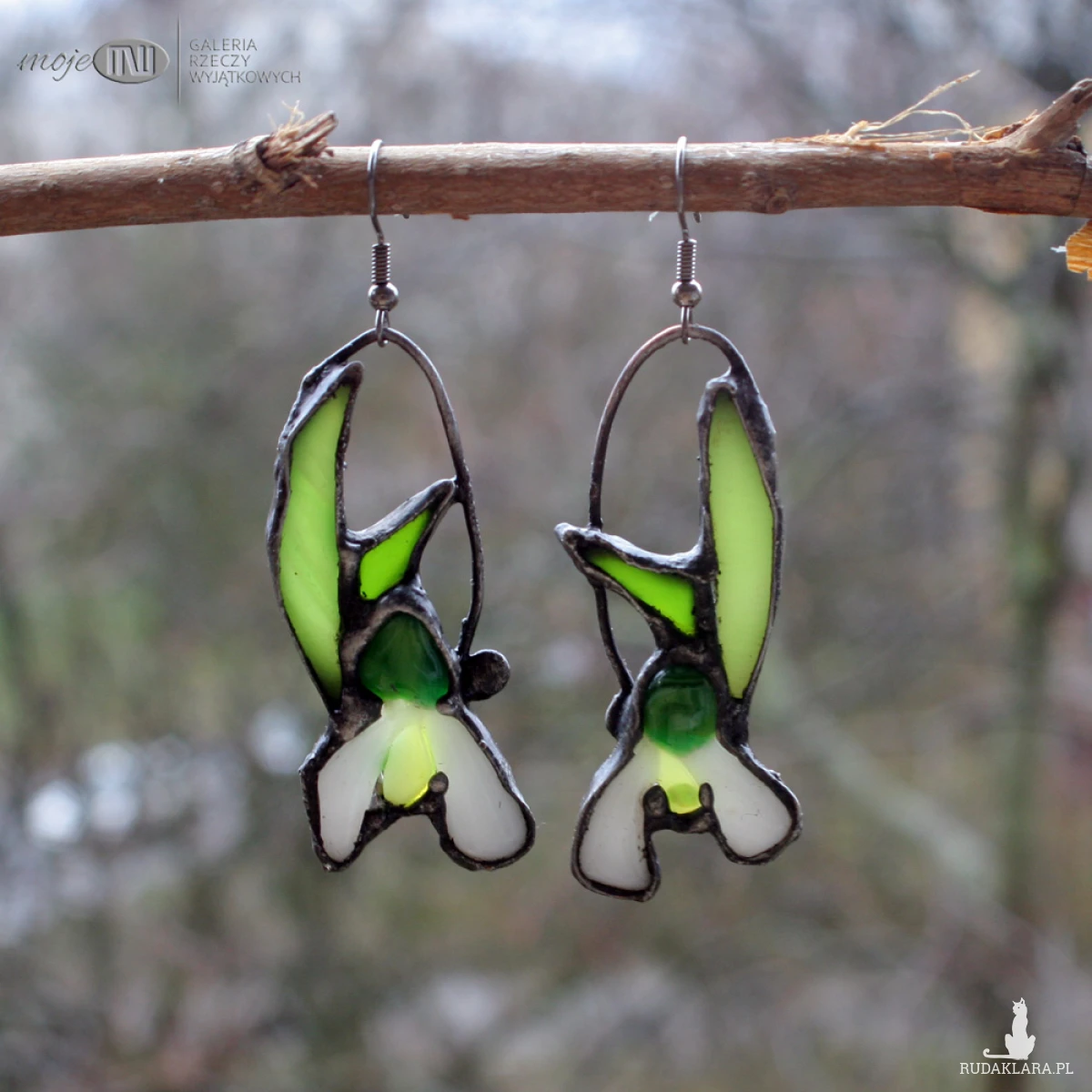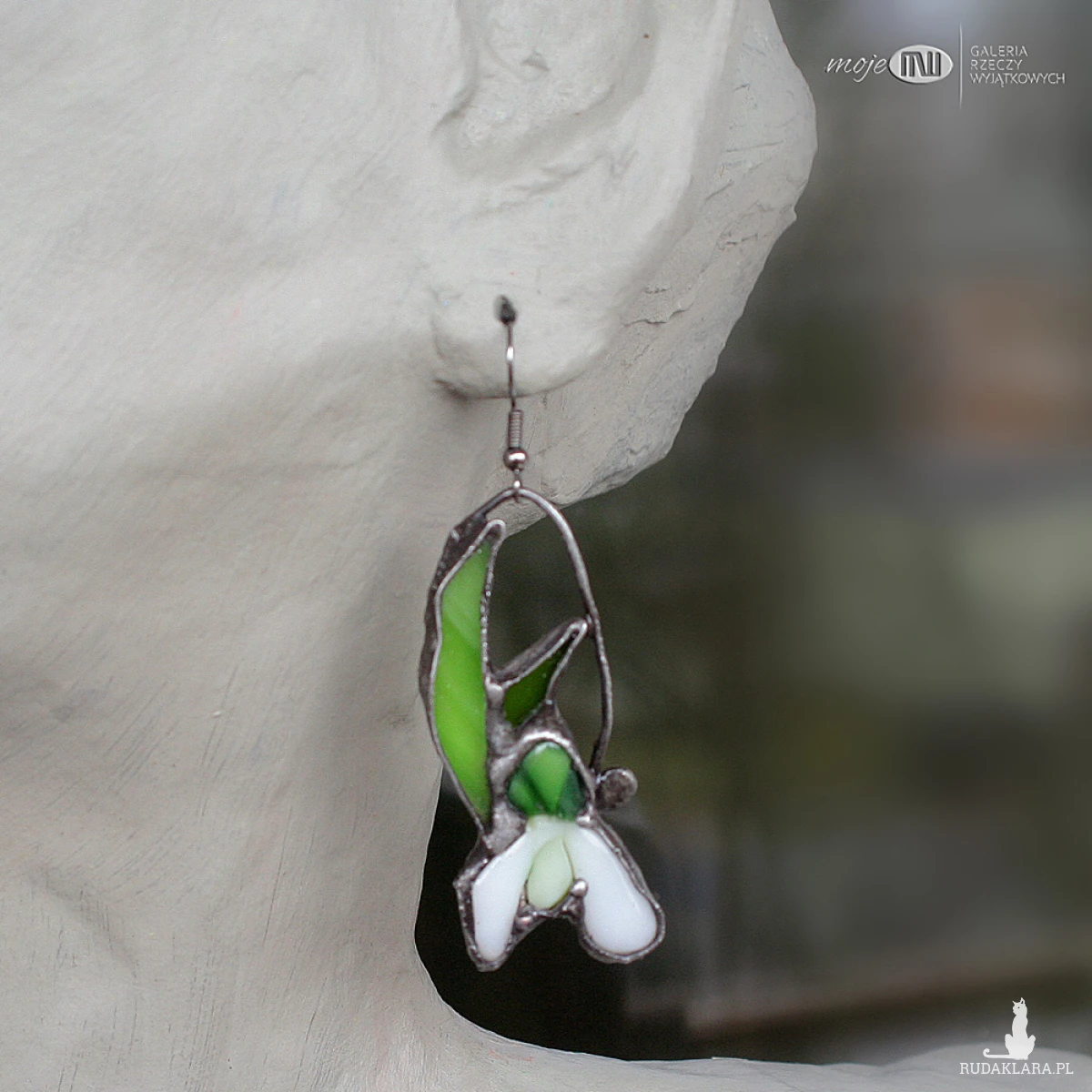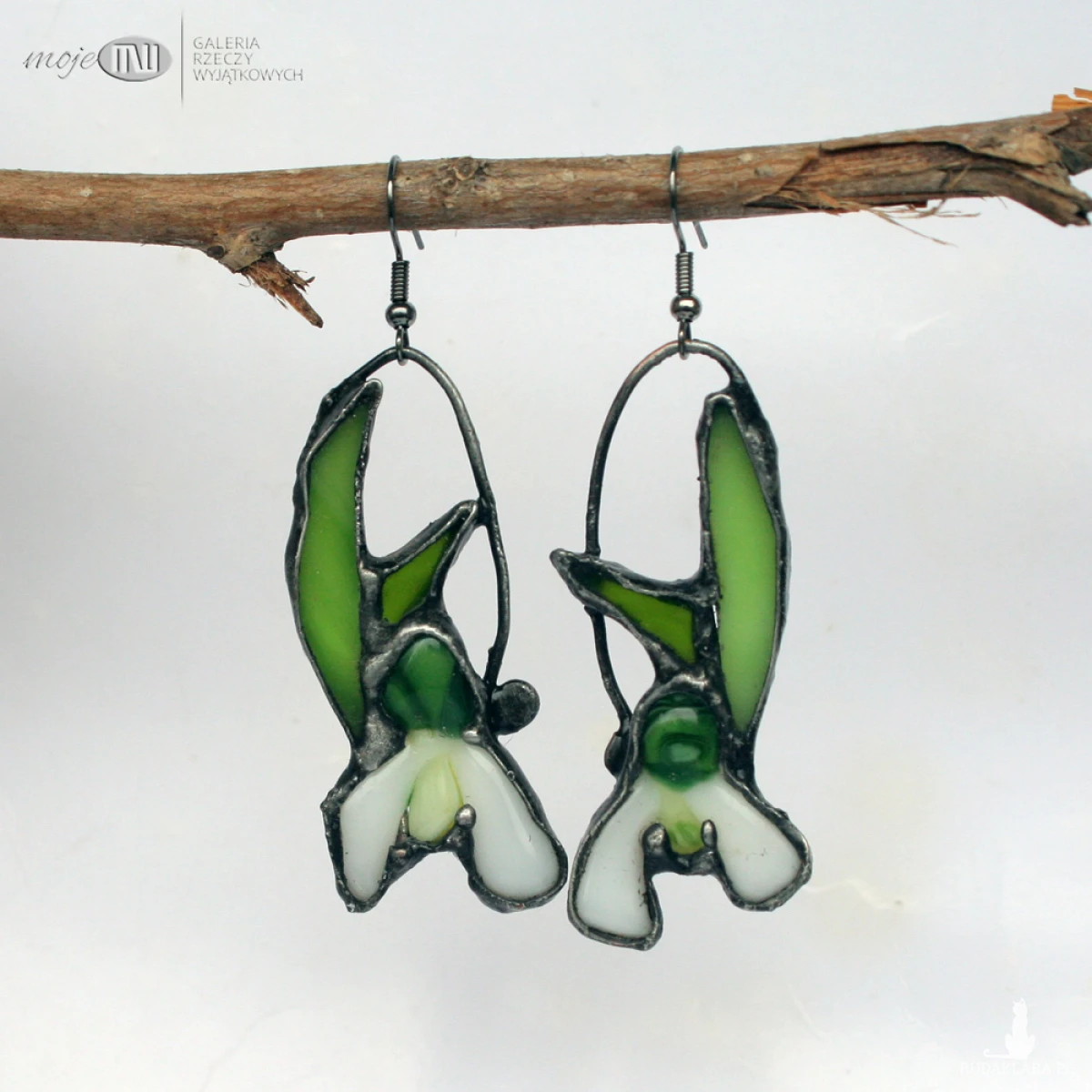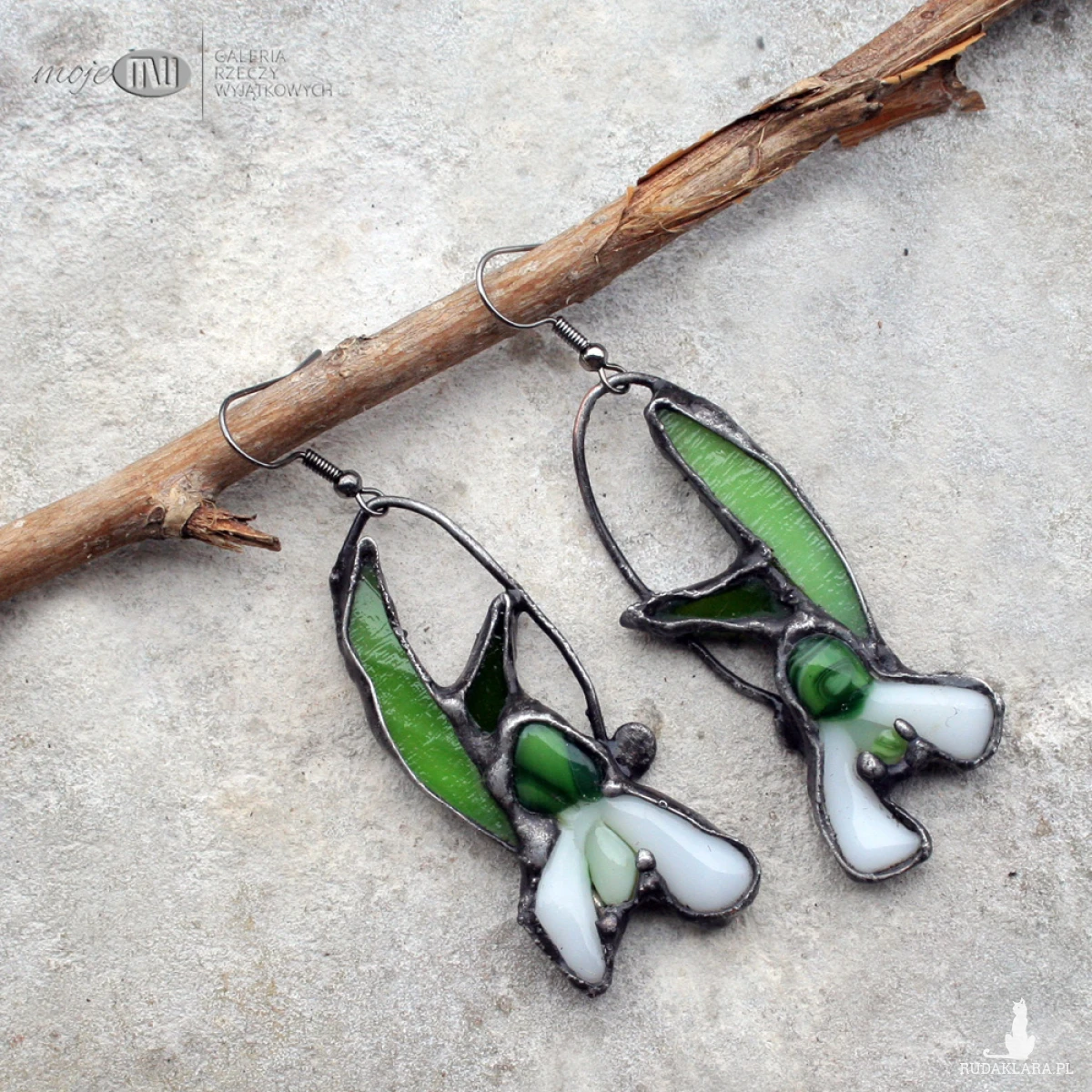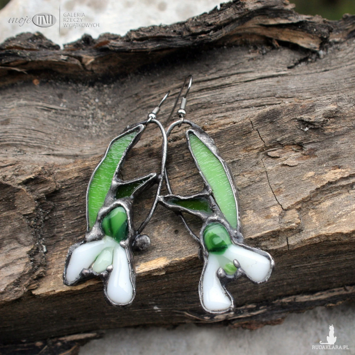 Wiosenne kolczyki z białego i zielonego szkła w formie stylizowanych kwiatków przebiśniegów. Dostały szklany listek i oprawę w miedź pokrytą cyną, patynowaną i przecieraną.