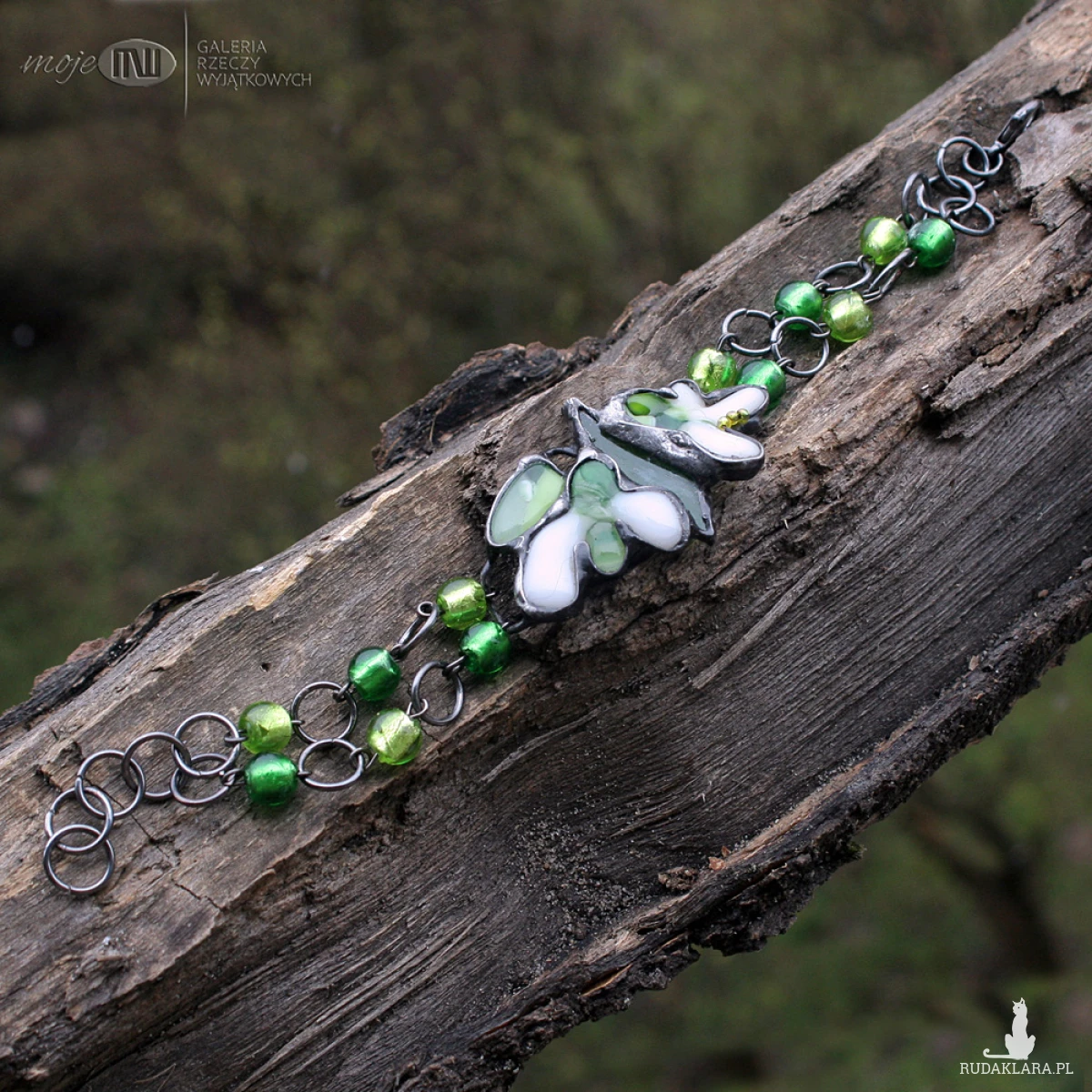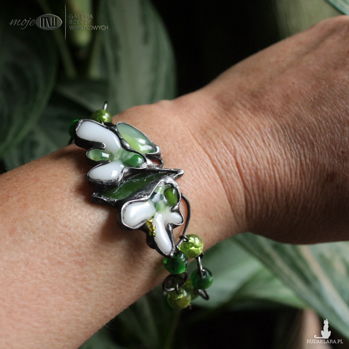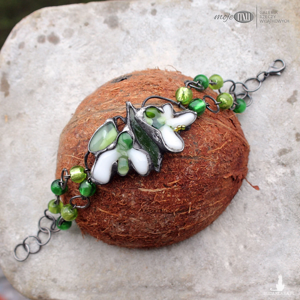 Bardzo wiosenna bransoleta z kwiatami przebiśniegów. Kwiaty wytopiłam metodą fusingu. Oprawione są w miedź pokrytą cyną. Kolorem dopełniają je szklane okrągłe korale w jasnej i ciemnej zieleni, połyskujące.