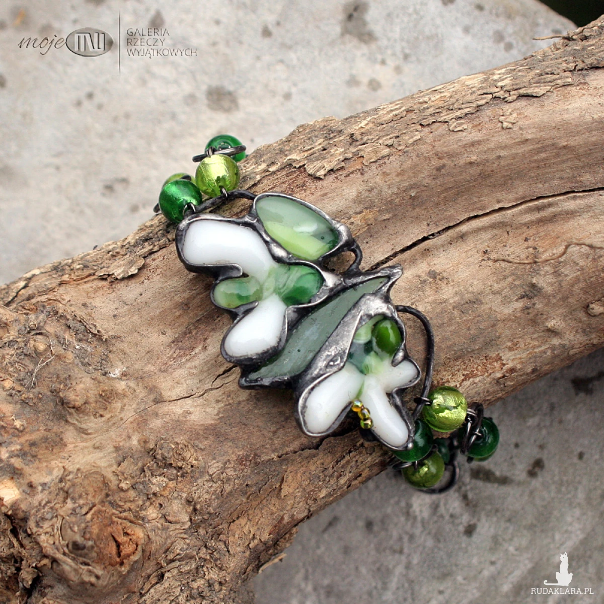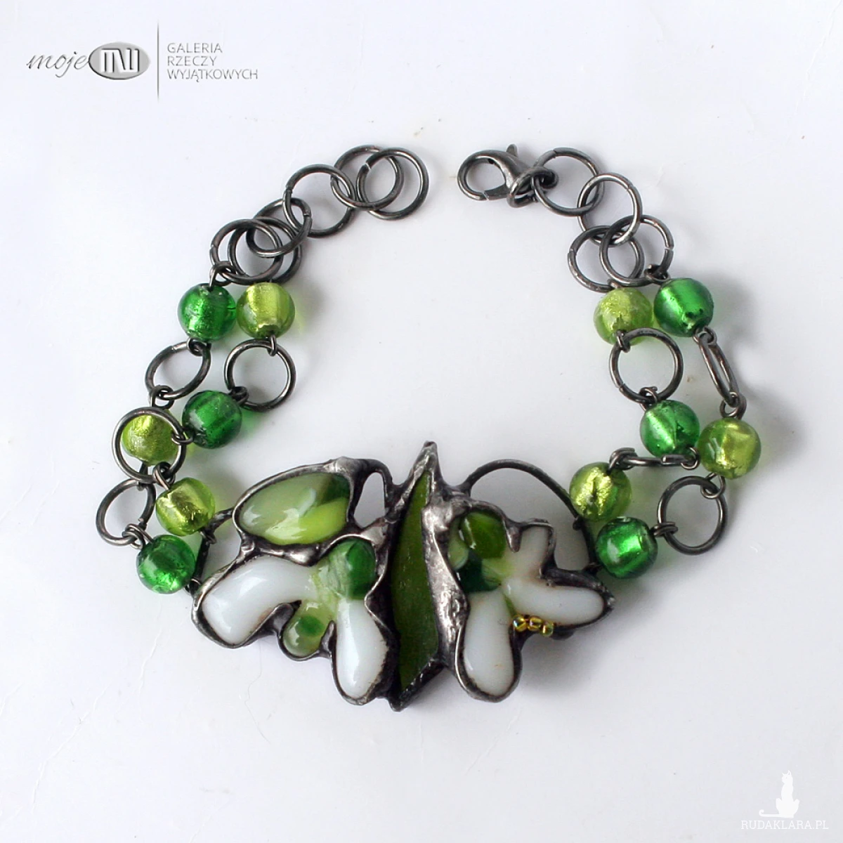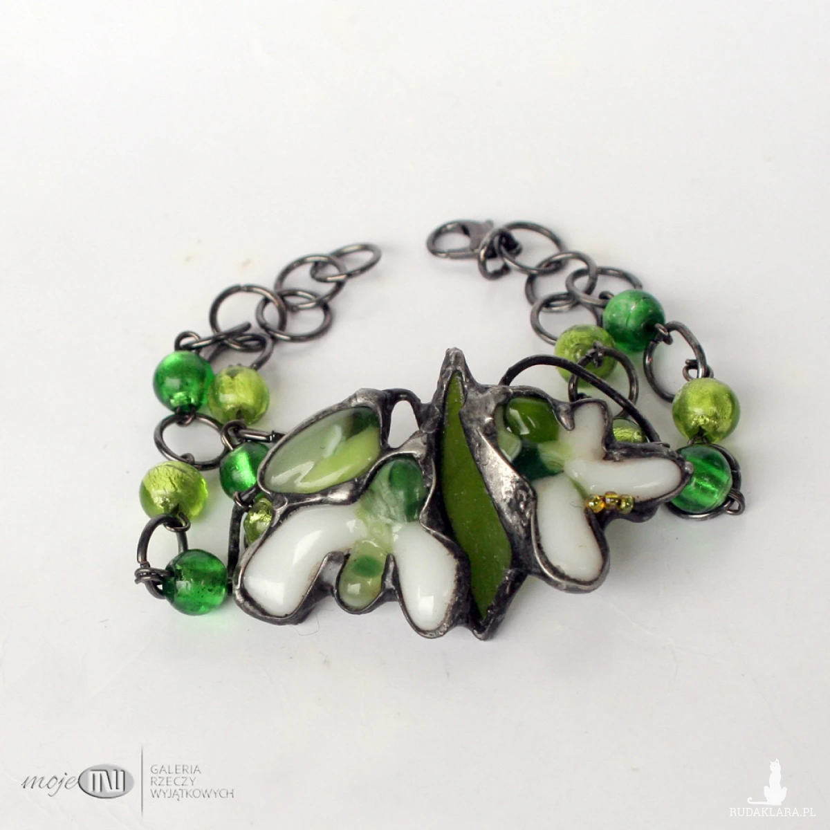 Bardzo wiosenna bransoleta z kwiatami przebiśniegów. Kwiaty wytopiłam metodą fusingu. Oprawione są w miedź pokrytą cyną. Kolorem dopełniają je szklane okrągłe korale w jasnej i ciemnej zieleni, połyskujące.