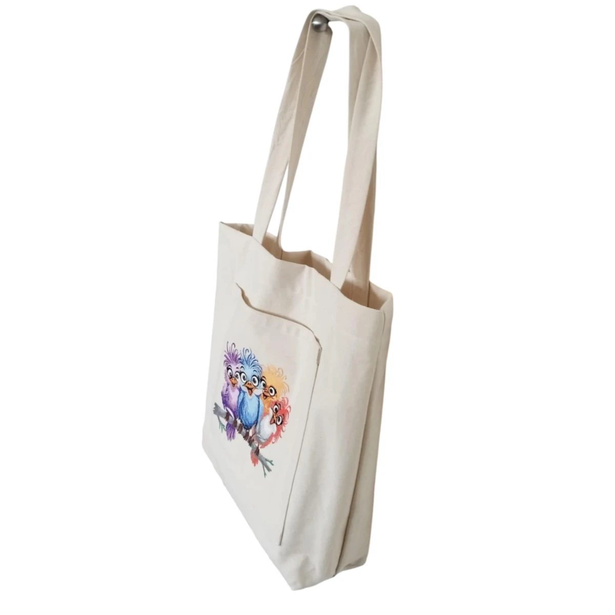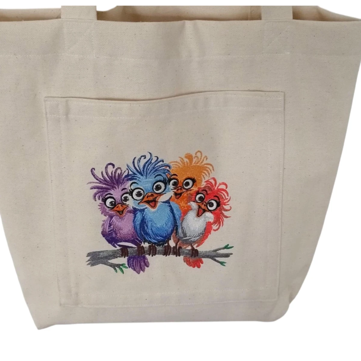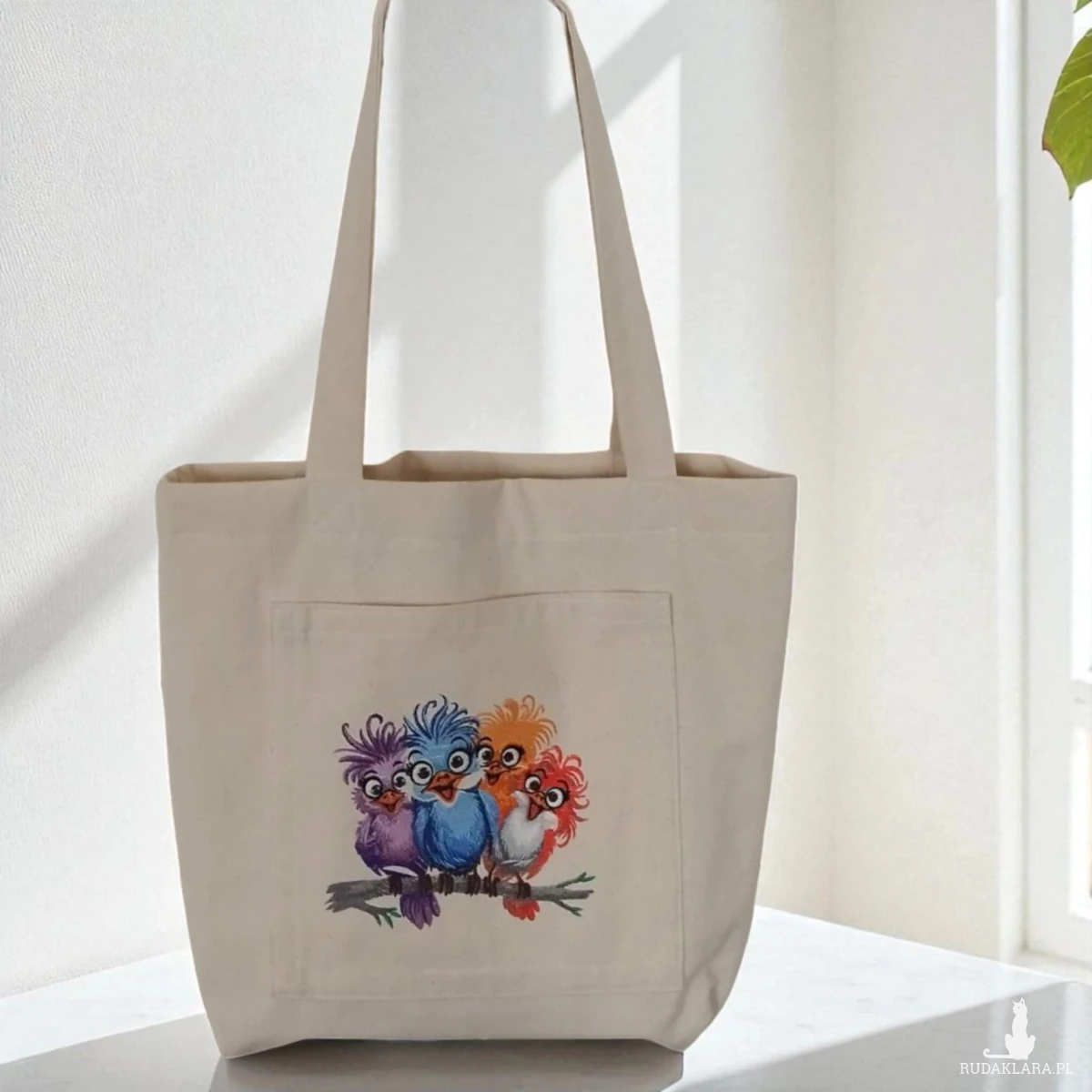 Przód torby z dużą kieszenią ozdobioną haftem. Dno torby poszerzone - tak aby mogła pomieścić wszystkie niezbędne drobiazgi i przydasie.