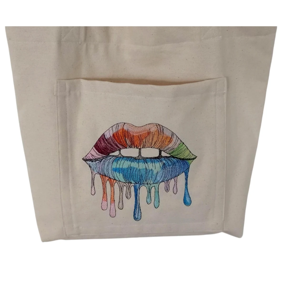 Przód torby z dużą kieszenią ozdobioną haftem. Dno torby poszerzone - tak aby mogła pomieścić wszystkie niezbędne drobiazgi i przydasie.