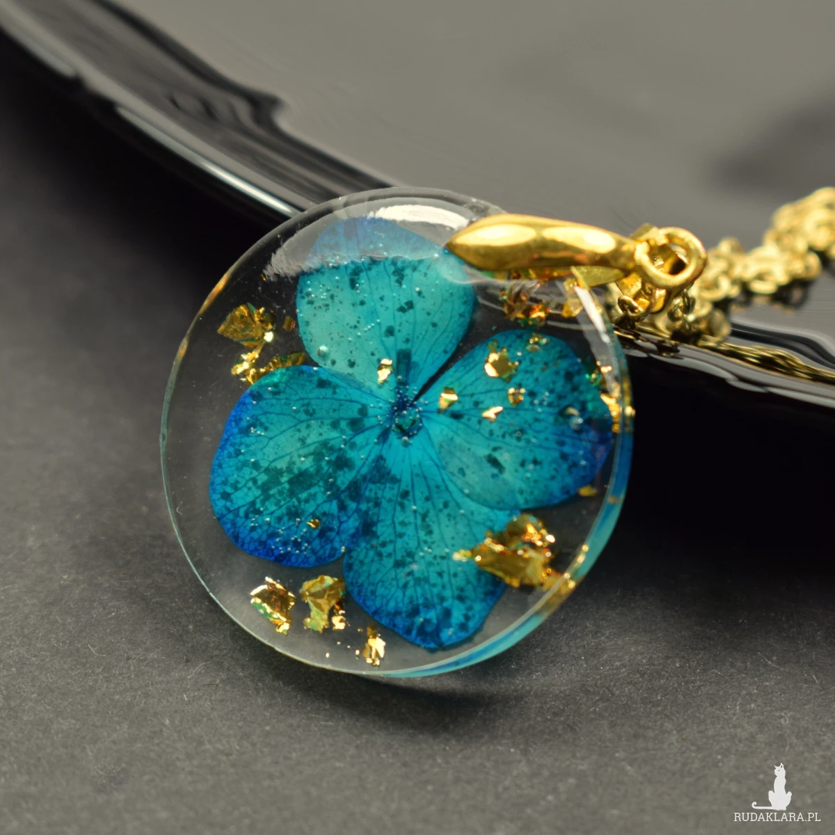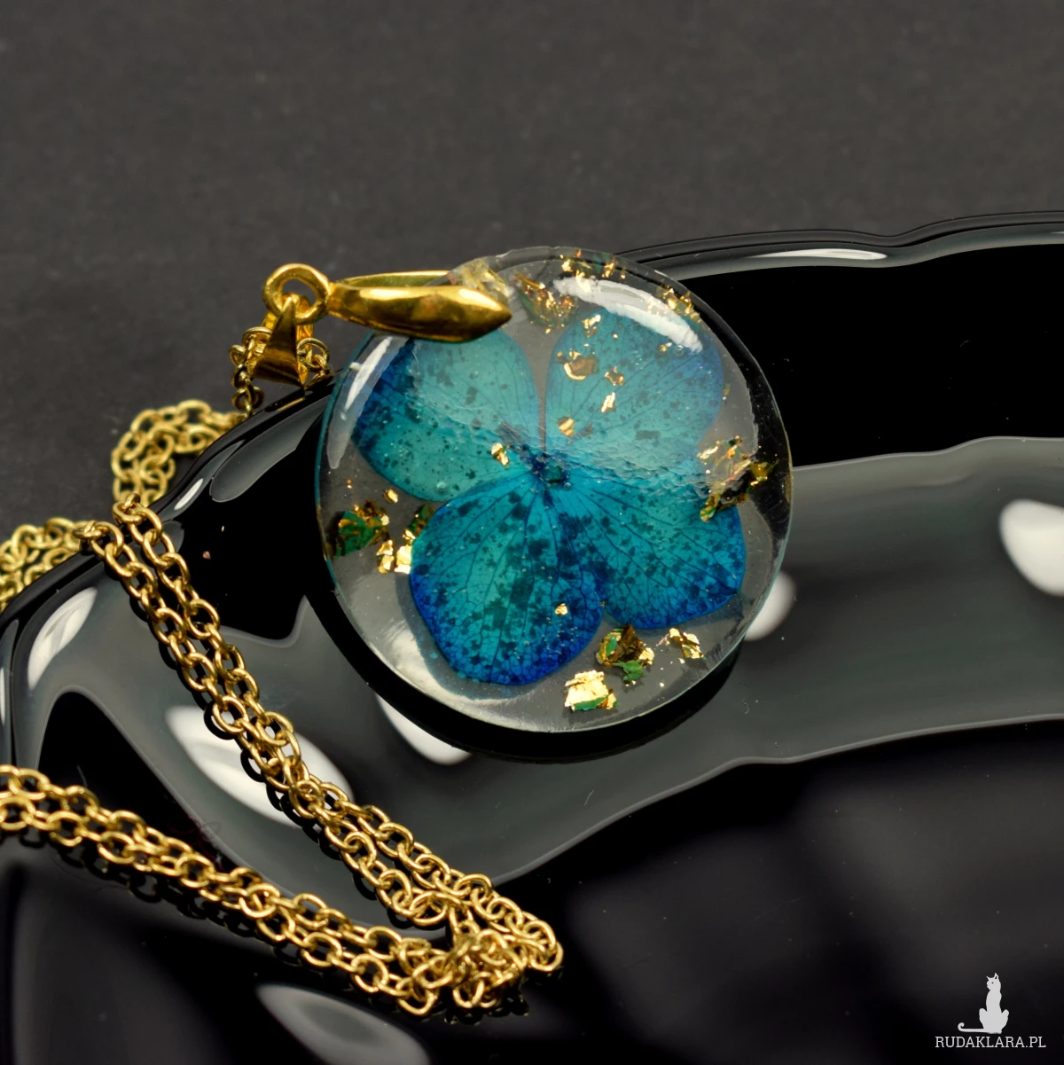 Subtelny, a zarazem wyjątkowy wisiorek z naturalnym kwiatem hortensji w