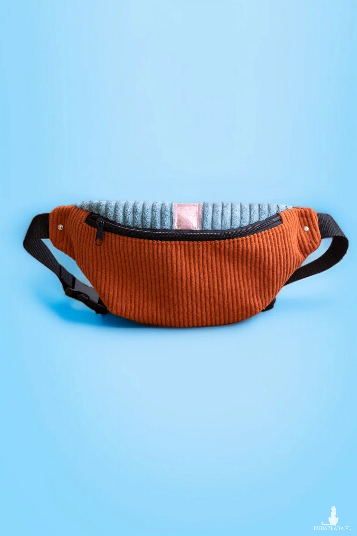 Duża nerka saszetka biodrowa wykonana z pomarańczowego sztruksu, rudej plecionki i niebieskiego grubego sztruksu. Na klapie wstawka z błyszczącej różowej taśmy.