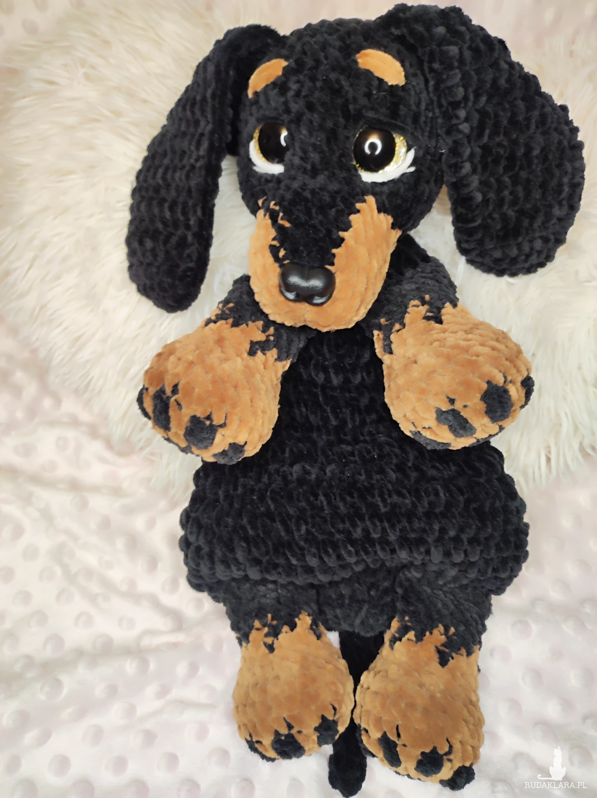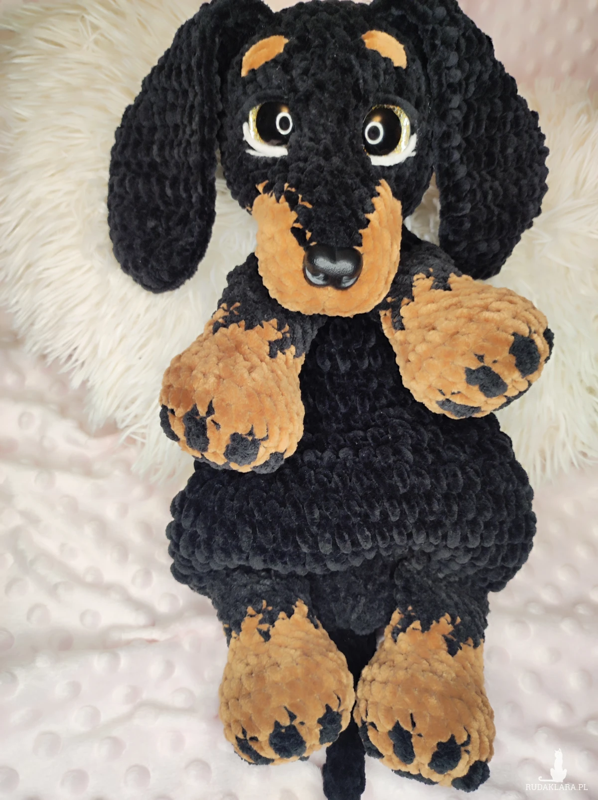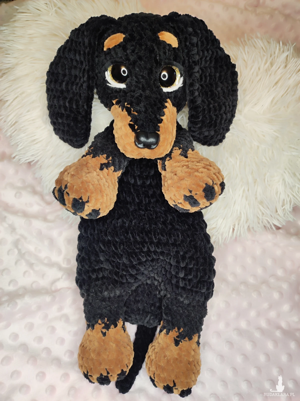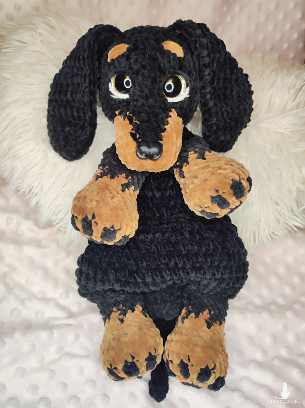Maskotka jamnik -komforter na szydełku.