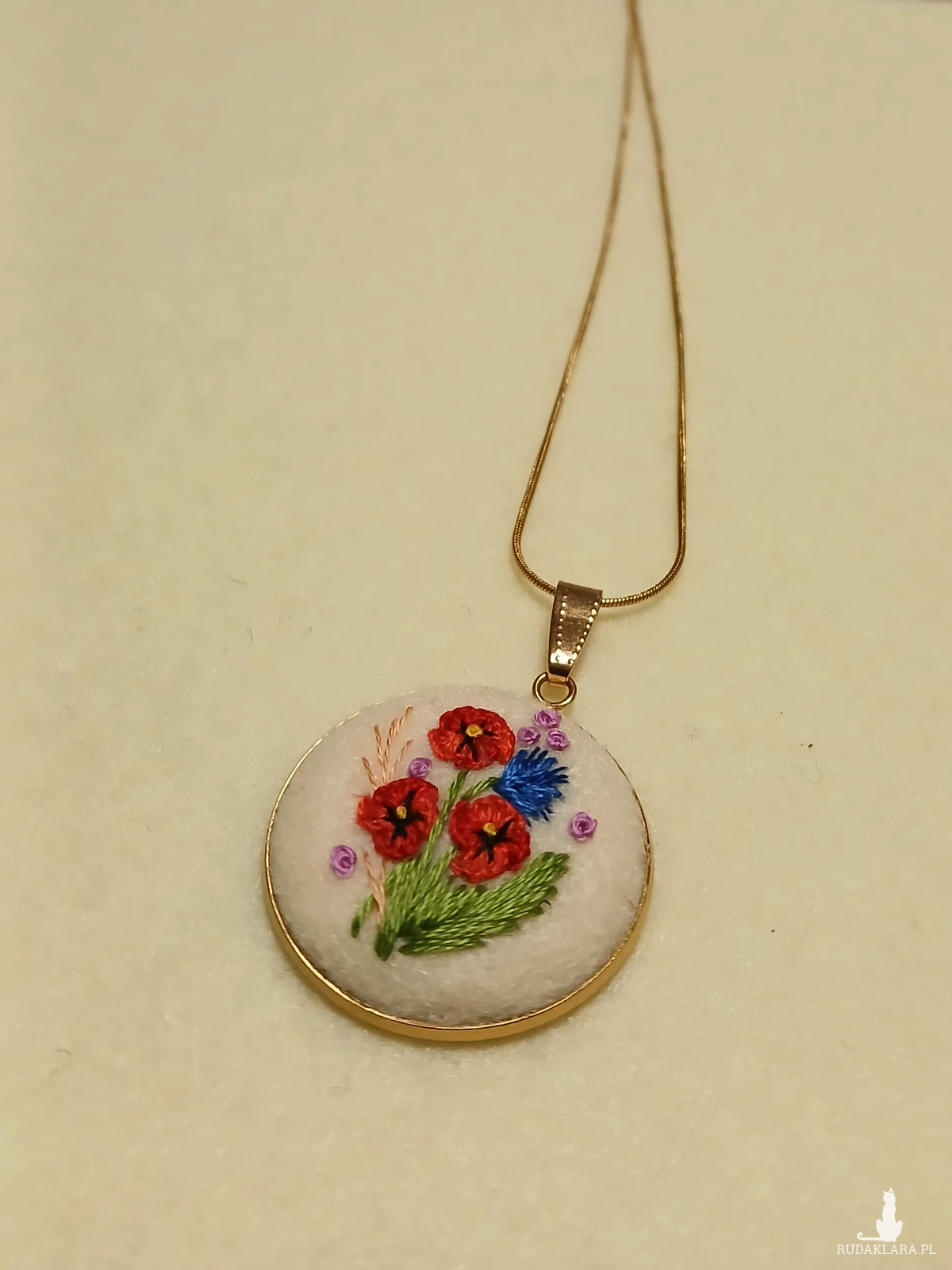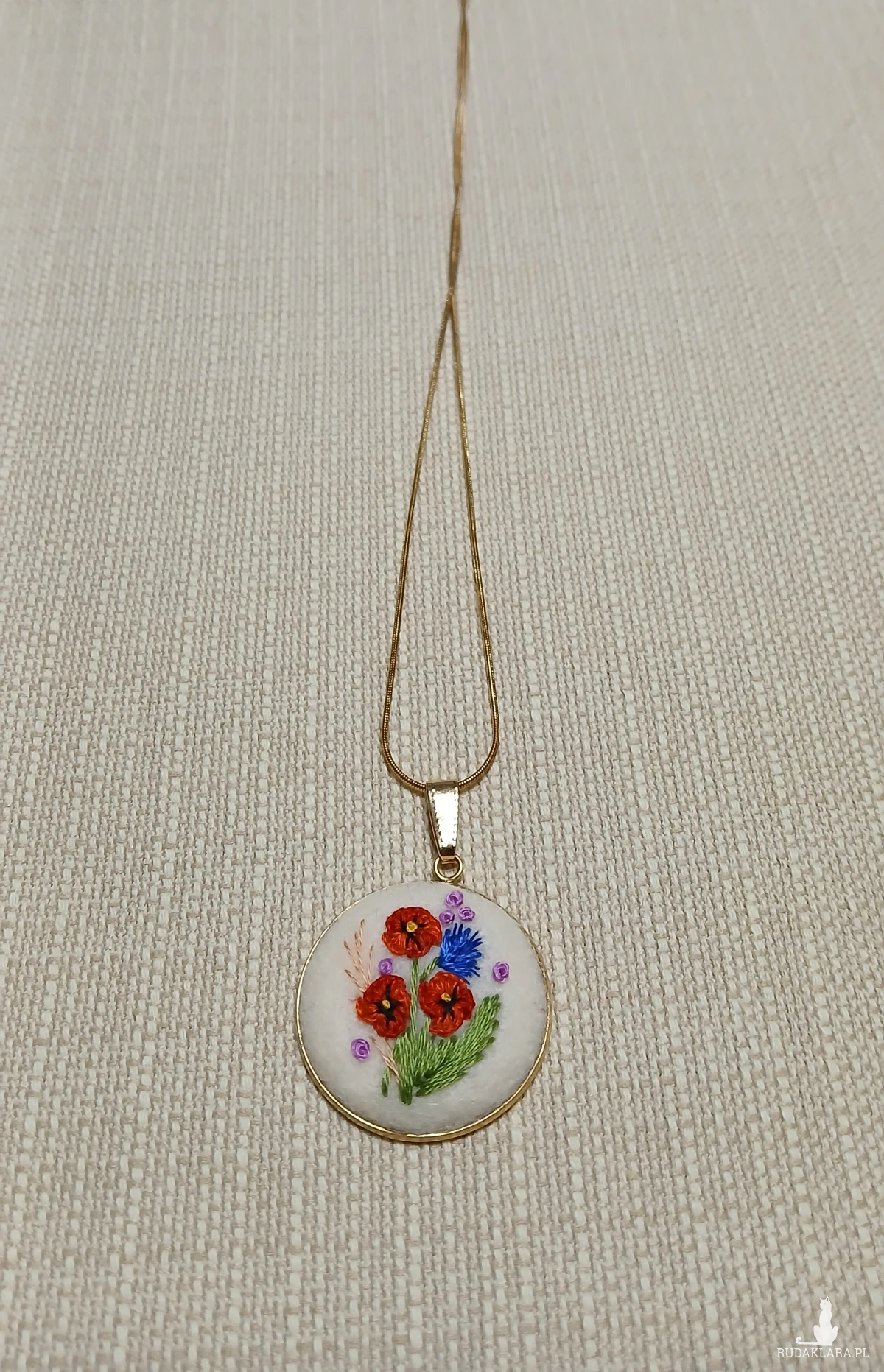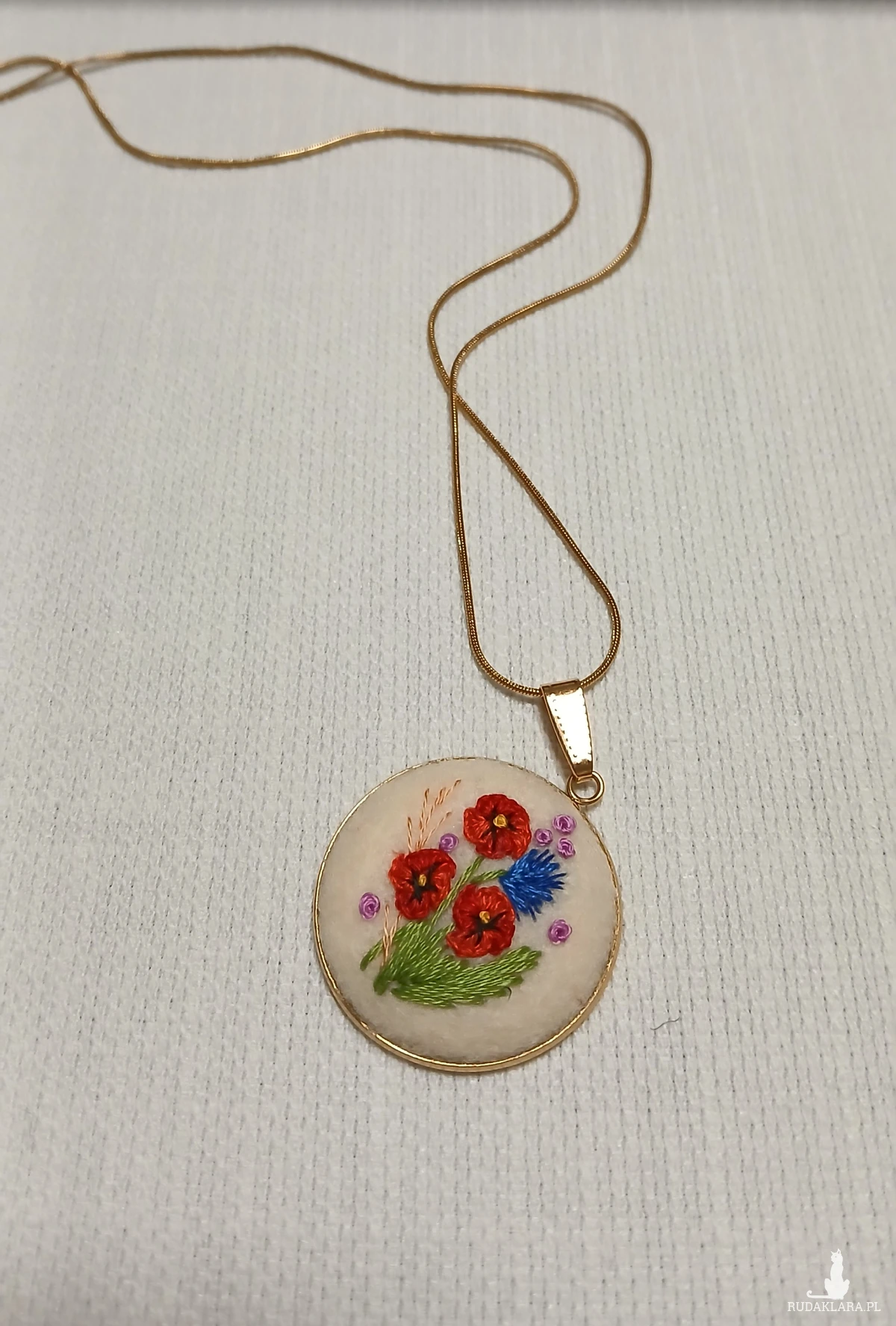 Perfekcyjnie dopracowany haft na filcu wykonałam polską bawełnianą muliną za pomocą igły. Jest on zabezpieczony impregnatem do tkanin ale po dłuższym użytkowaniu można go odświeżyć przy pomocy delikatnego mydła i letniej wody.