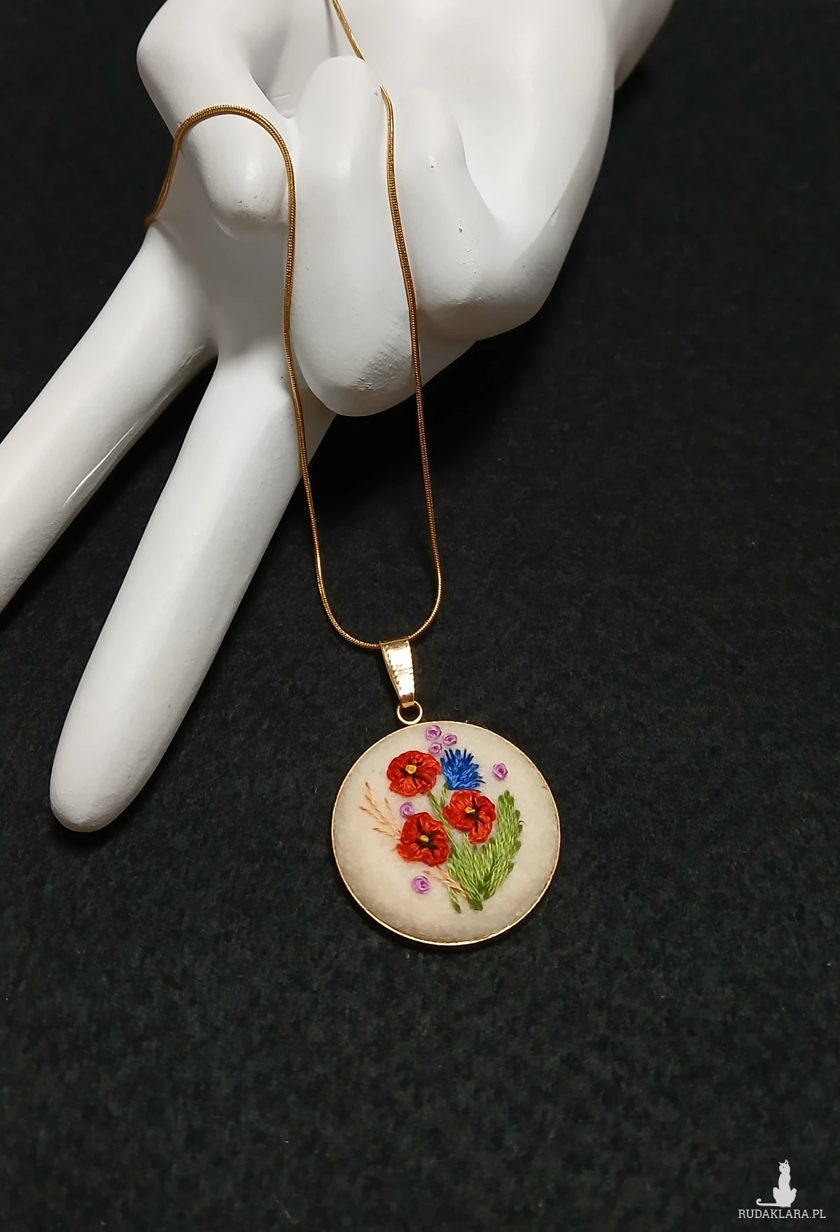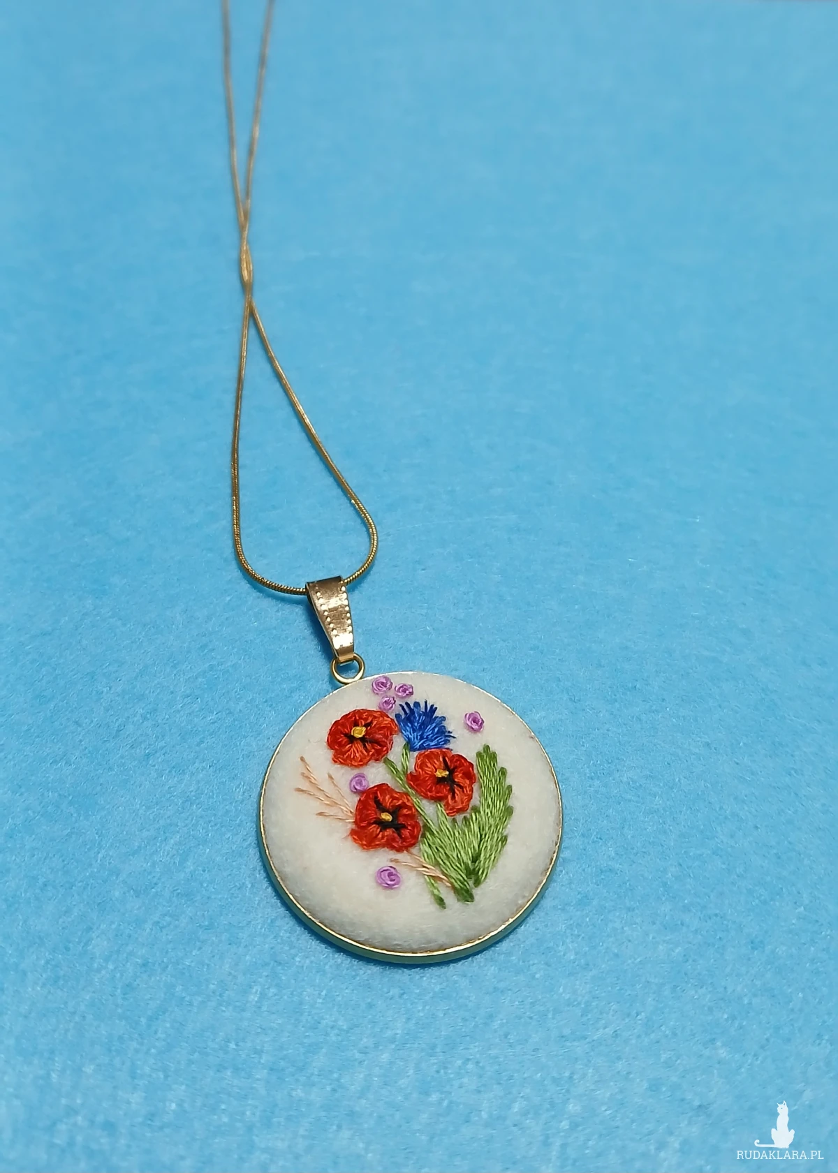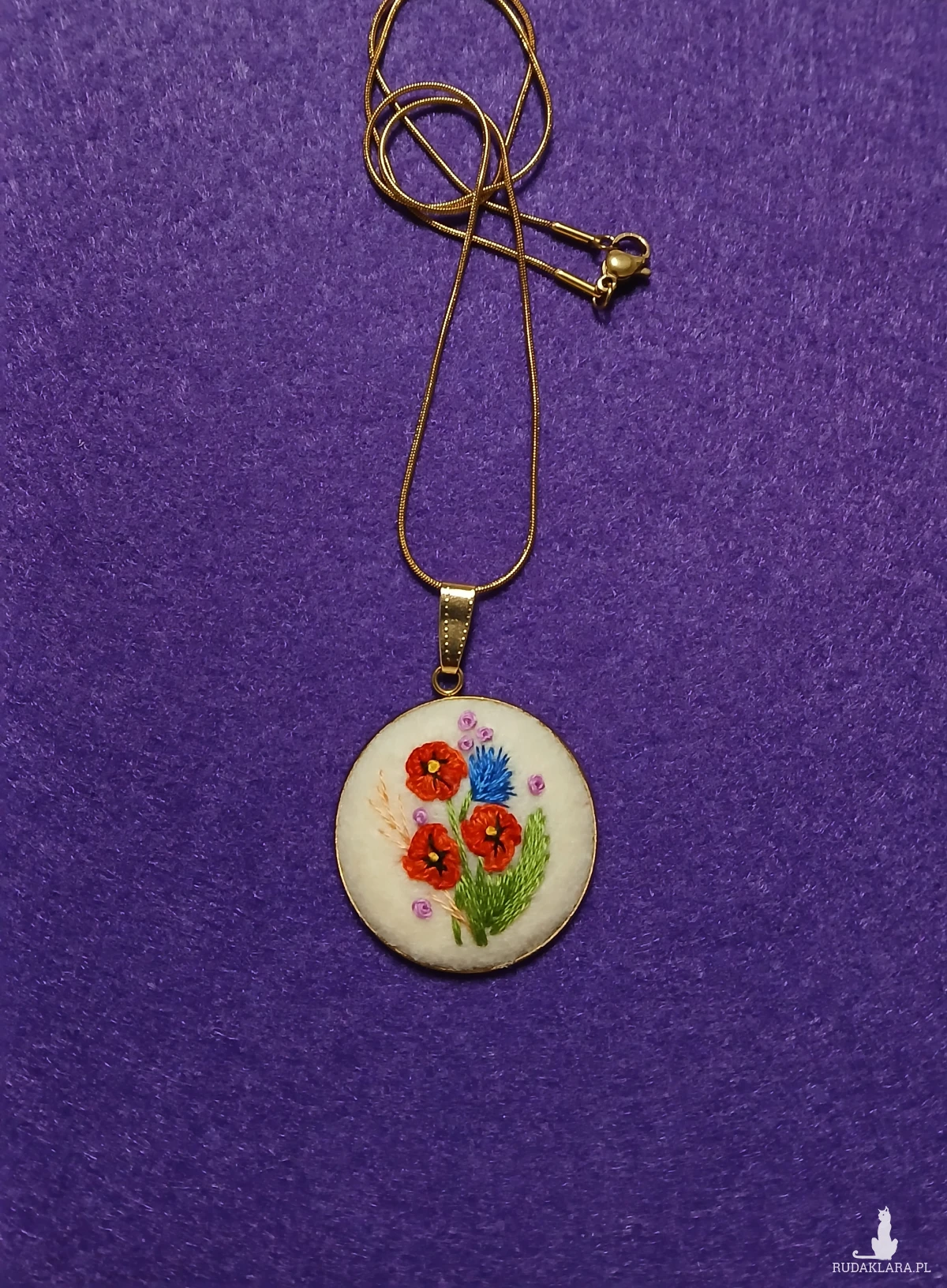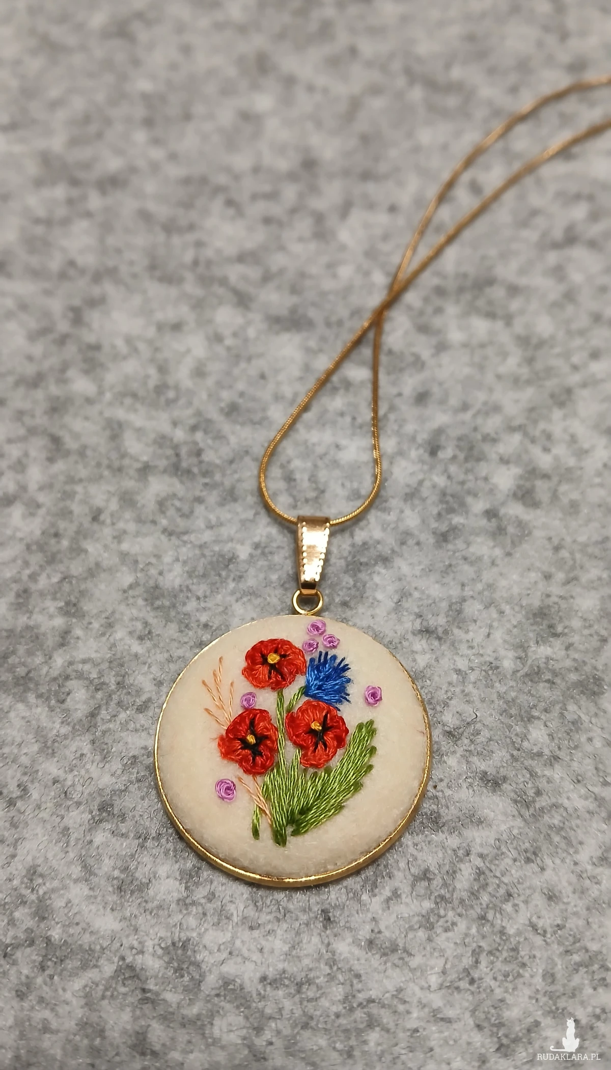 Perfekcyjnie dopracowany haft na filcu wykonałam polską bawełnianą muliną za pomocą igły. Jest on zabezpieczony impregnatem do tkanin ale po dłuższym użytkowaniu można go odświeżyć przy pomocy delikatnego mydła i letniej wody.