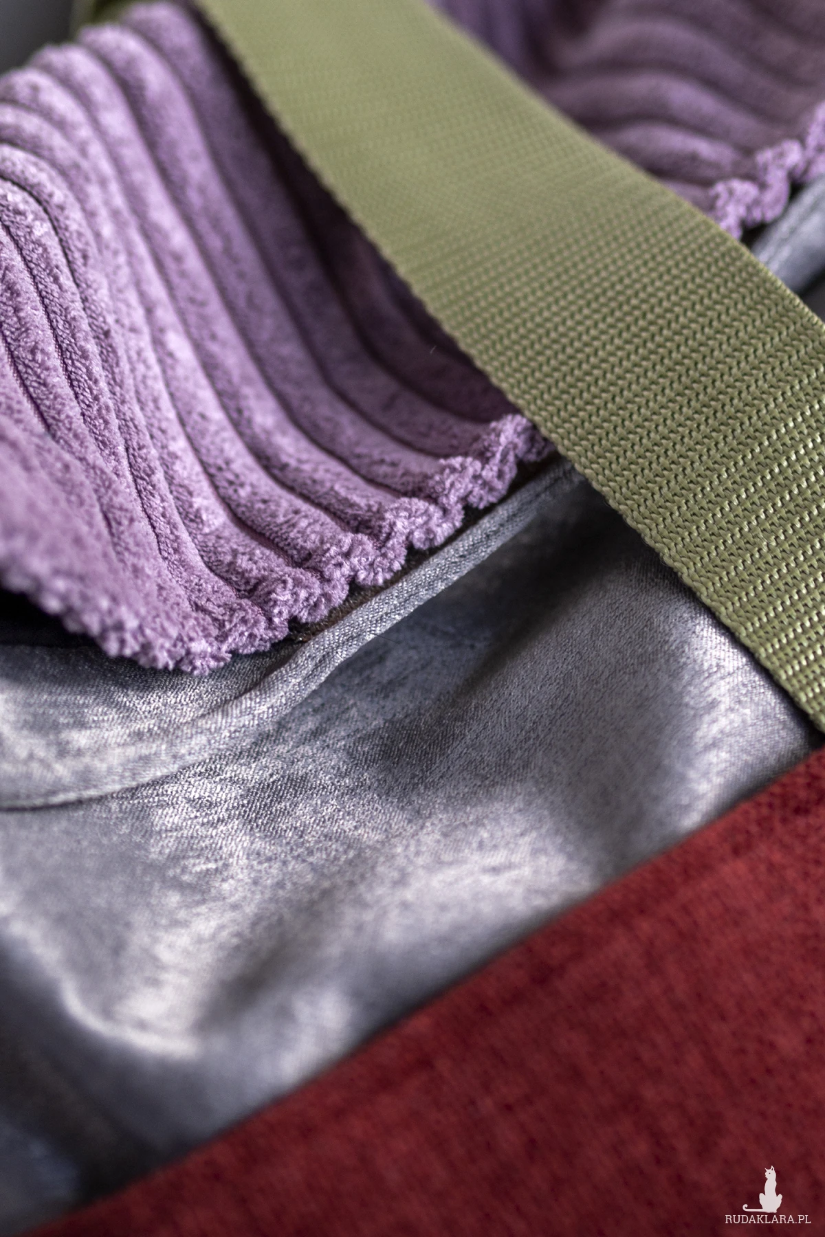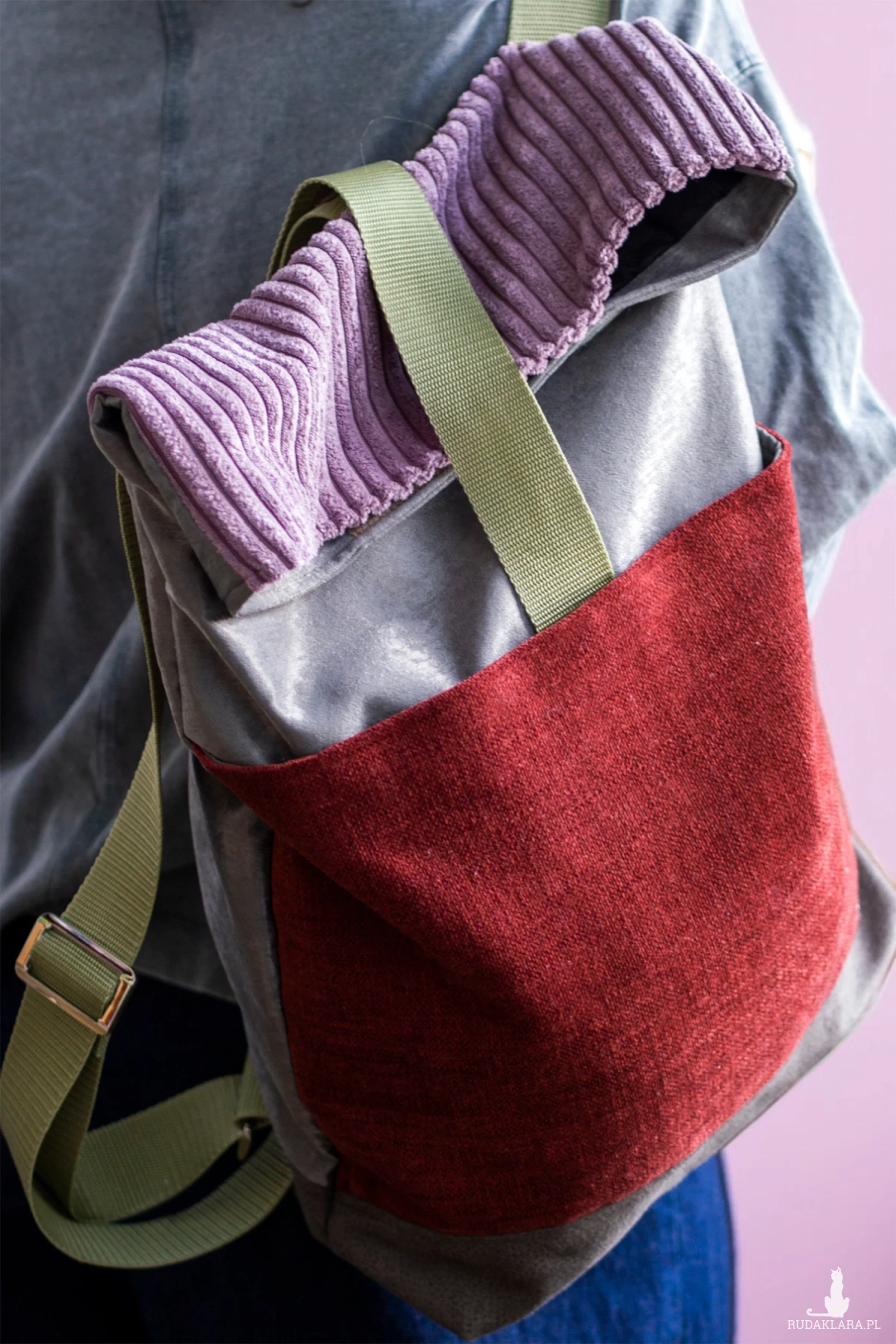 Duży, damski plecak miejski składany i zapinany na rzep wykonany z kilku rodzajów tkanin.