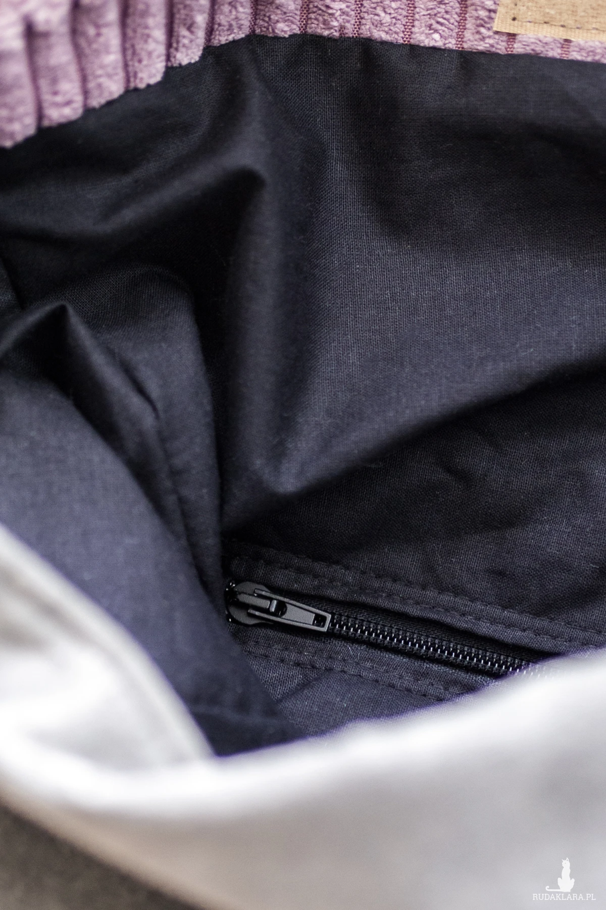 Regulowane paski. W środku czarna, bawełniana podszewka oraz mała kieszonka na suwak.