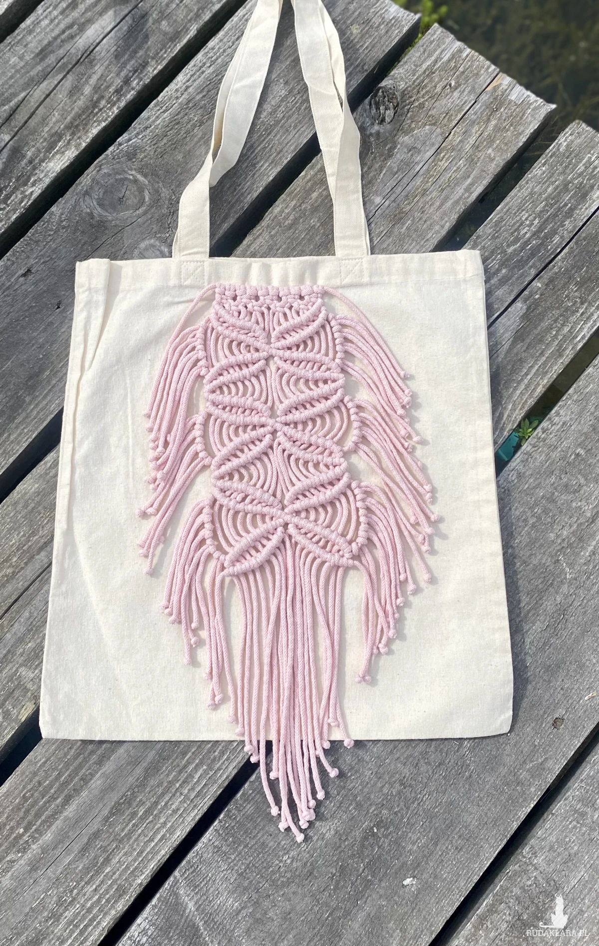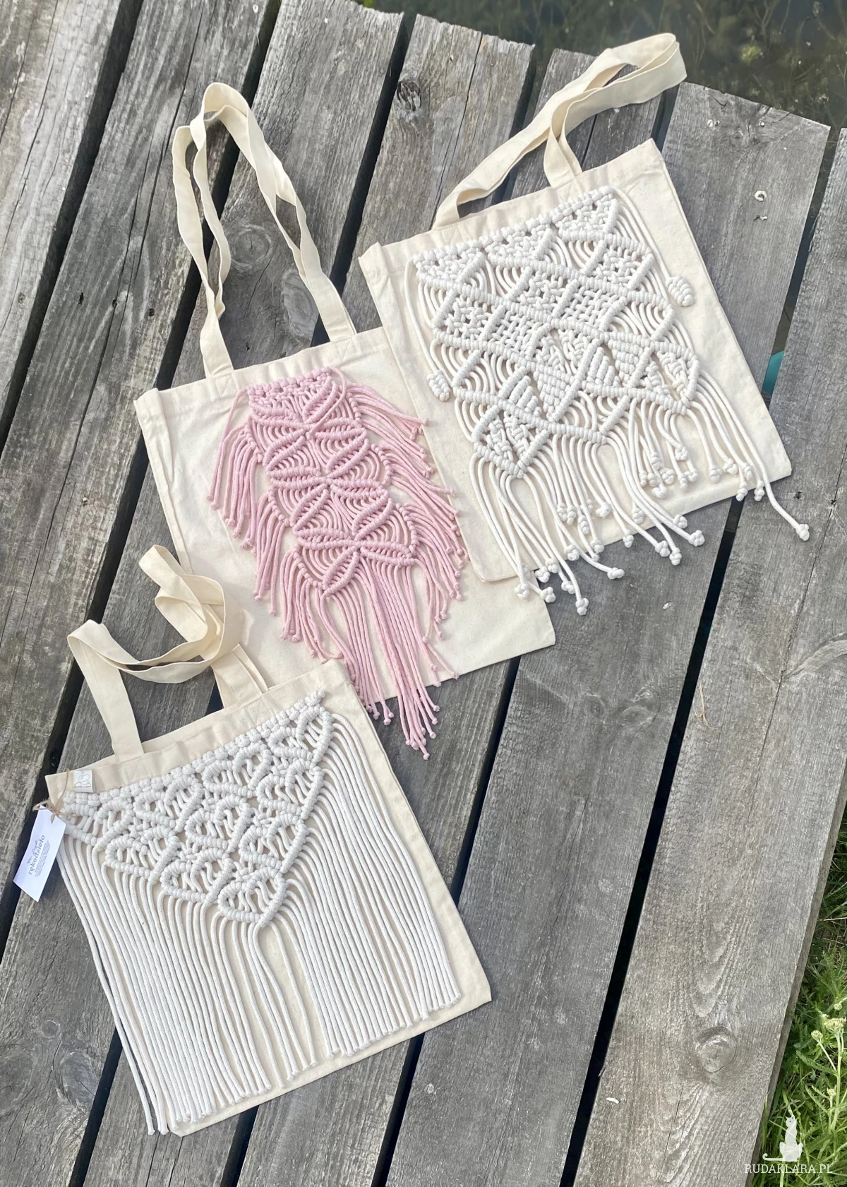 Naszyta makrama  jest wykonana ze sznurka bawełnianego i dodatkowo zaimpregnowana preparatem zabezpieczającym przed brudem. Po wypraniu można torbę ponownie zaimpregnować impregnatem do tkanin.